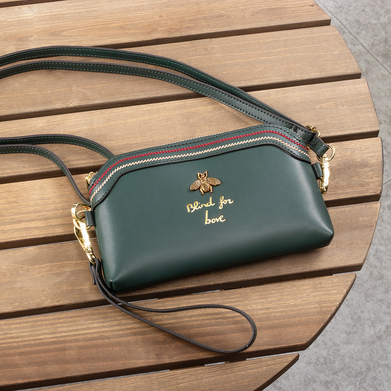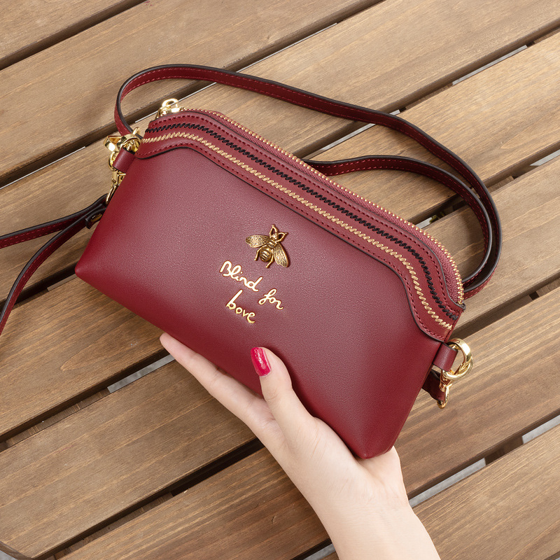 【真皮復古收納斜背包】高檔牛皮真皮酒紅純色車縫線小蜜蜂裝飾氣質女手拿包斜背包
