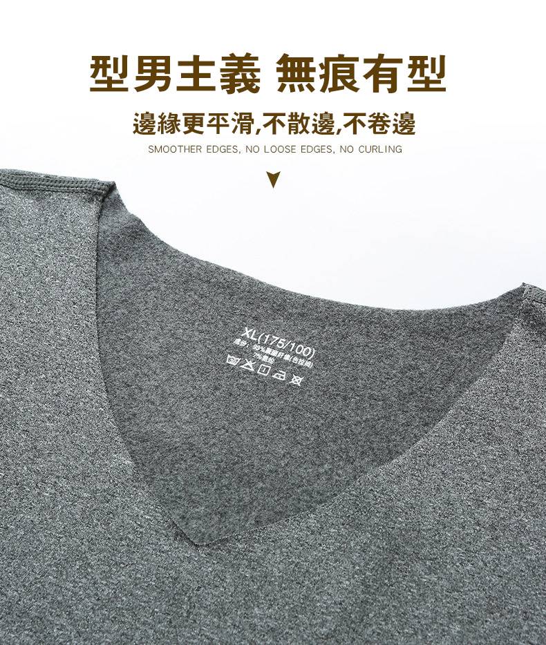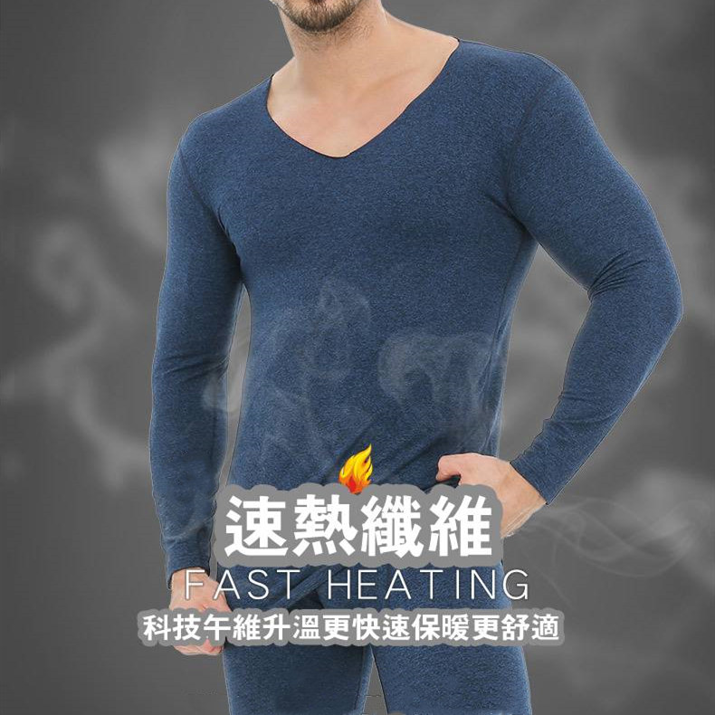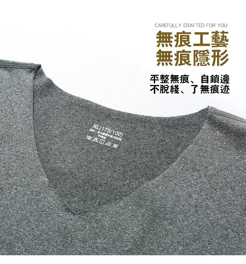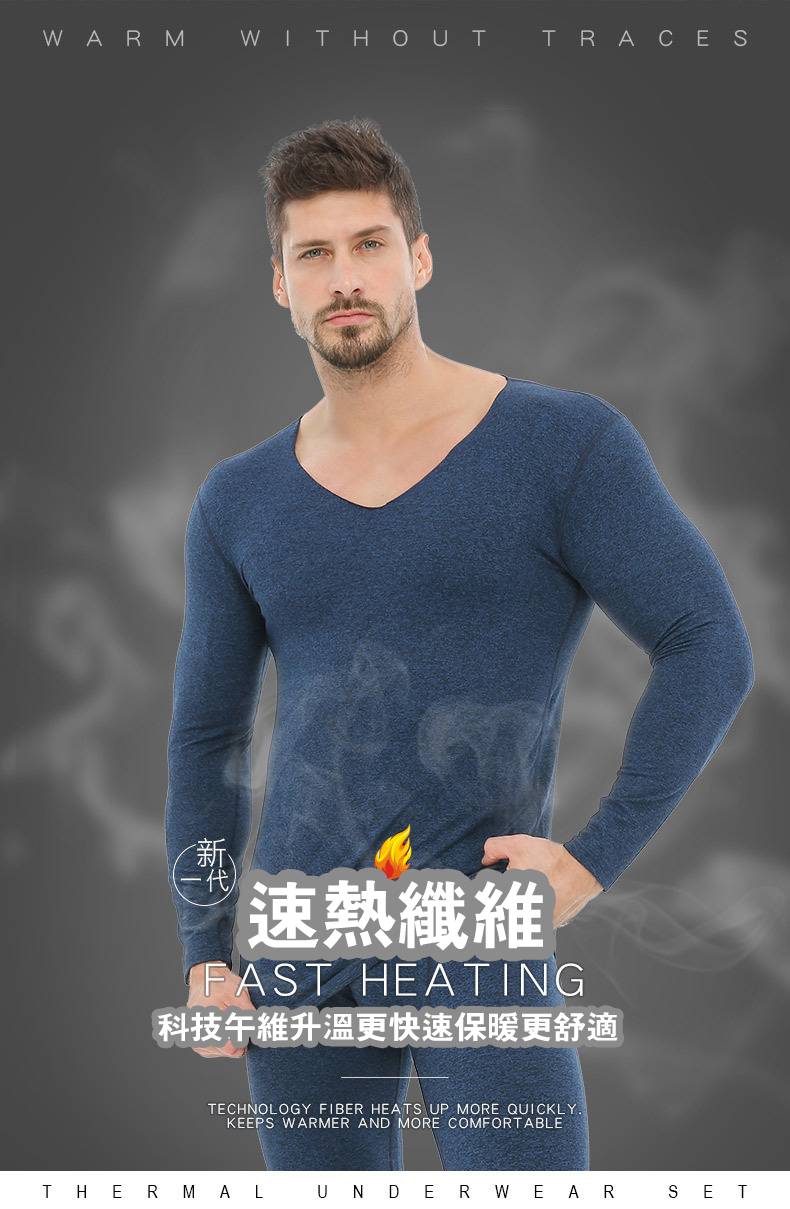 【隱形速熱發熱衣套組】【無痕型男V領】【衣+褲】經典版純色速熱纖維無痕V領男保暖內衣發熱衣套組