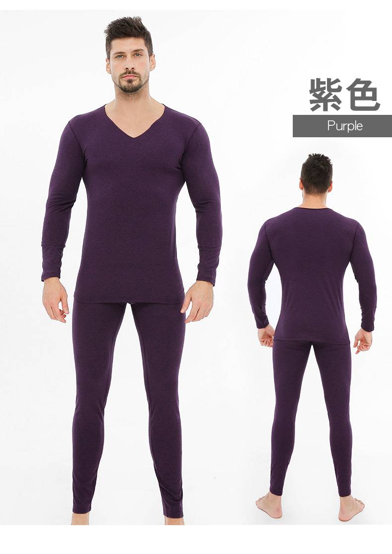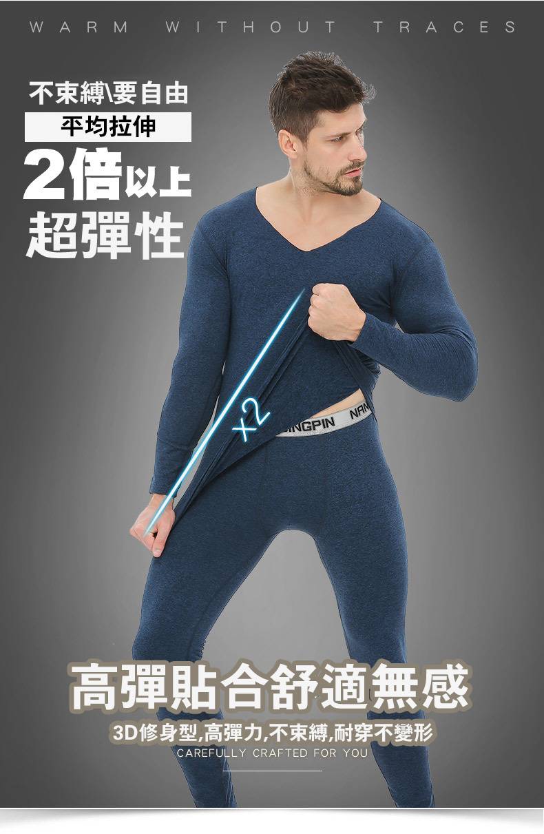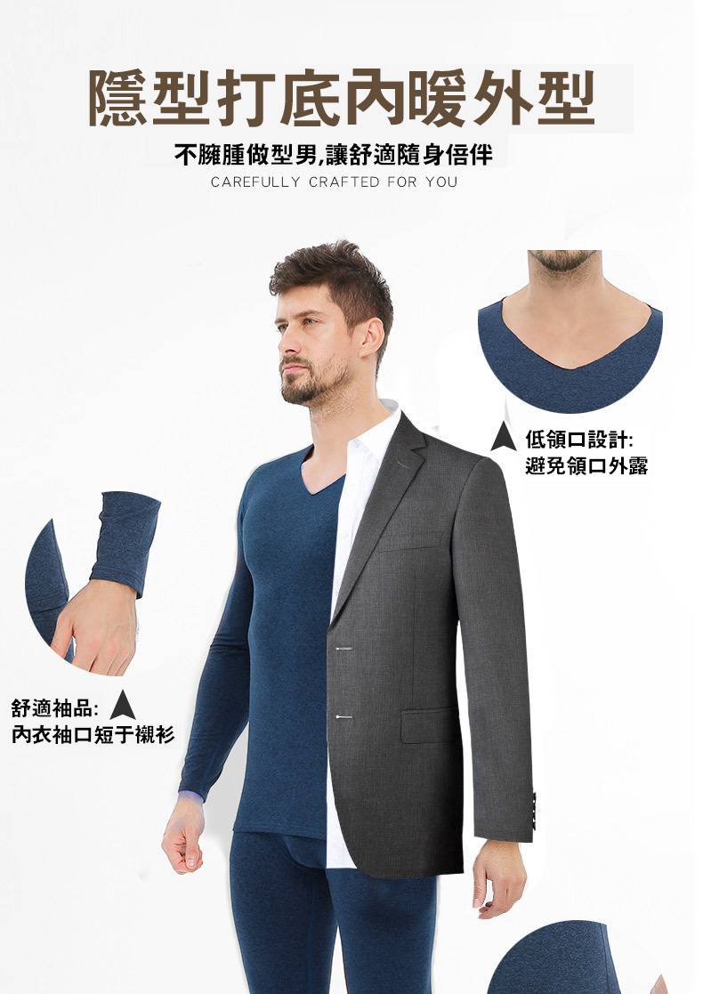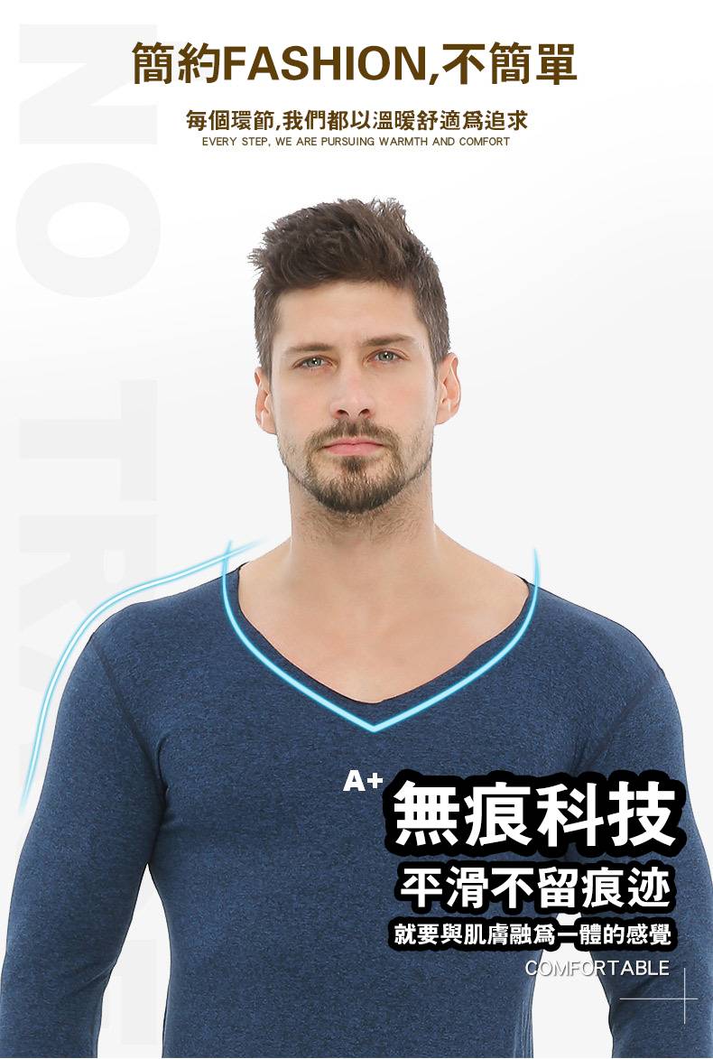 【隱形速熱發熱衣套組】【無痕型男V領】【衣+褲】經典版純色速熱纖維無痕V領男保暖內衣發熱衣套組