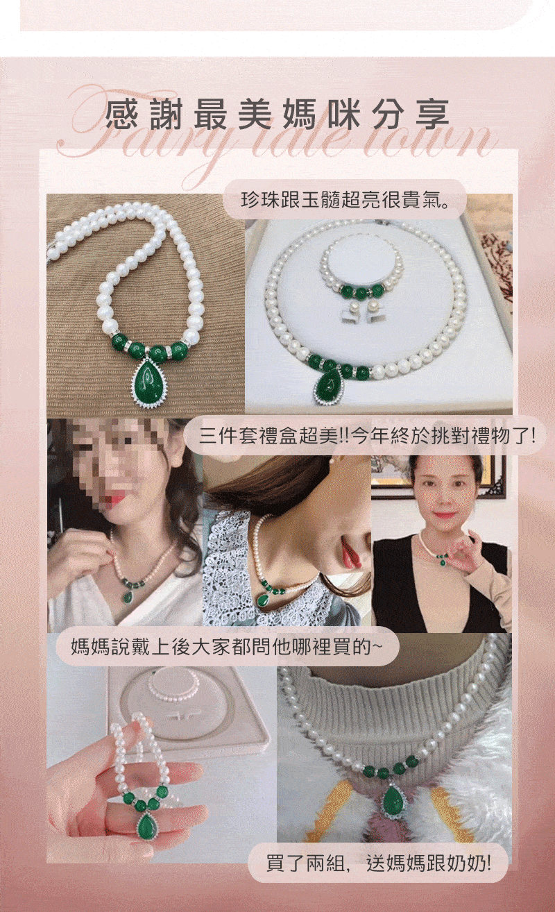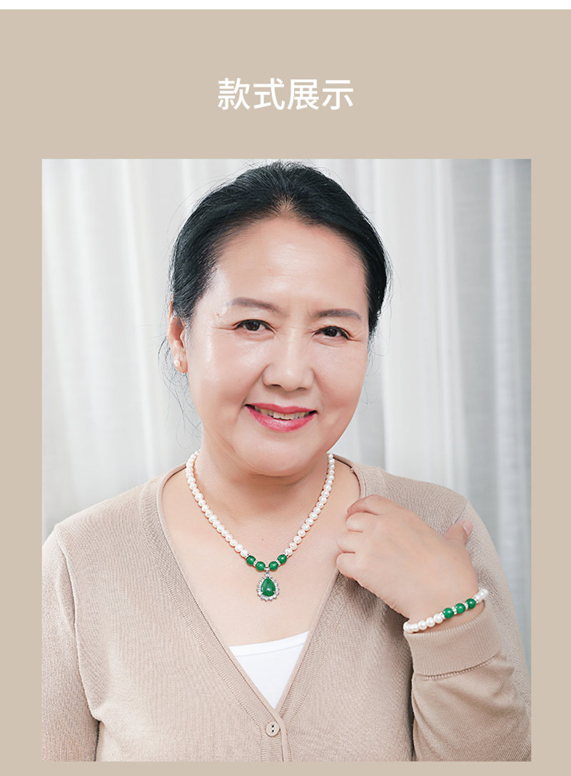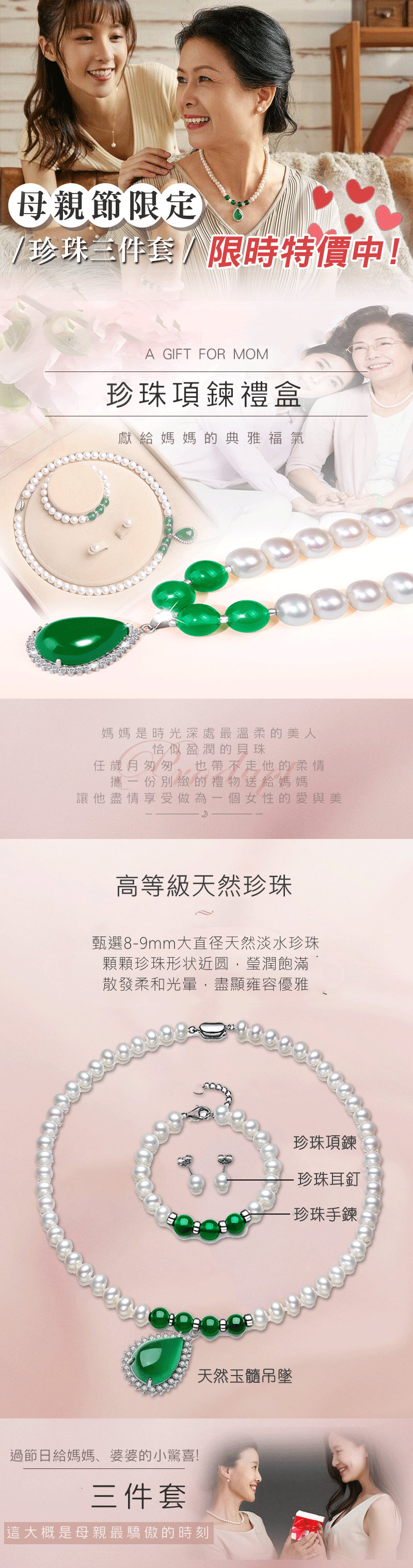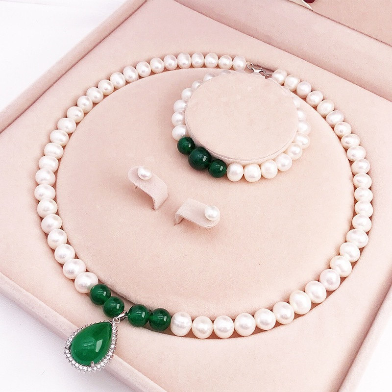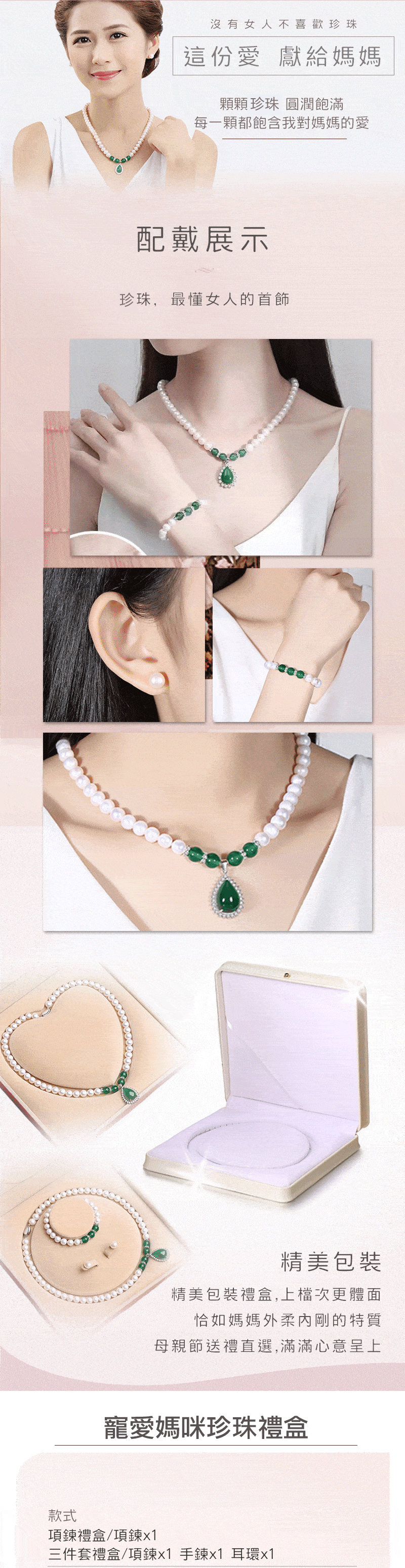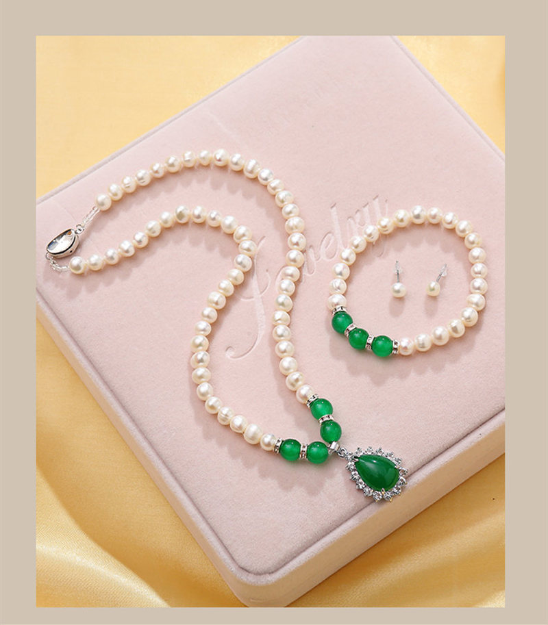 天然珍珠項鍊手鍊耳墜三件禮盒組 | 高檔近圓珍珠配綠玉髓 | 925純銀不傷膚 | 超合適母親節禮物送媽媽高檔珍珠首飾項鍊三件組禮盒