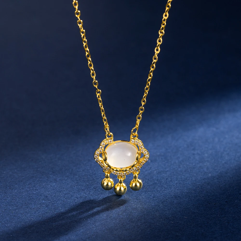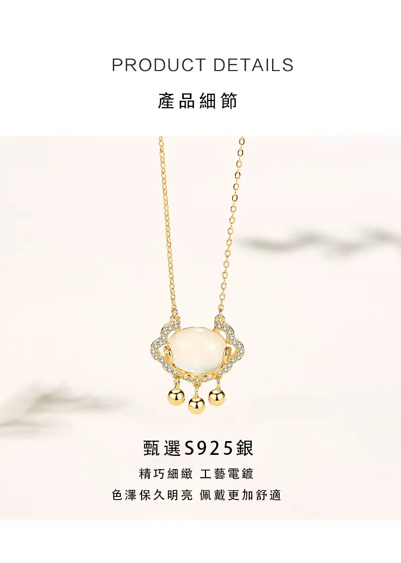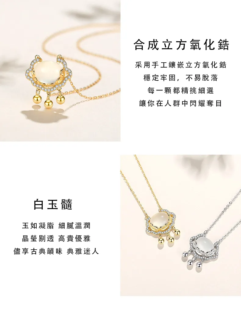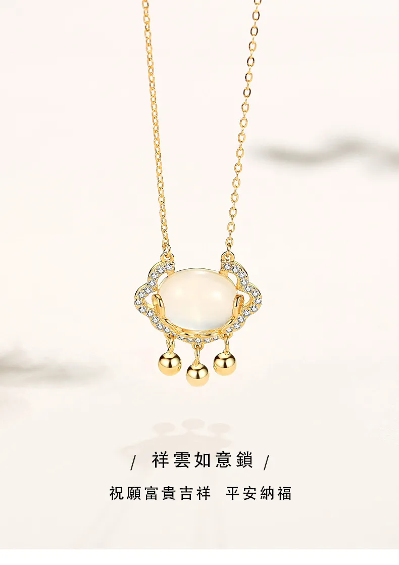 祥雲如意平安鎖項鍊 | S925純銀鍍金鑲鑽 | 天然白玉髓 | 鏡面拋光 | 吉祥如意送女生禮物平安鎖守護鎖骨鍊女生項鍊