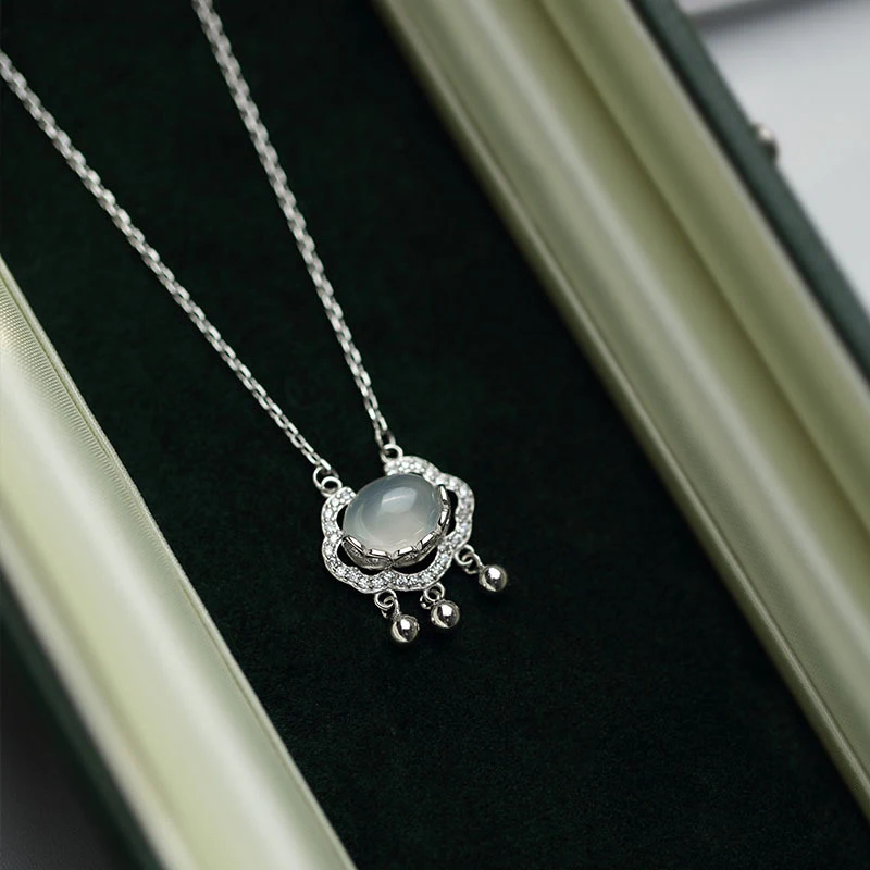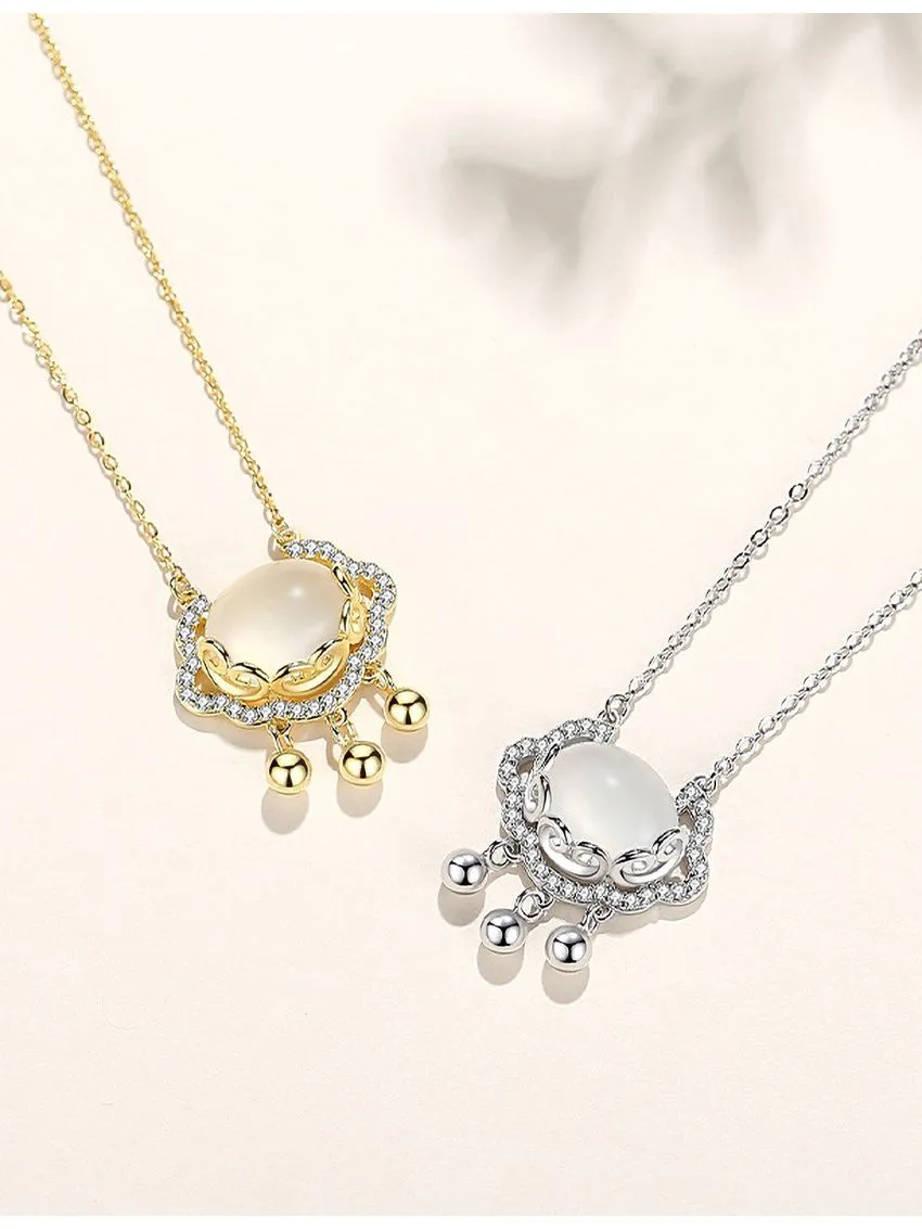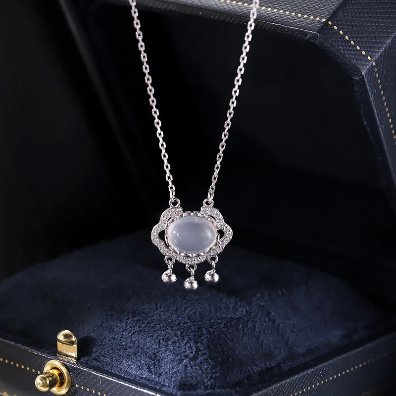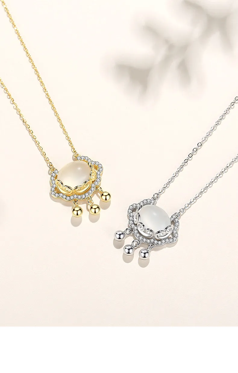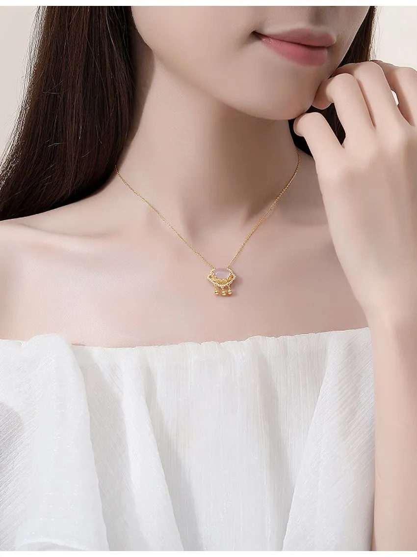 祥雲如意平安鎖項鍊 | S925純銀鍍金鑲鑽 | 天然白玉髓 | 鏡面拋光 | 吉祥如意送女生禮物平安鎖守護鎖骨鍊女生項鍊