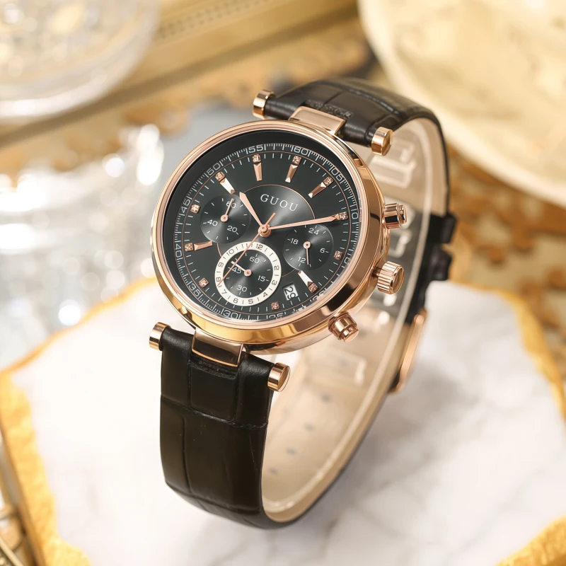 女錶・時序之花 | 真三眼計時機芯 | 精緻玫金錶殼 | 小牛皮錶帶 | 鑲鑽刻度 | 日曆視窗 | 30米防水 | GUOU經典設計女神手錶