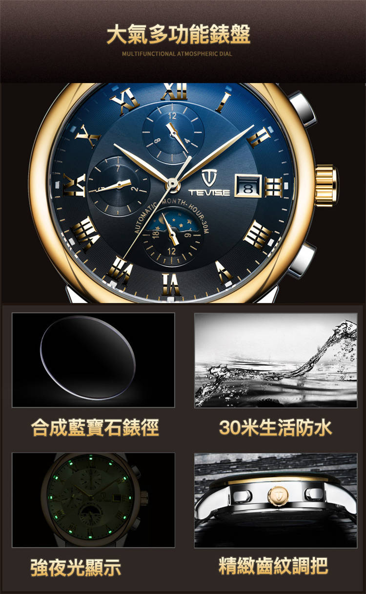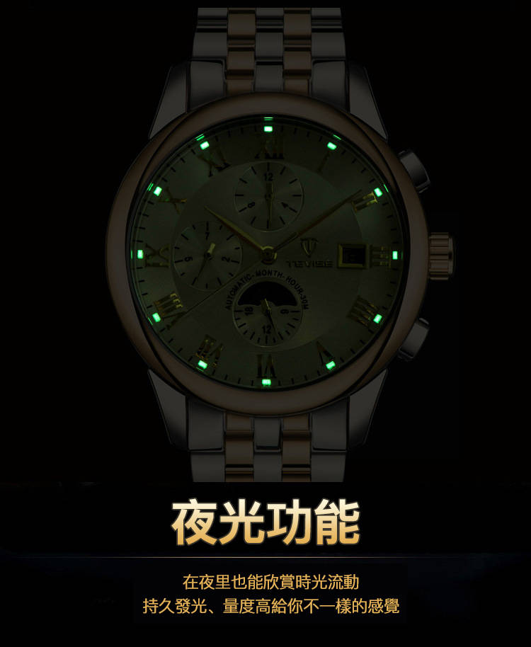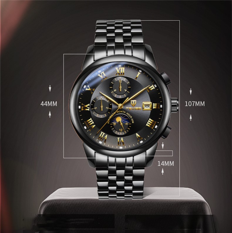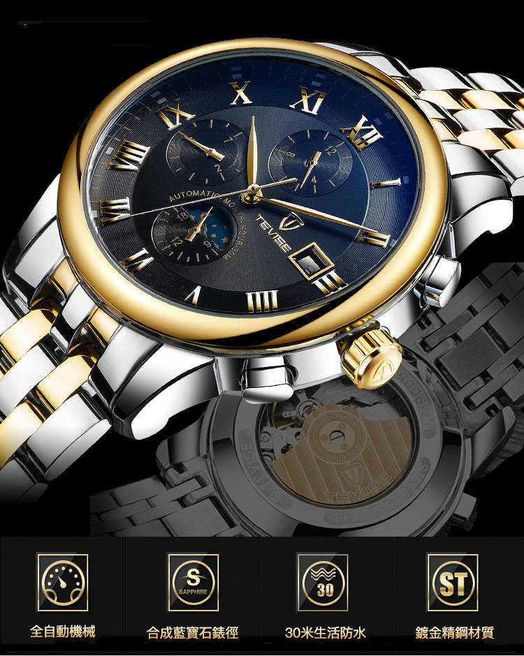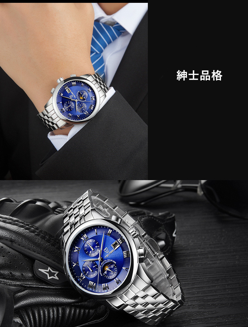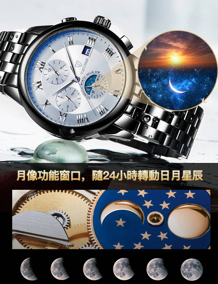 【騎士精神】【萬元級全自動機械錶】【星辰月相】【三眼計時】【日曆】【防水】黑騎士全功能瑞士工藝月相三眼精鋼全自動上鍊機械錶