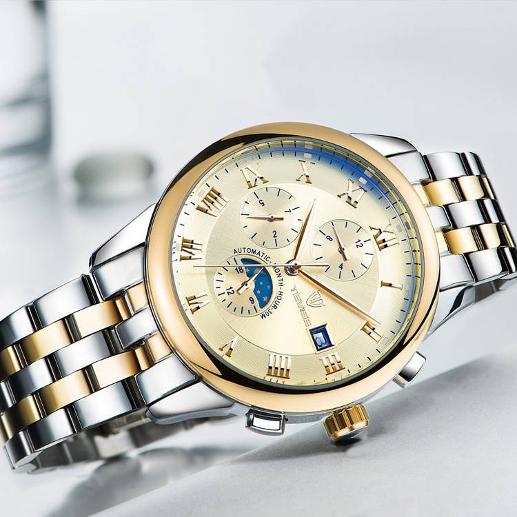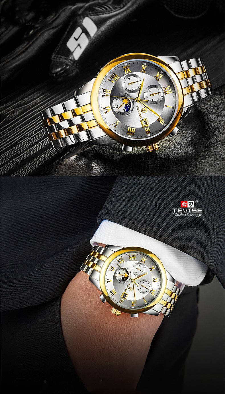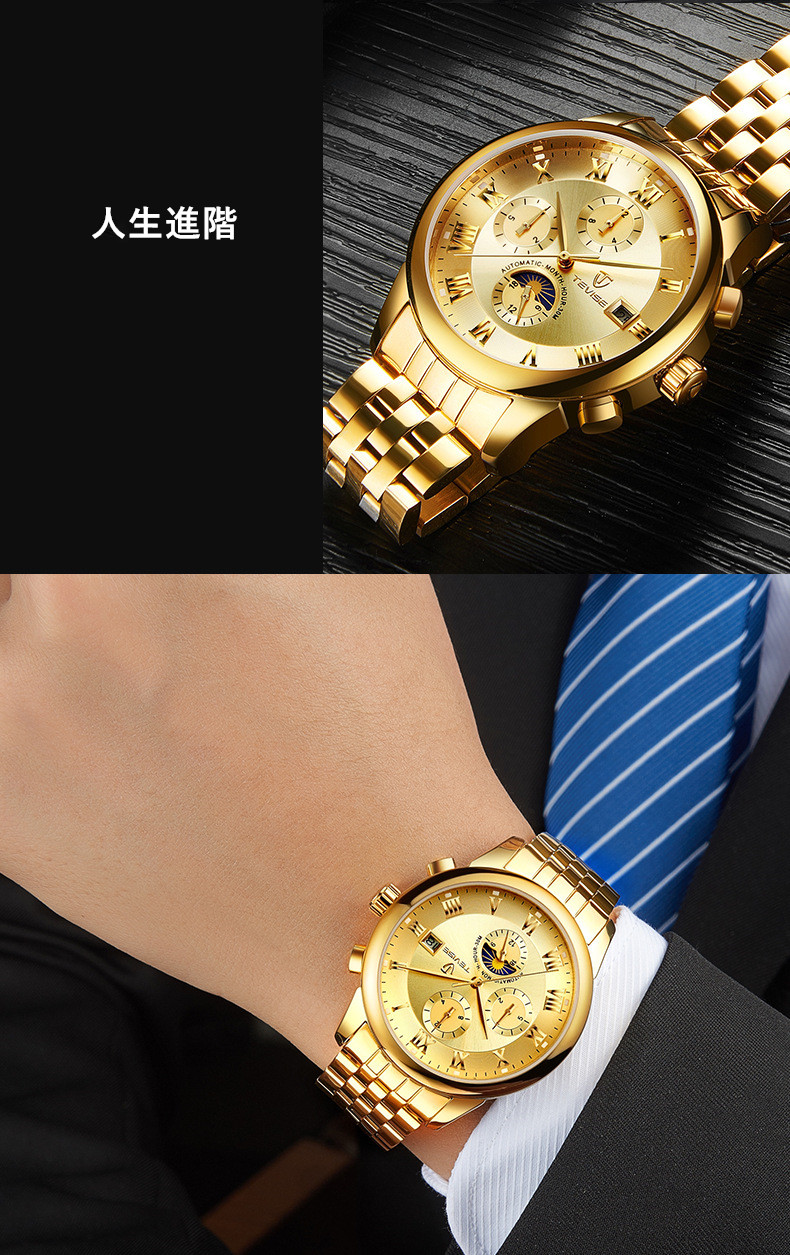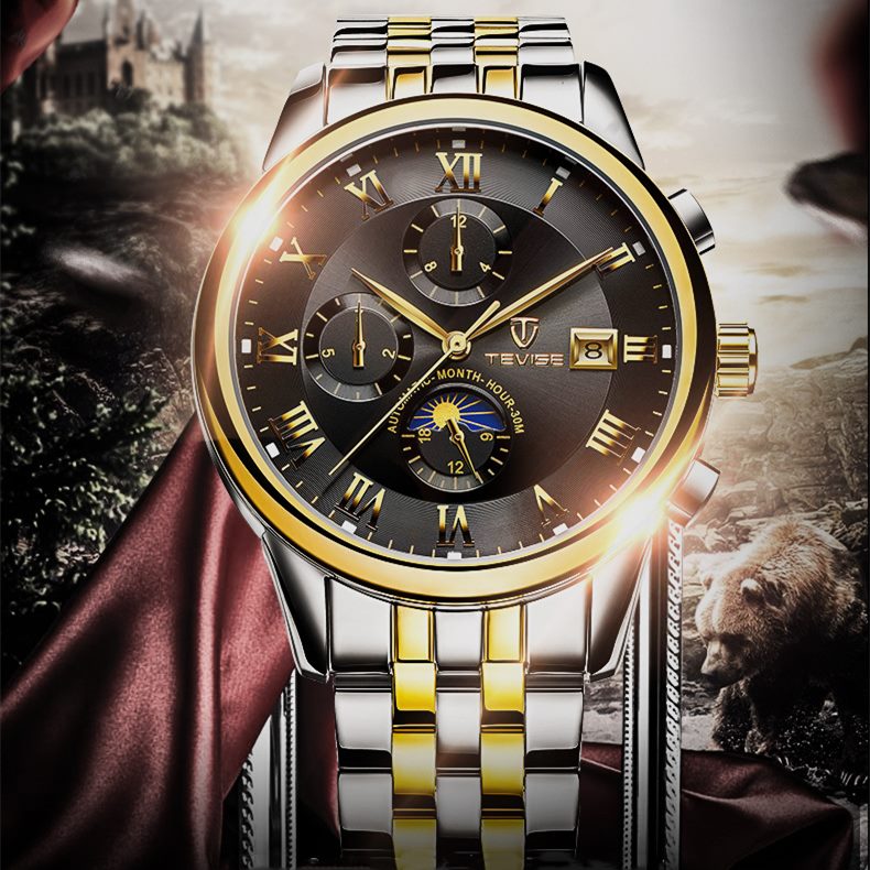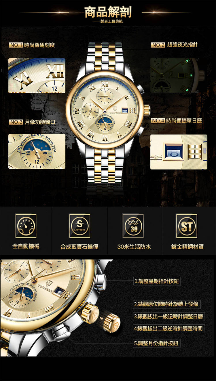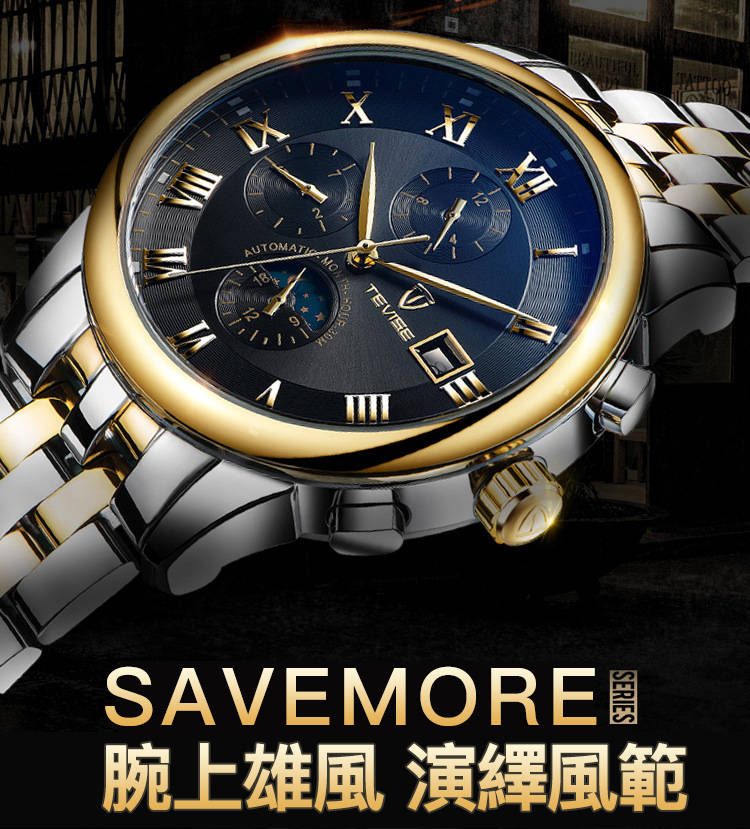 【騎士精神】【萬元級全自動機械錶】【星辰月相】【三眼計時】【日曆】【防水】黑騎士全功能瑞士工藝月相三眼精鋼全自動上鍊機械錶