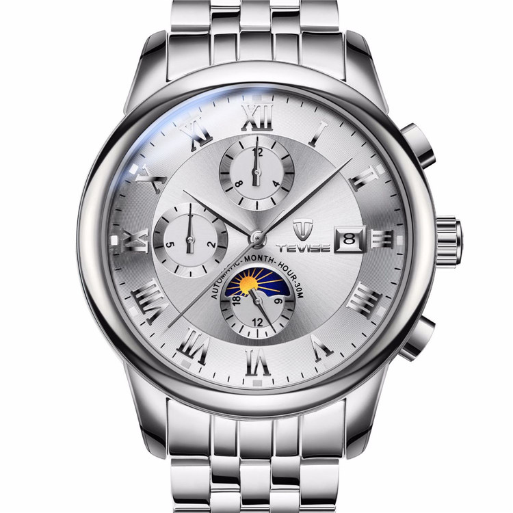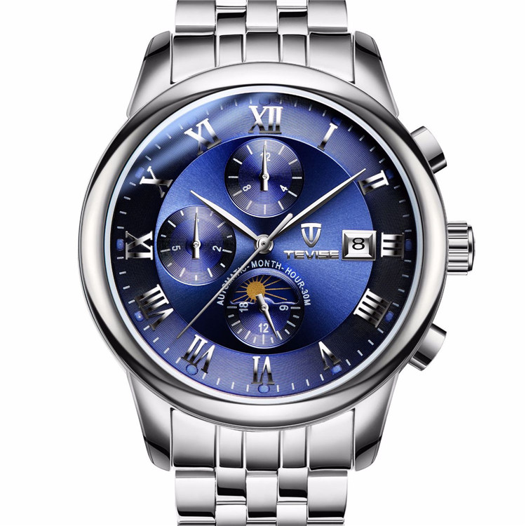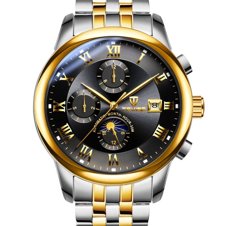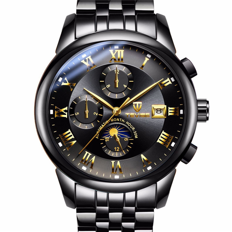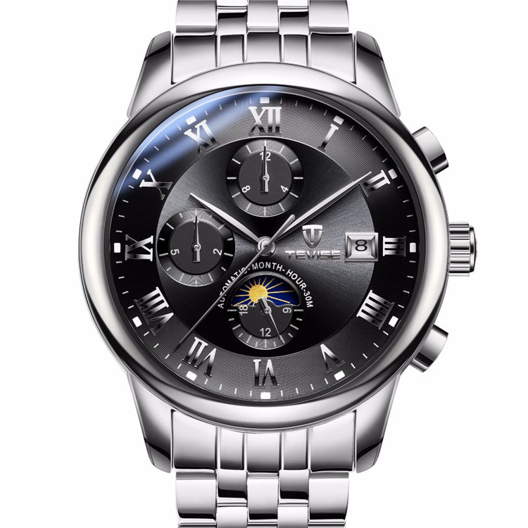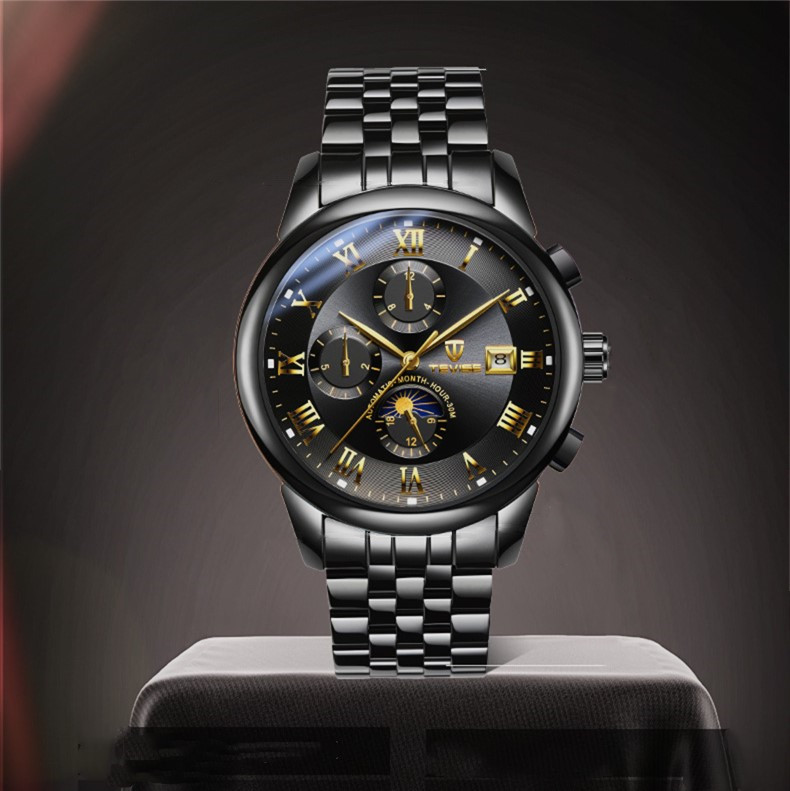 【騎士精神】【萬元級全自動機械錶】【星辰月相】【三眼計時】【日曆】【防水】黑騎士全功能瑞士工藝月相三眼精鋼全自動上鍊機械錶
