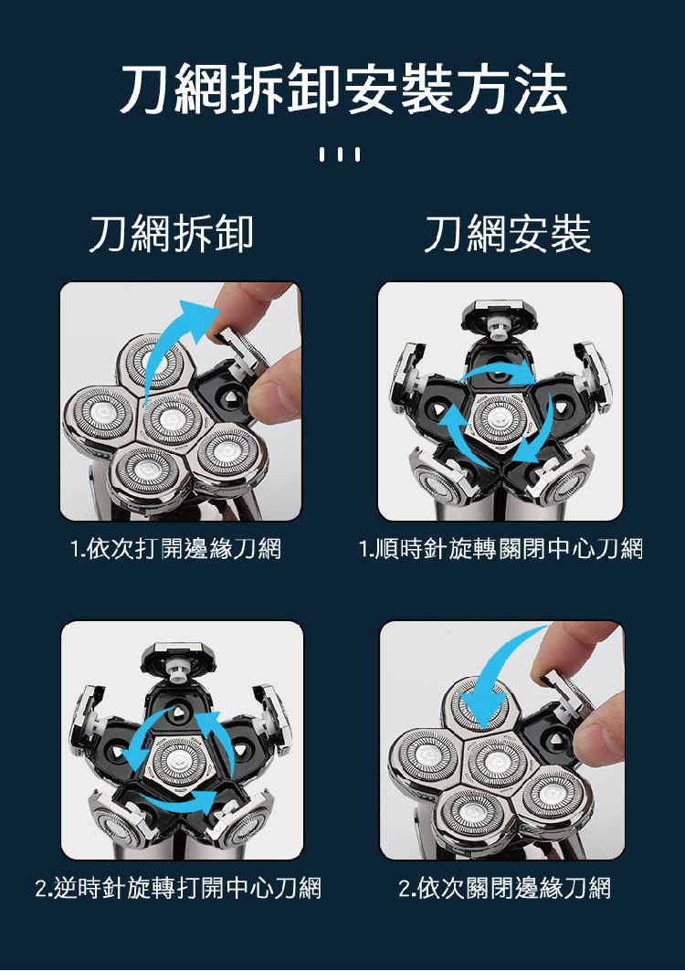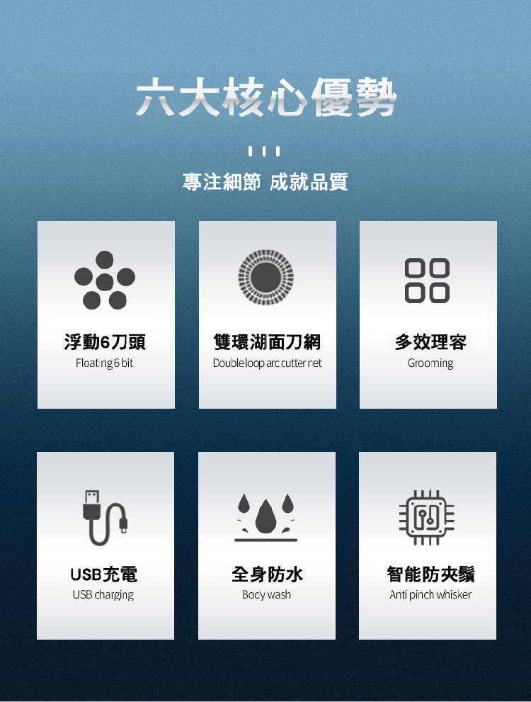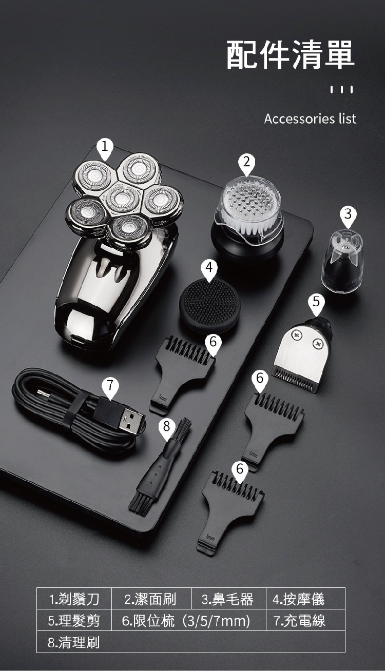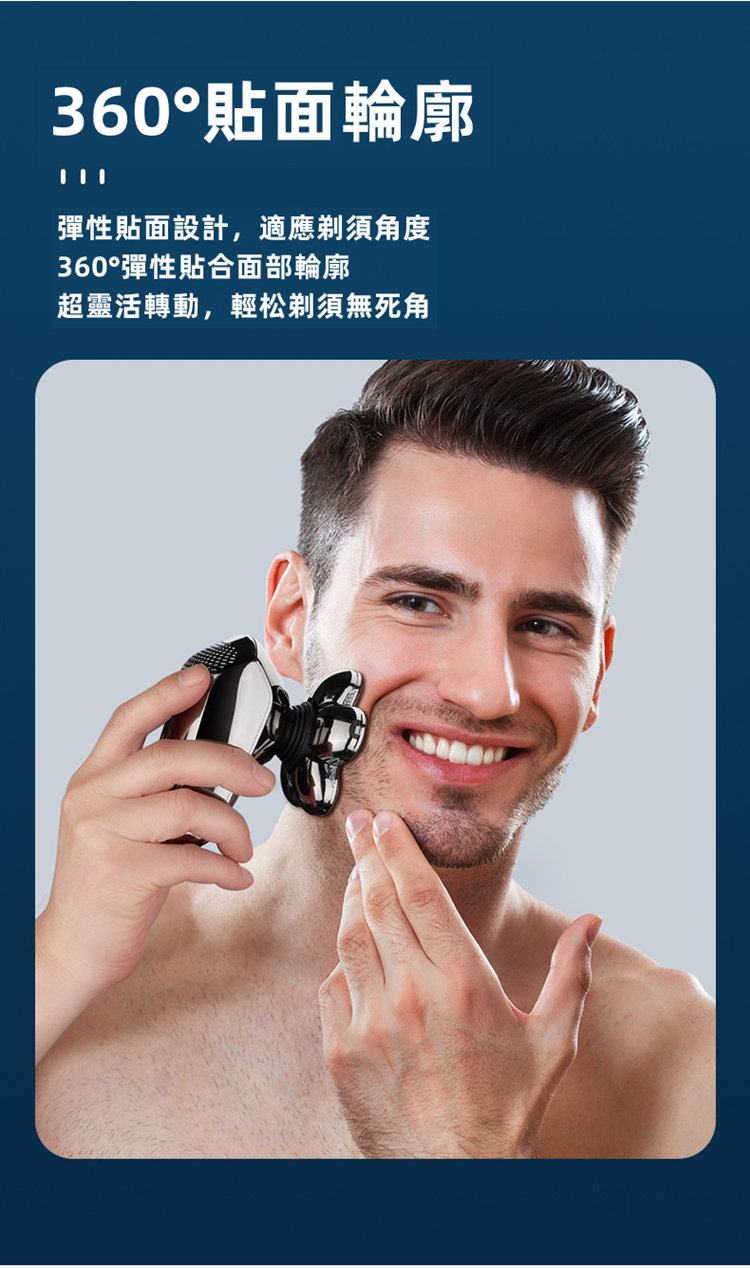 全功能深層剃淨刮鬍刀 | 六刀頭浮動貼面 | 全身水洗 | 可理光頭神器 | 理髮修鼻毛潔面全搞定 | 智慧防夾鬚 | 至尊多功能智慧電動刮鬍刀修容組