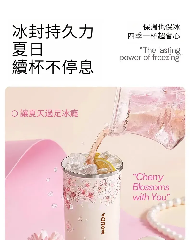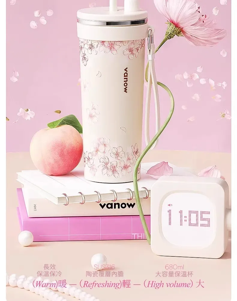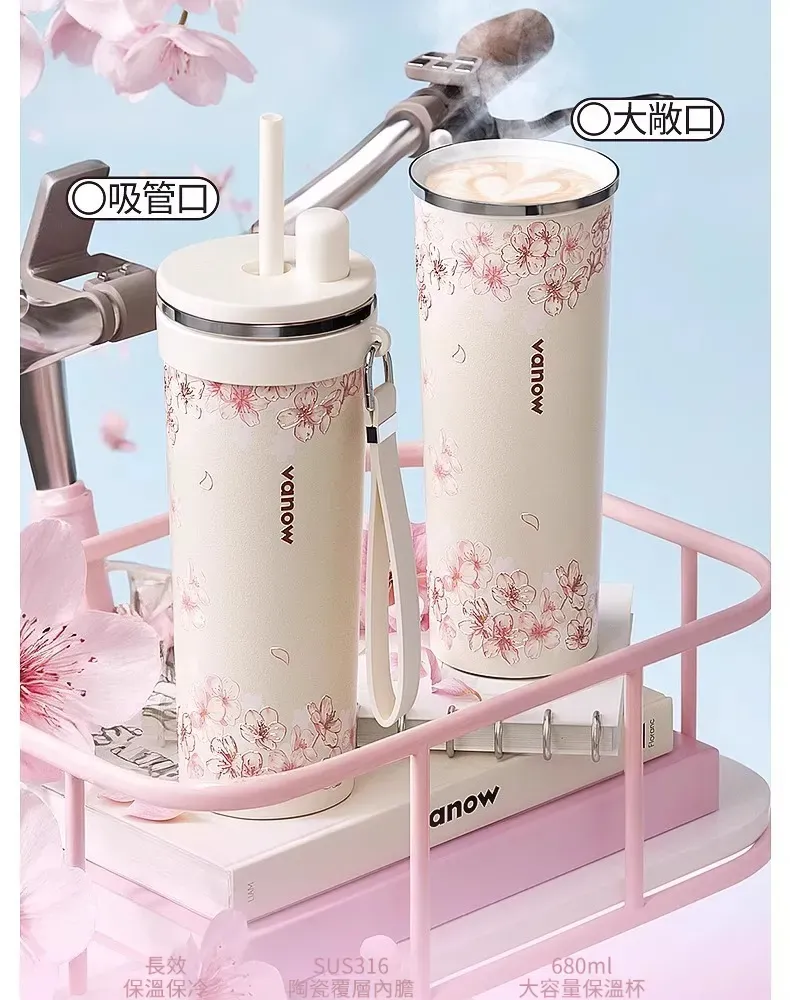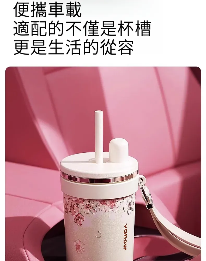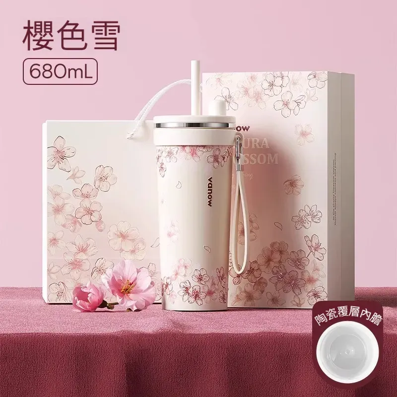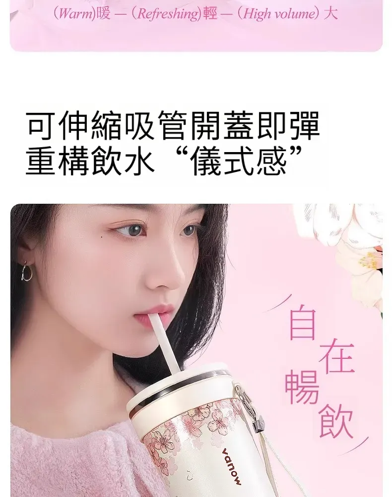 櫻色雪・萬物可泡養生吸管保溫杯 | SUS316陶瓷覆層內膽 | 多層真空強效鎖溫 | 12H長效保溫保冷 | 伸縮吸管開蓋即飲 | VANOW高級保溫吸管杯