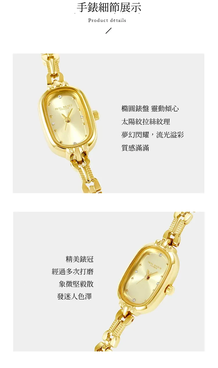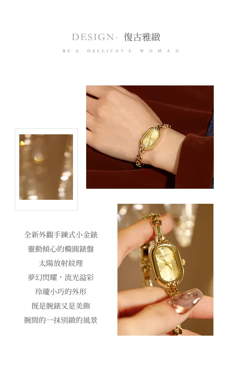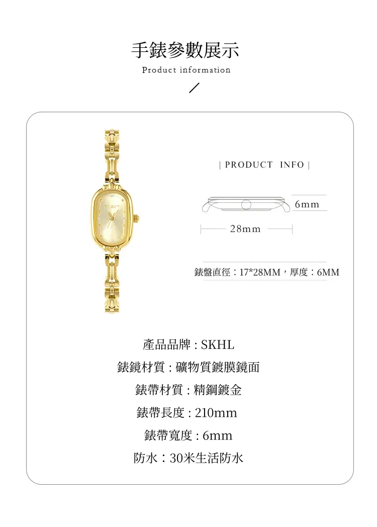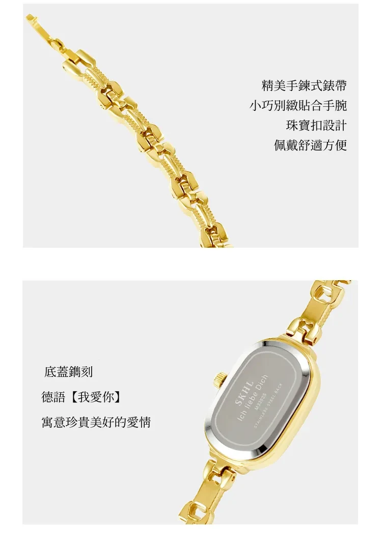 女錶・琥珀時光 | 個性手鍊式小金錶 | 個性橢圓形錶盤 | 太陽拉絲紋理 | 底蓋鐫刻愛意 | 30米防水 | SKHL經典雅緻女士小金錶