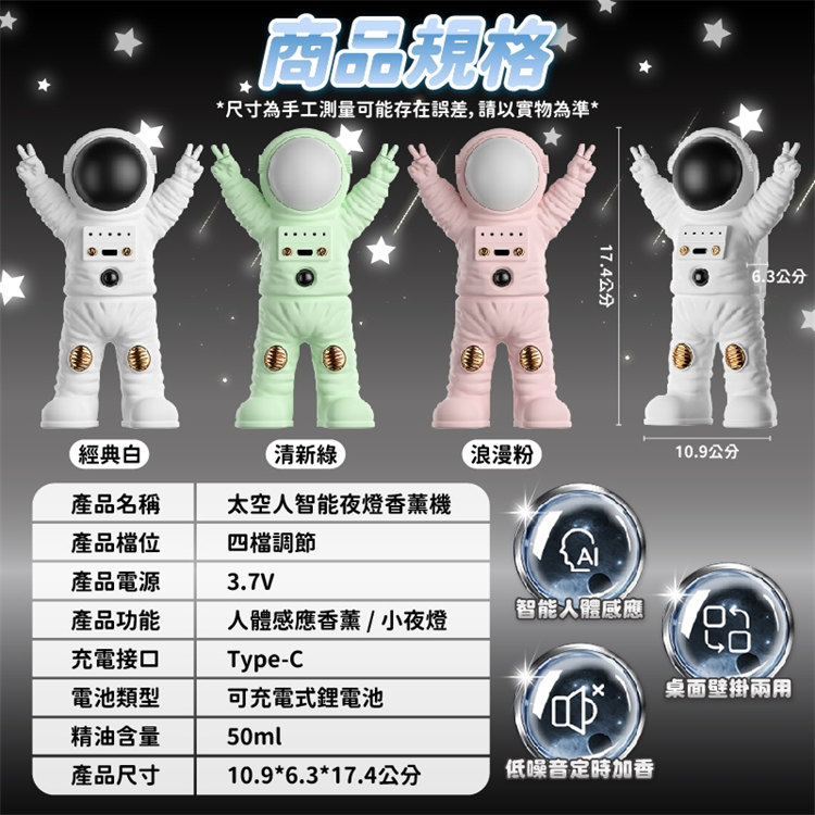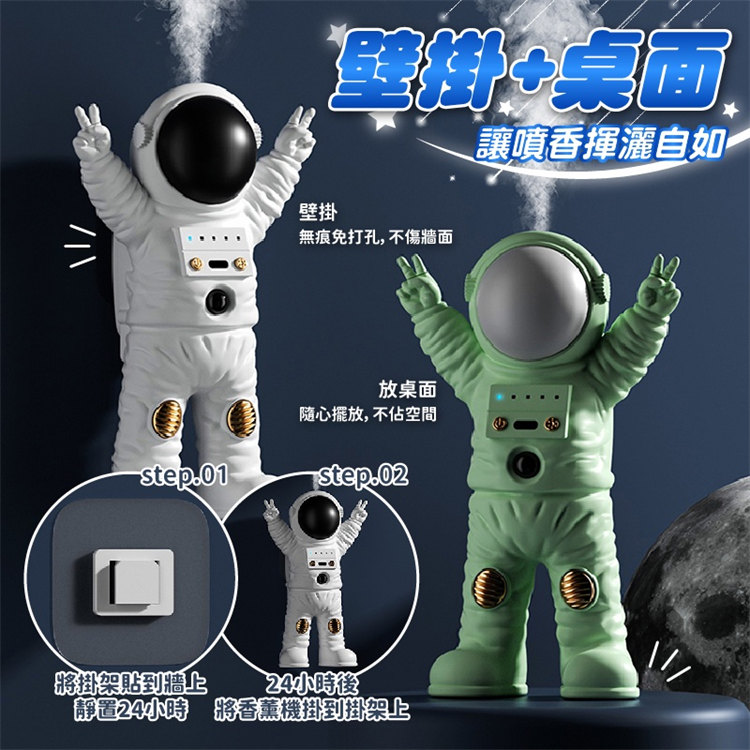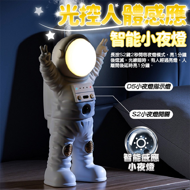 太空人智慧夜燈擴香器 | 人體感應式噴香 | 四檔噴香可調 | 送50ml天然植萃精油 | 無線鋰電充插兩用 | 智慧自動噴香香精油夜燈無水香薰機