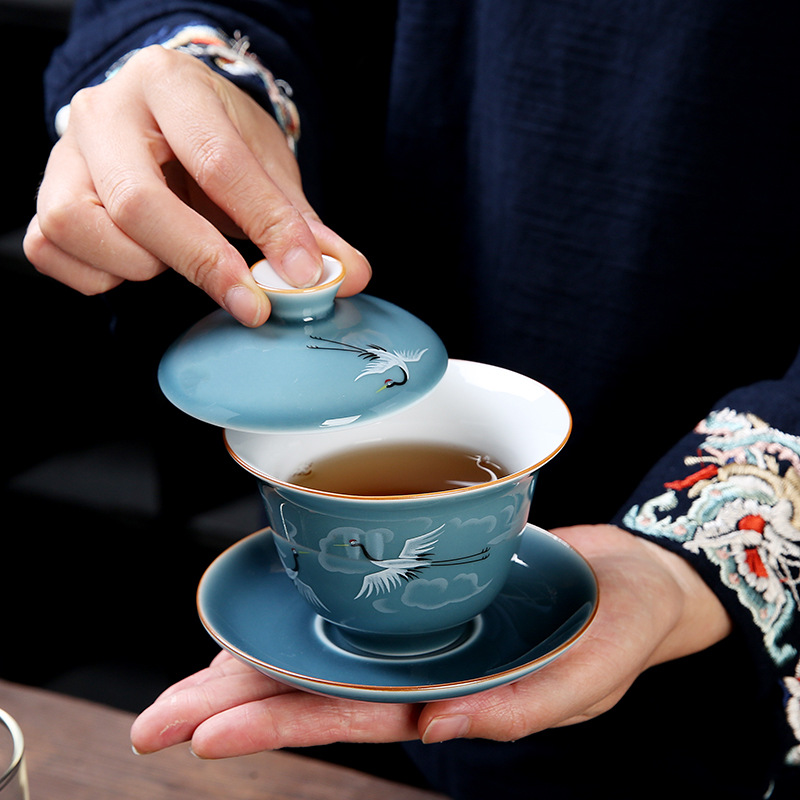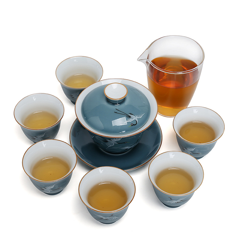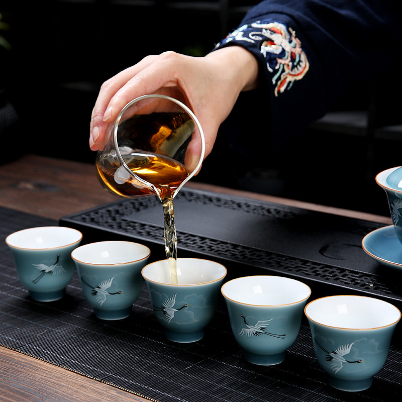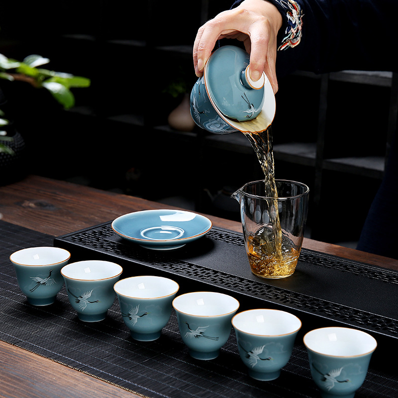【霁青釉彩功夫茶具套組】【古风仙鹤】精品手製手繪仙鶴霁青釉彩功夫茶具套组