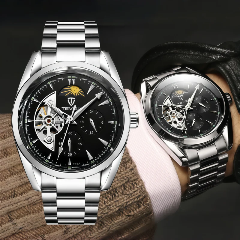 男錶・機械・飛輪紀年 | 全自動機械機芯 | 鏤空陀飛輪 | 星辰月相 | 獨立小錶盤 | 強視夜光 | 30米防水 | 實心鋼帶 | TEVISE非凡氣質全自動機械男錶