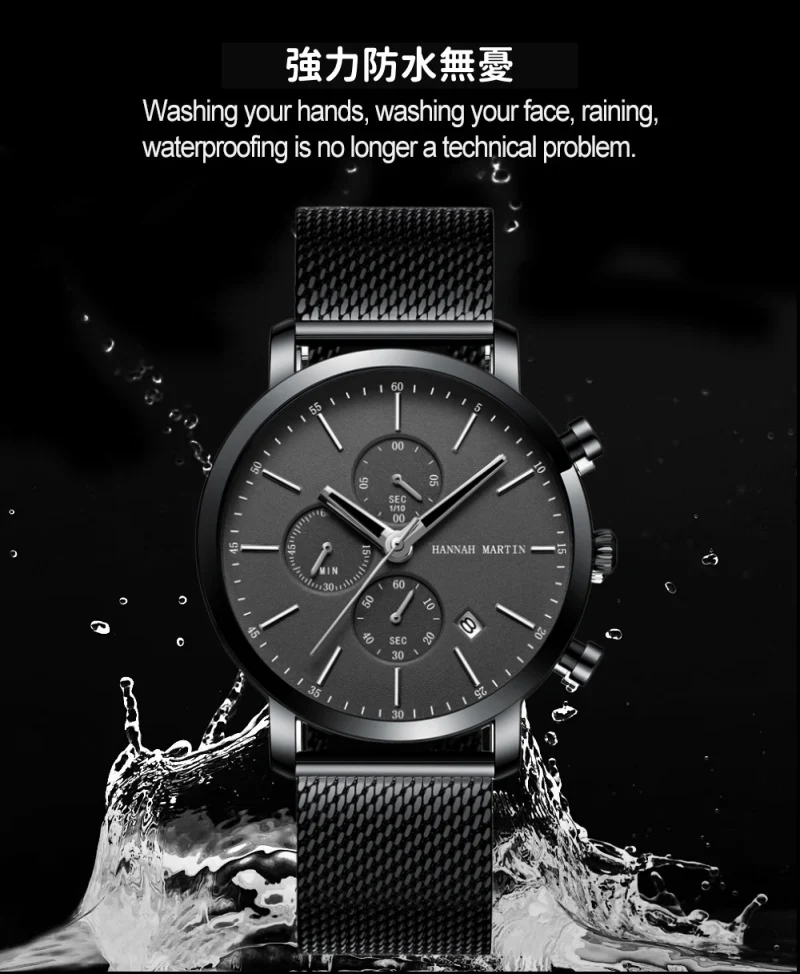 男錶・暗夜主理 | 港風型男商務休閒手錶 | 日本精工天馬渡機芯 | 米蘭尼斯鋼帶 | 30米防水 | HANNAH MARTIN氣質小資男士商務休閒手錶