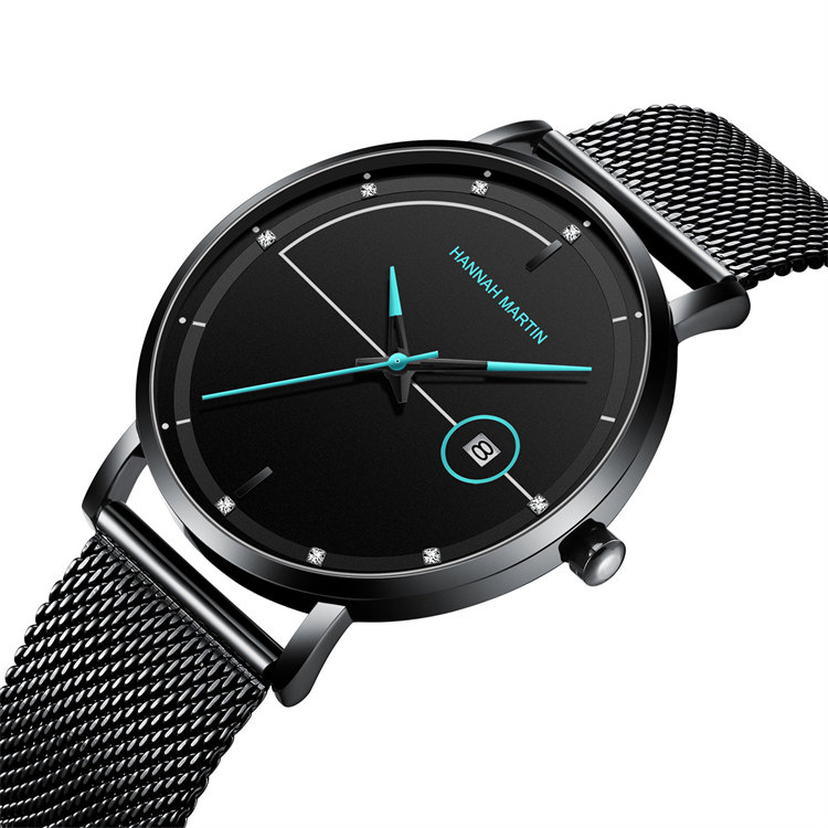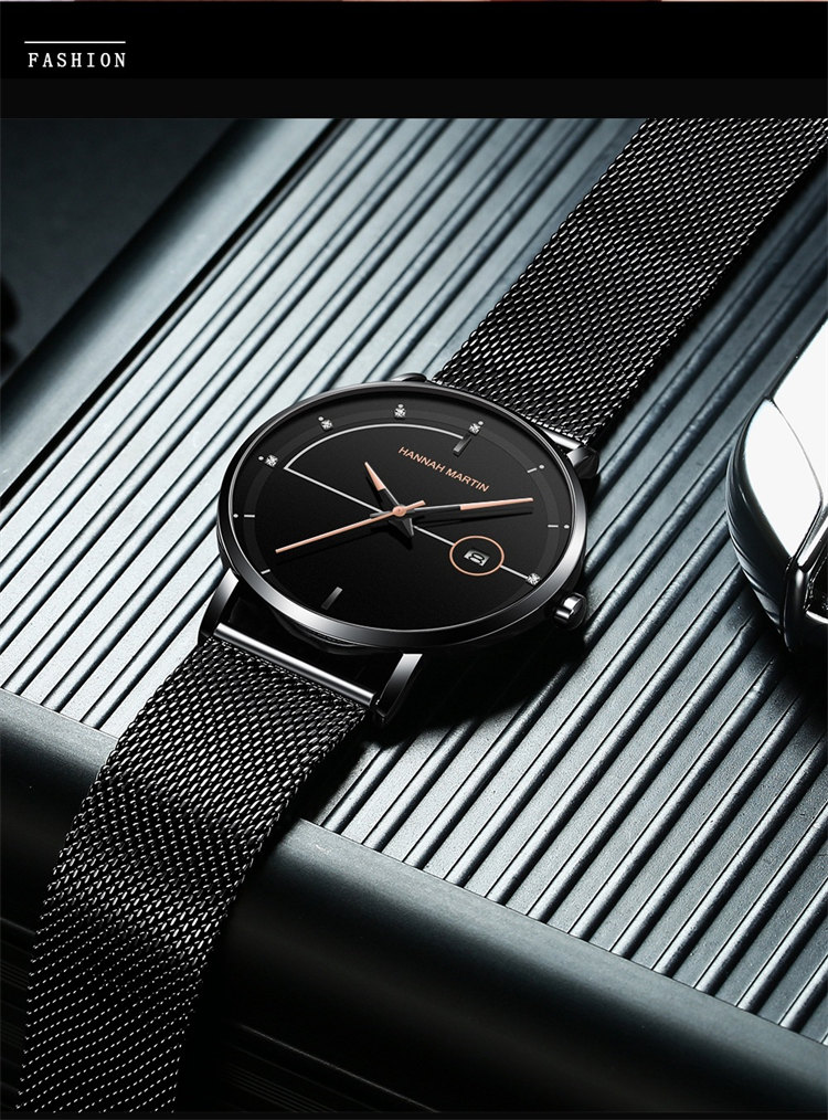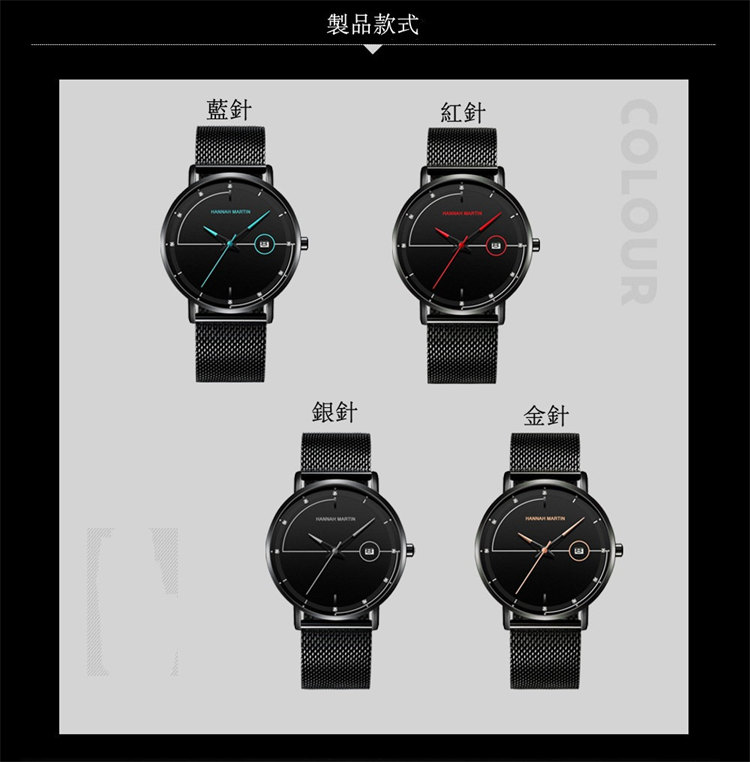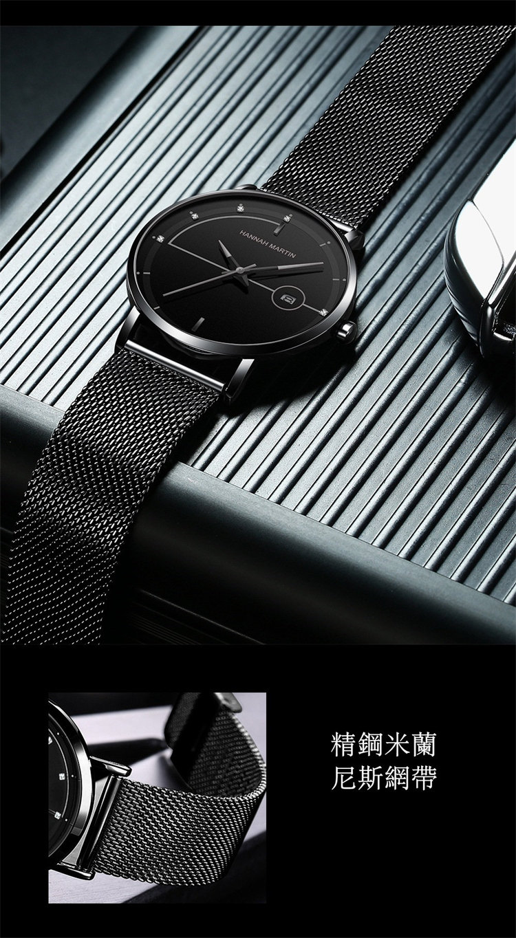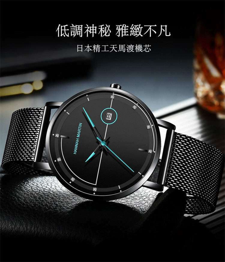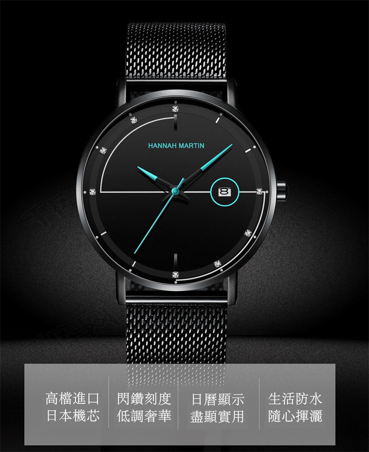 百搭型男腕錶 | 日本精工天馬渡機芯 | 米蘭尼斯鋼帶 | 30米防水 | 日曆功能 | HANNAH MARTIN高檔日本機芯閃鑽刻度藍針米蘭尼斯鋼帶型男手錶