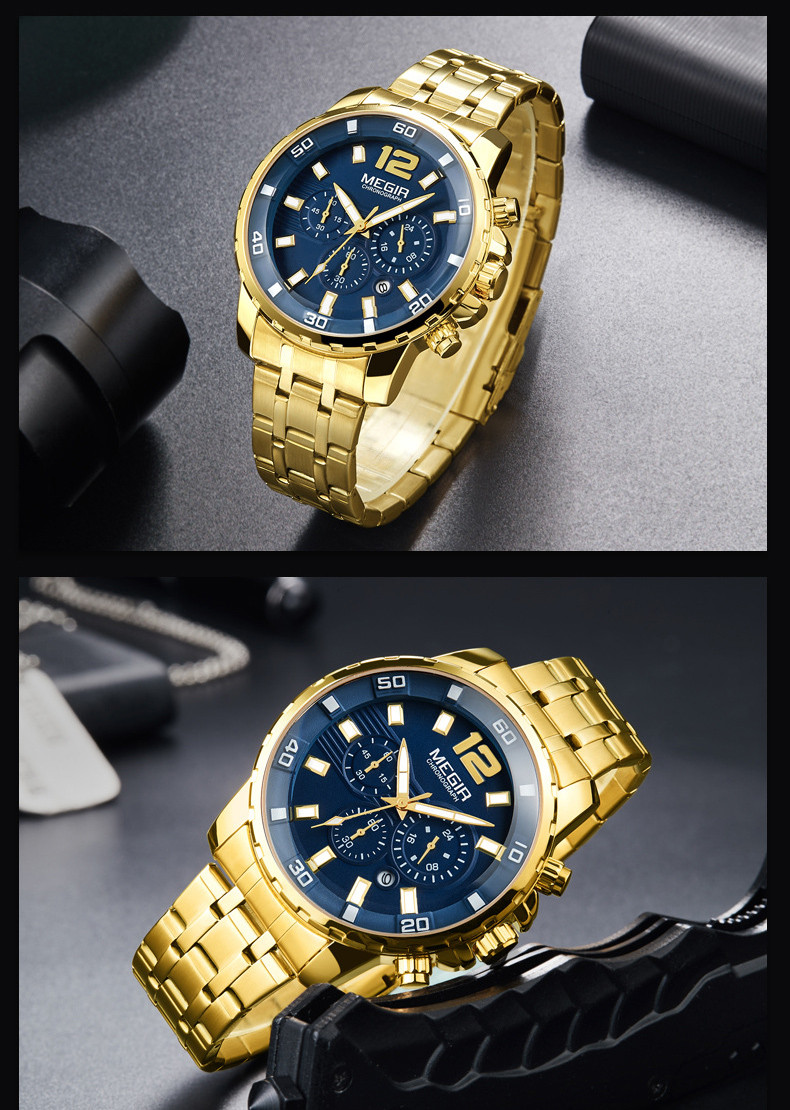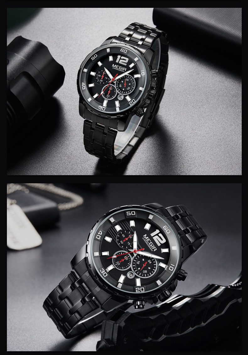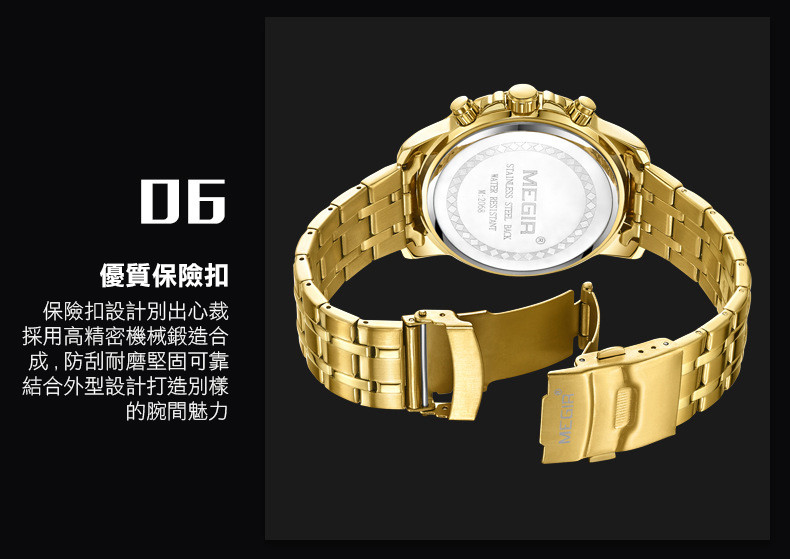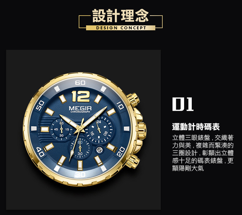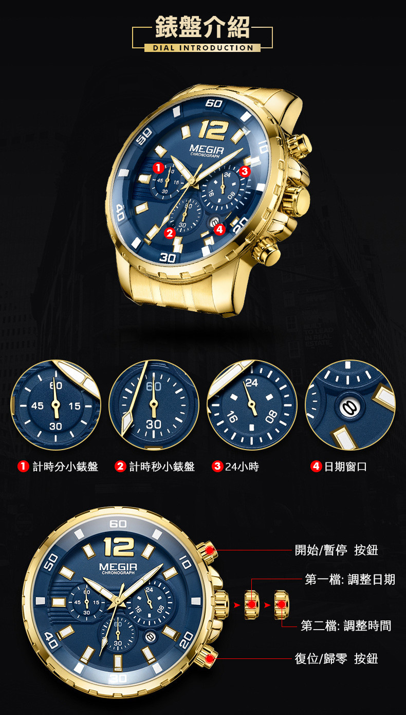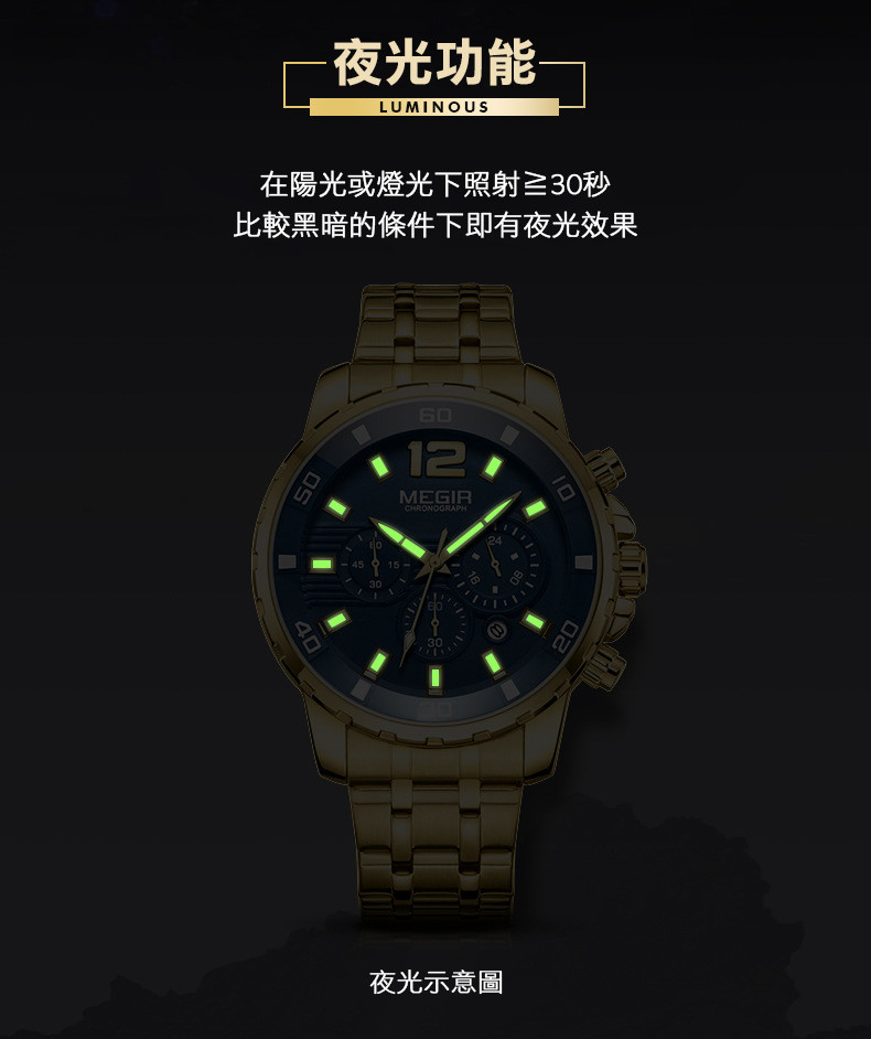 賽車手運動輕熟系列 | 立體三眼計時 | 實心鋼帶 | 夜光指針 | 日曆功能 | 3ATM防水 | MEGIR賽車手運動錶盤熟男氣質紳士三眼計時運動手錶