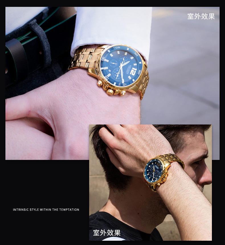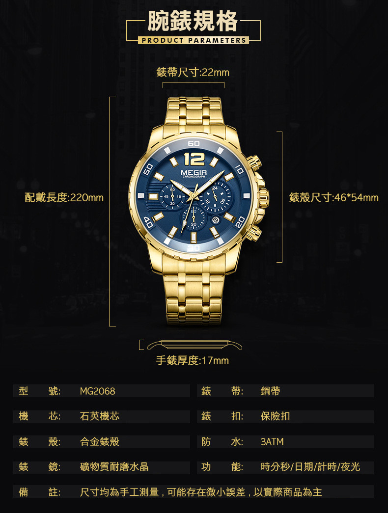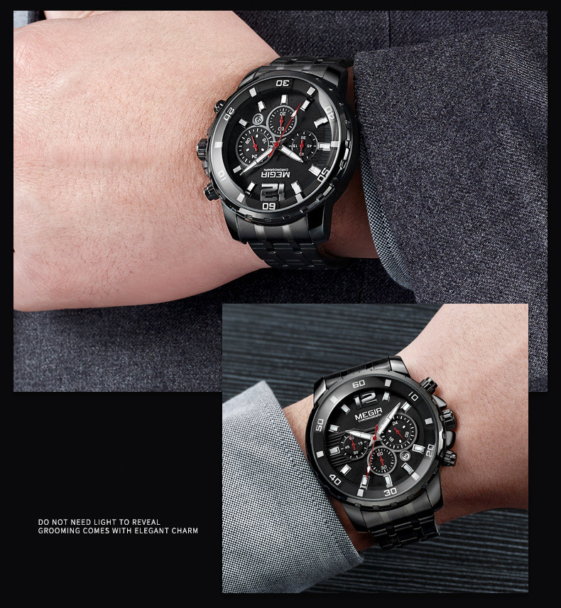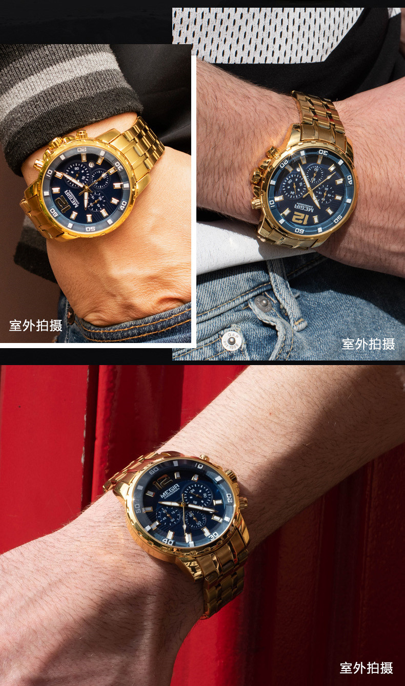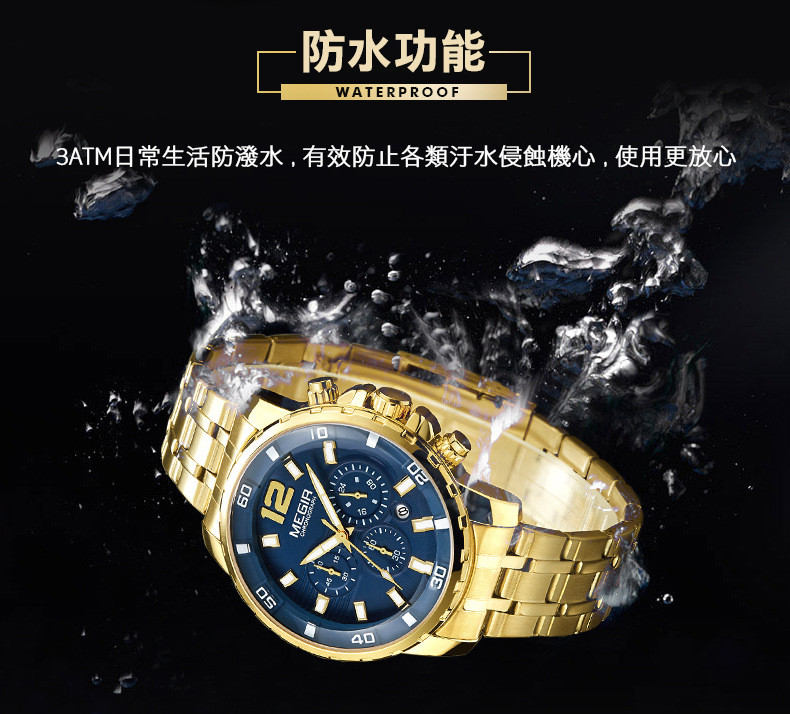 賽車手運動輕熟系列 | 立體三眼計時 | 實心鋼帶 | 夜光指針 | 日曆功能 | 3ATM防水 | MEGIR賽車手運動錶盤熟男氣質紳士三眼計時運動手錶