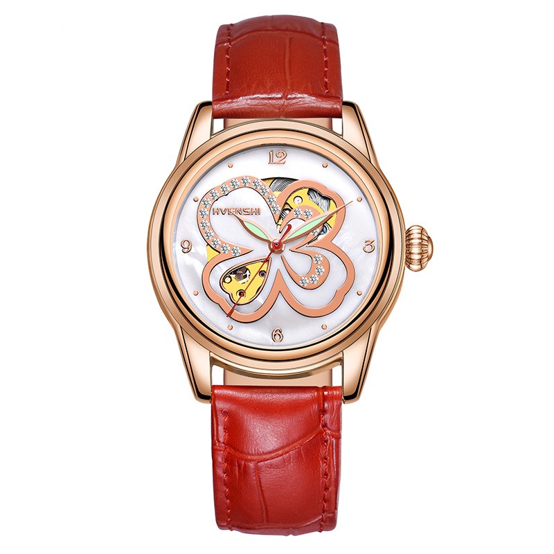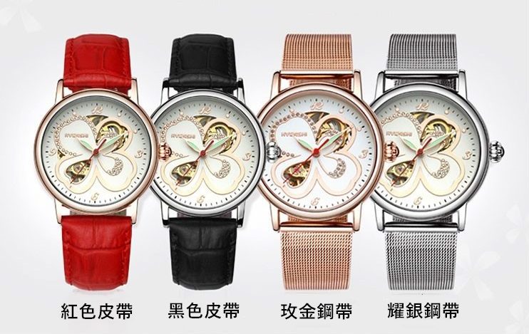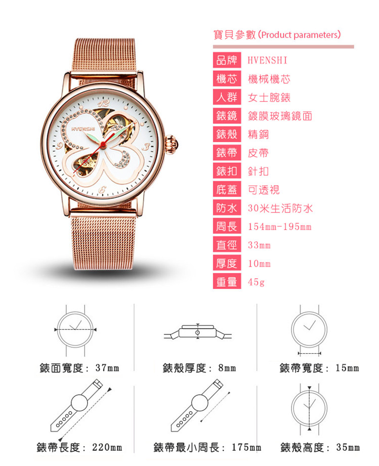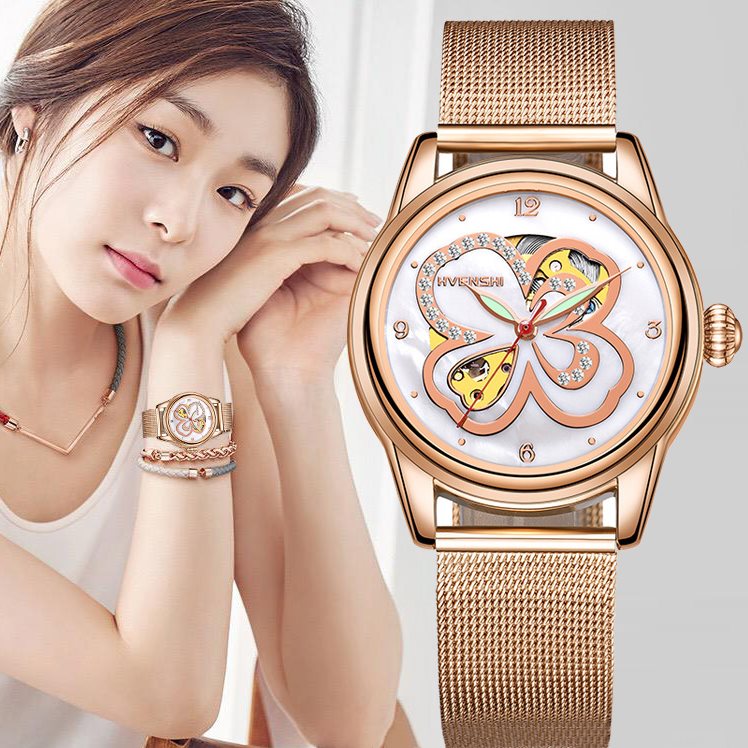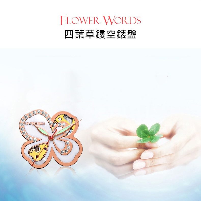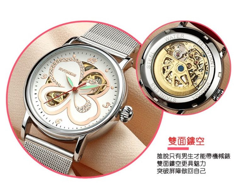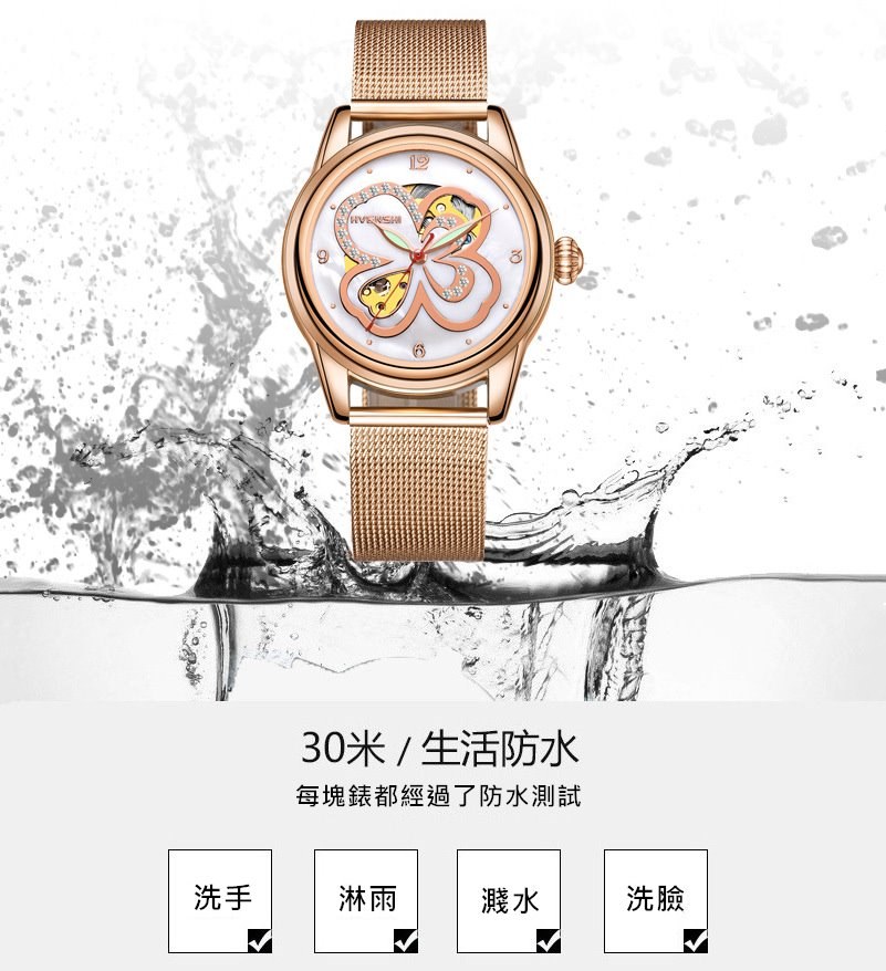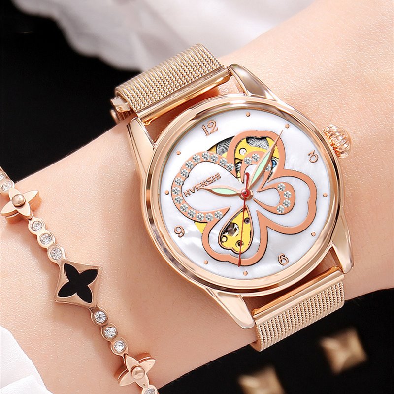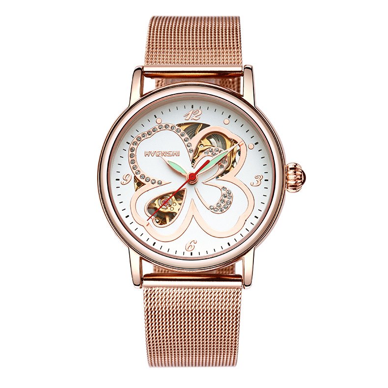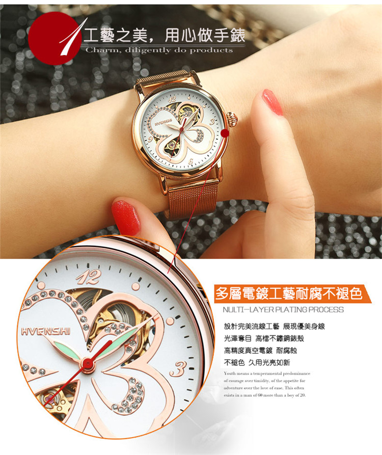 全自動機械機芯 | 四葉幸運草鏤空錶盤 | 玫金網帶 | 30米防水 | 正韓HVENSHI名媛款四葉幸運草小圓盤女士自動機械錶
