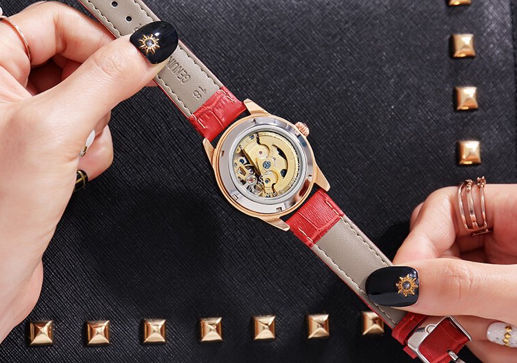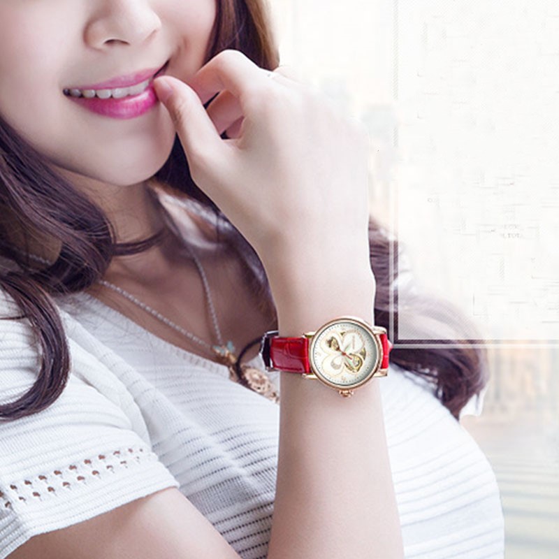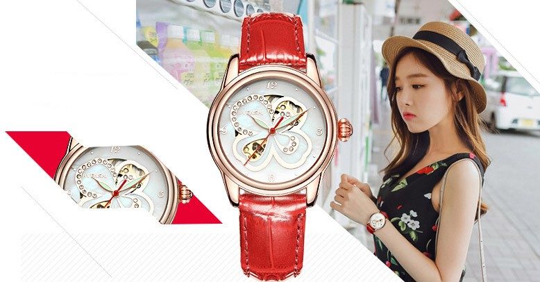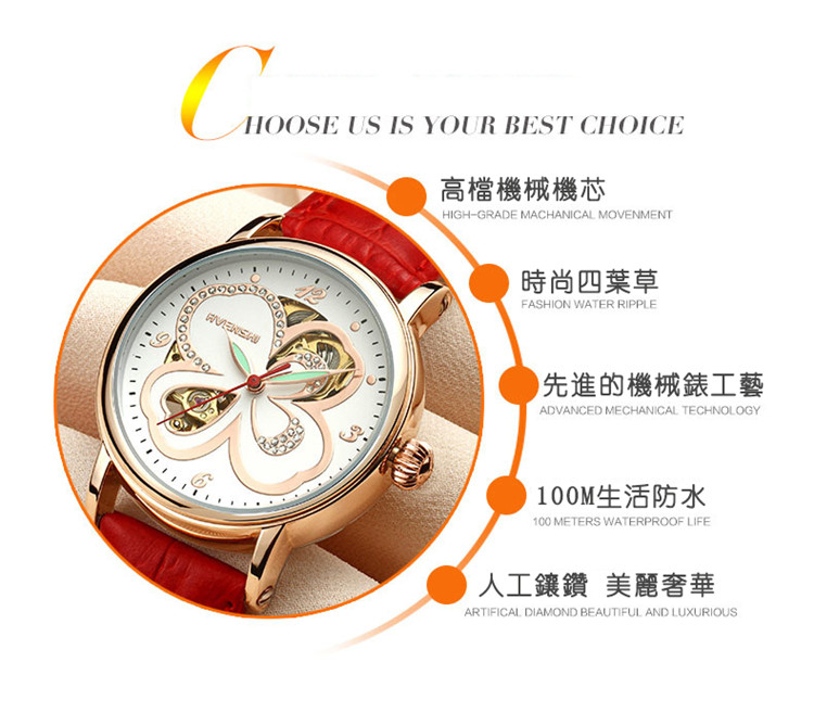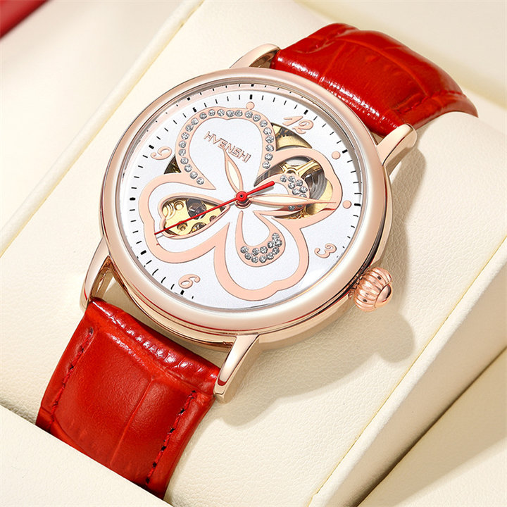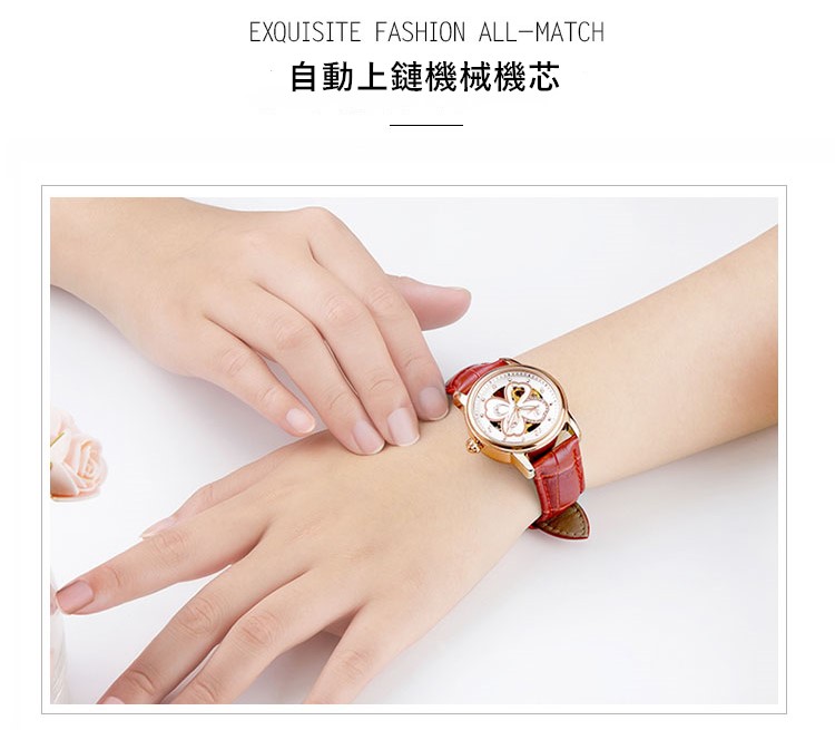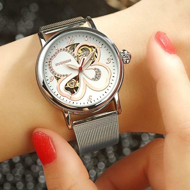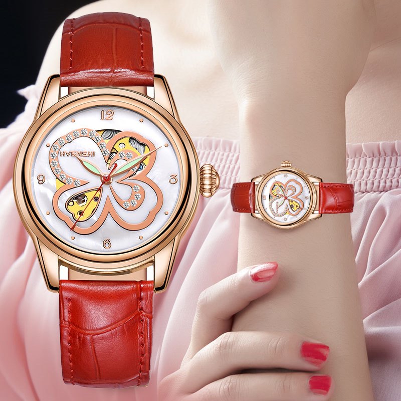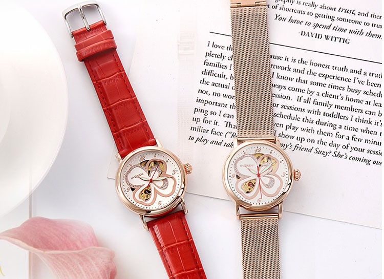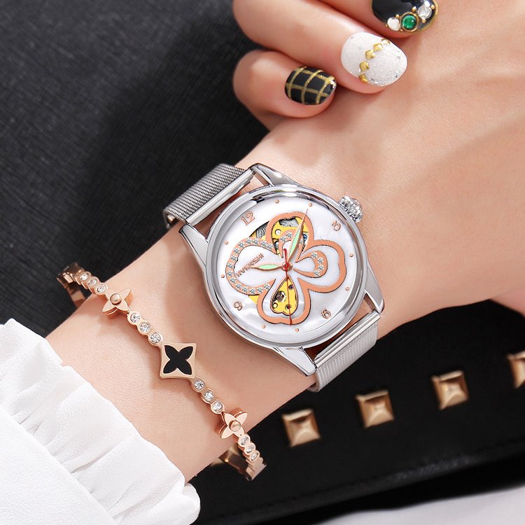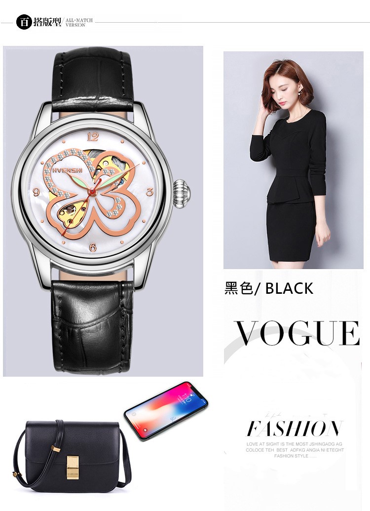 全自動機械機芯 | 四葉幸運草鏤空錶盤 | 玫金網帶 | 30米防水 | 正韓HVENSHI名媛款四葉幸運草小圓盤女士自動機械錶