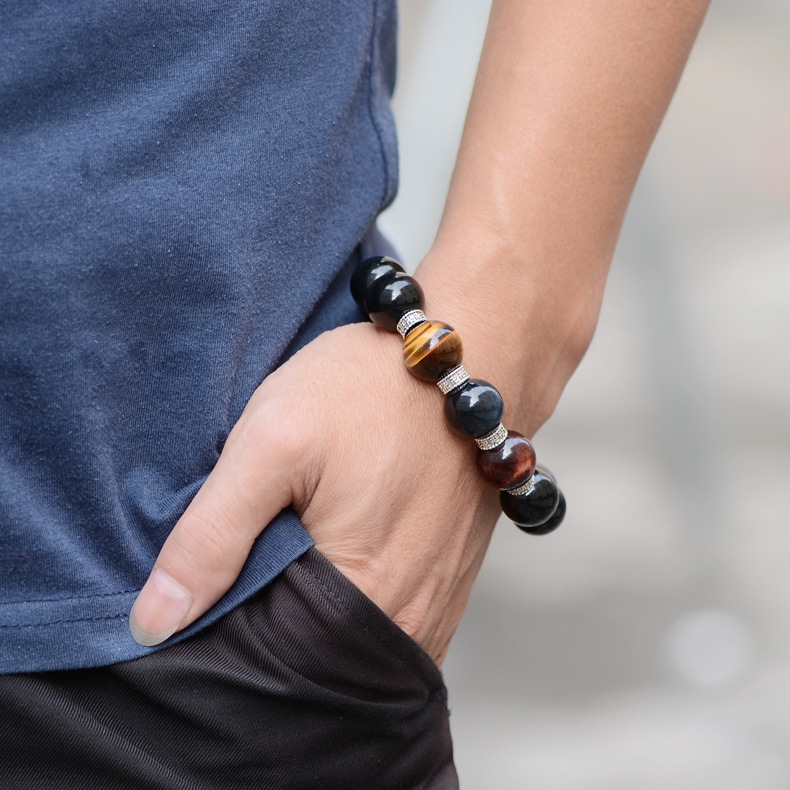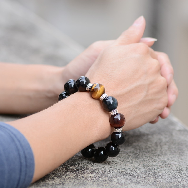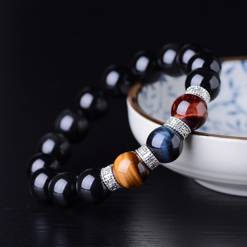 設計師款招財辟邪活力天然彩虹黑曜石配黃紅藍虎眼石男女手串手鍊