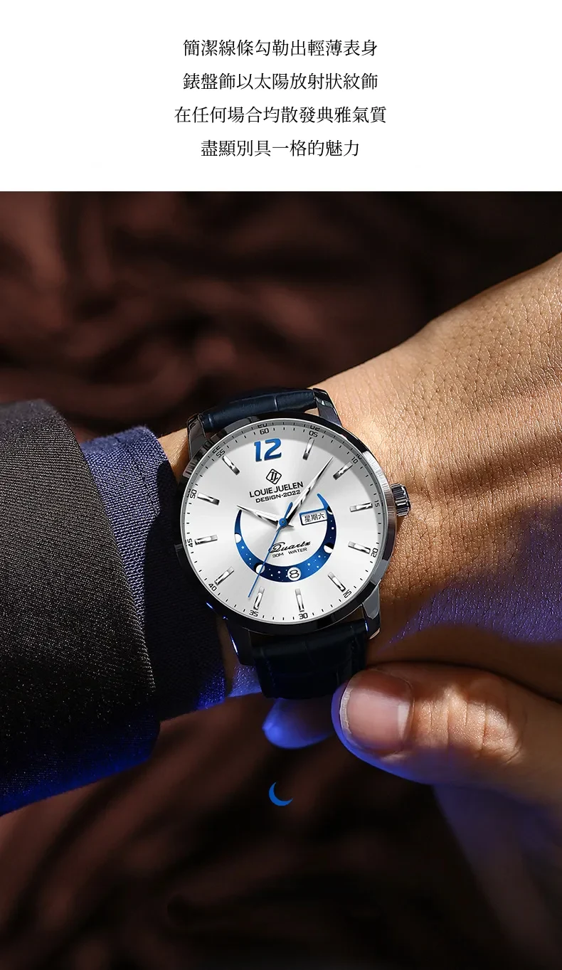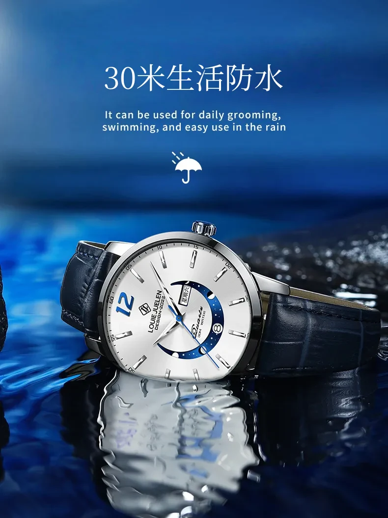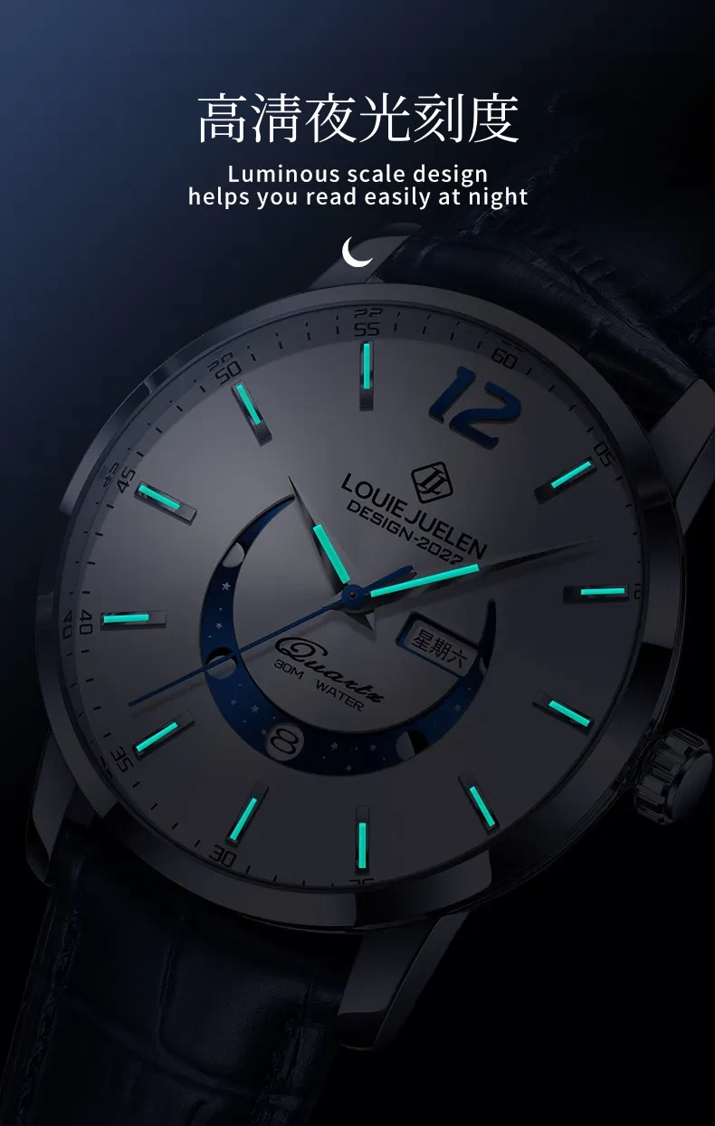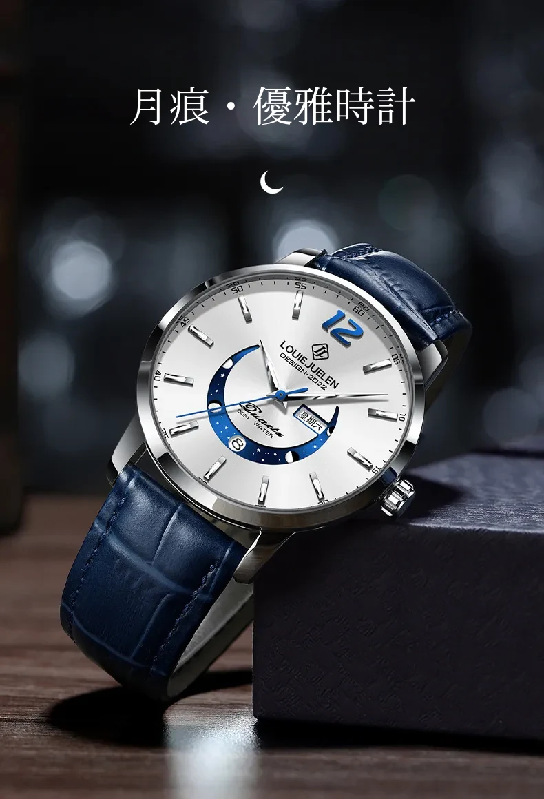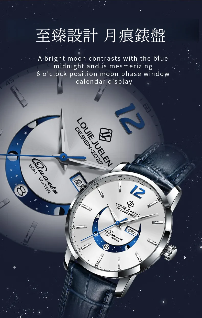 男錶・心月之痕 | 藍月主題錶盤 | 星期日曆雙歷視窗 | 小牛皮錶帶 | 礦物鍍膜錶鏡 | 高清夜光 | 30米防水 | 瑞士LOUIE JUELEN高級男士手錶