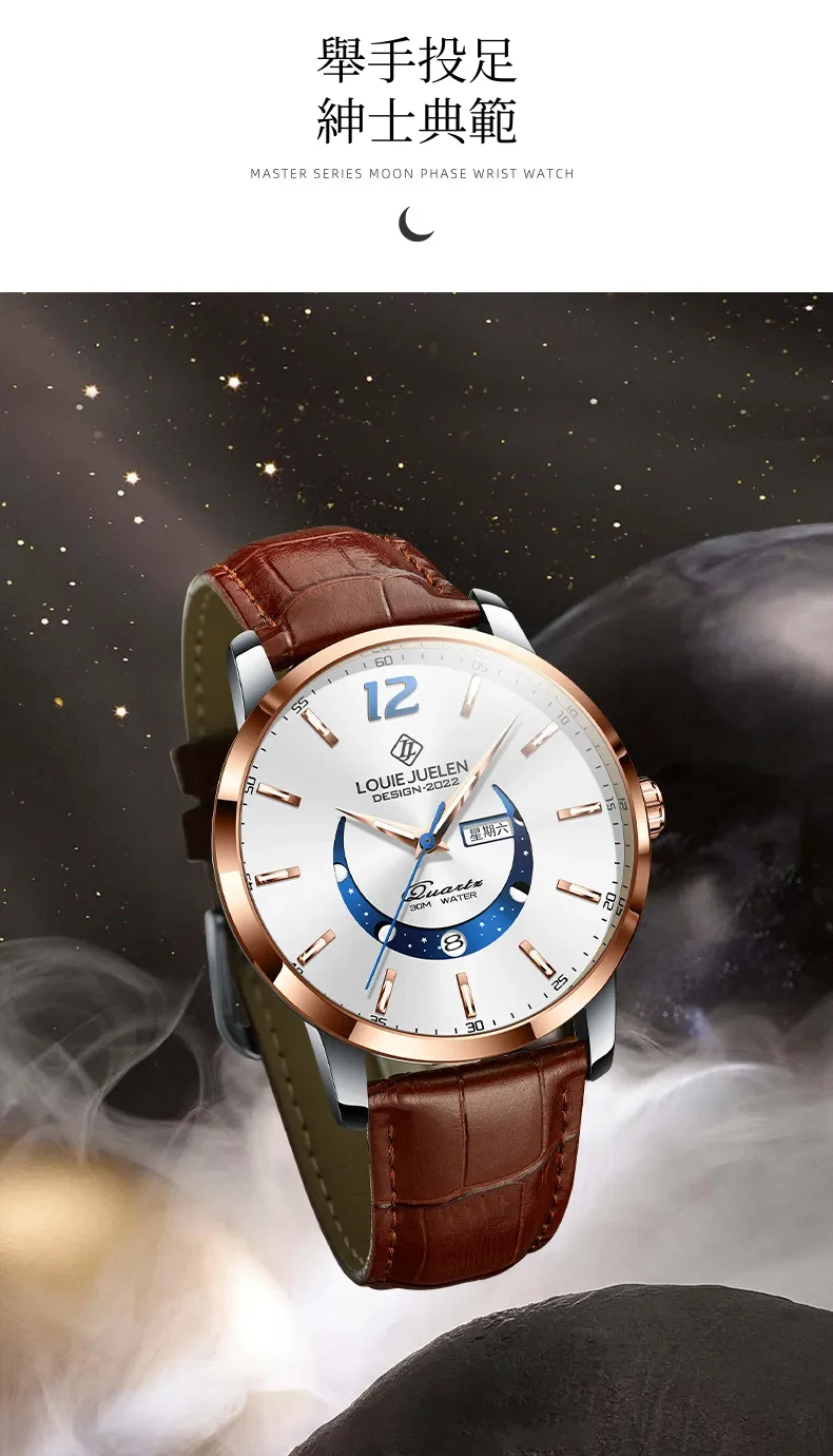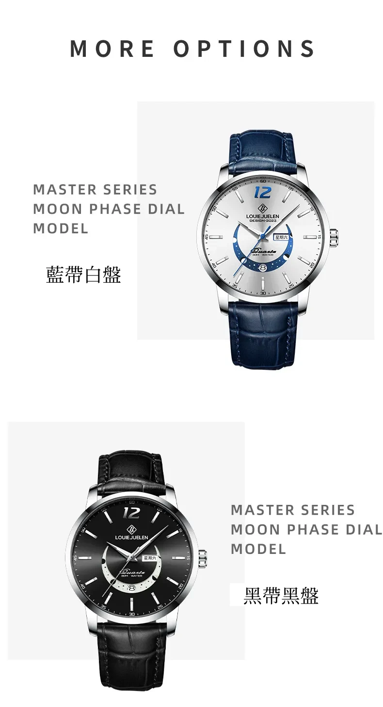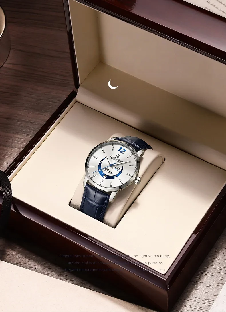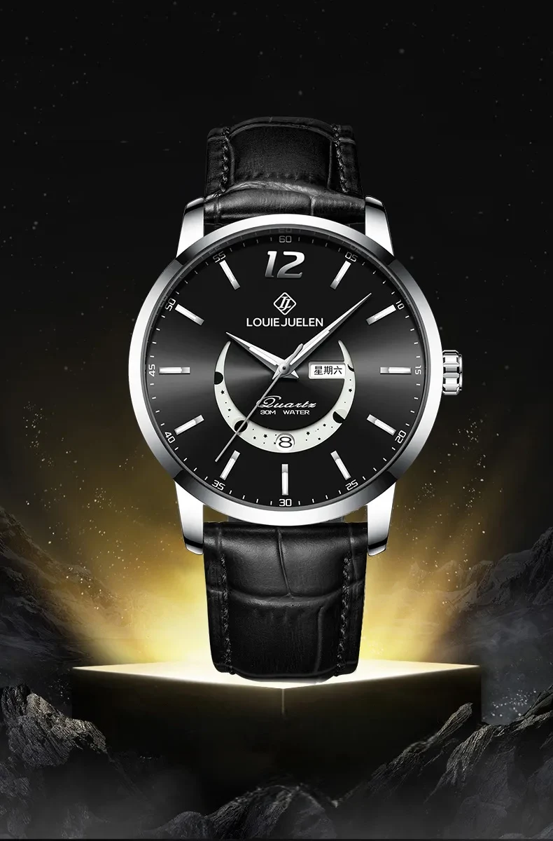 男錶・心月之痕 | 藍月主題錶盤 | 星期日曆雙歷視窗 | 小牛皮錶帶 | 礦物鍍膜錶鏡 | 高清夜光 | 30米防水 | 瑞士LOUIE JUELEN高級男士手錶