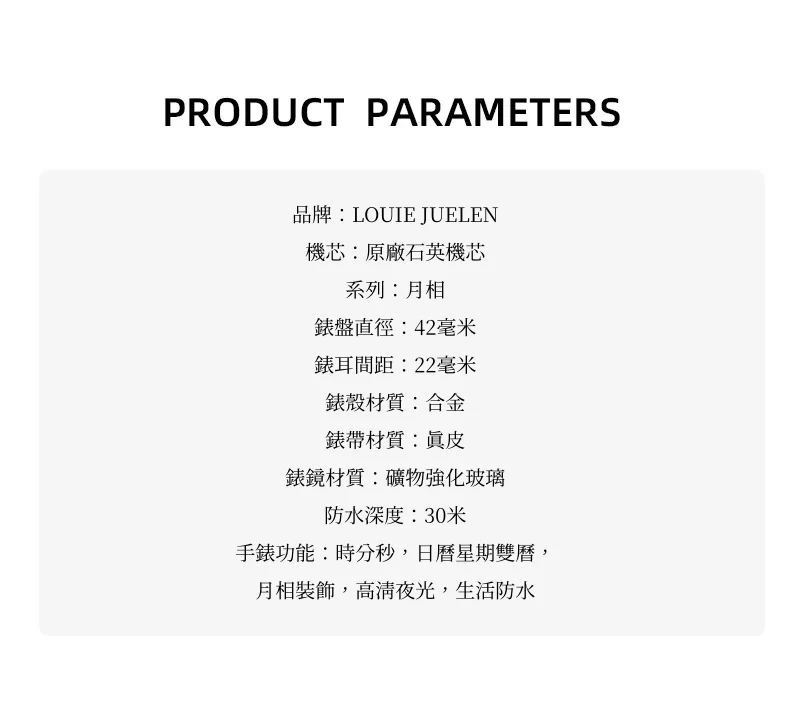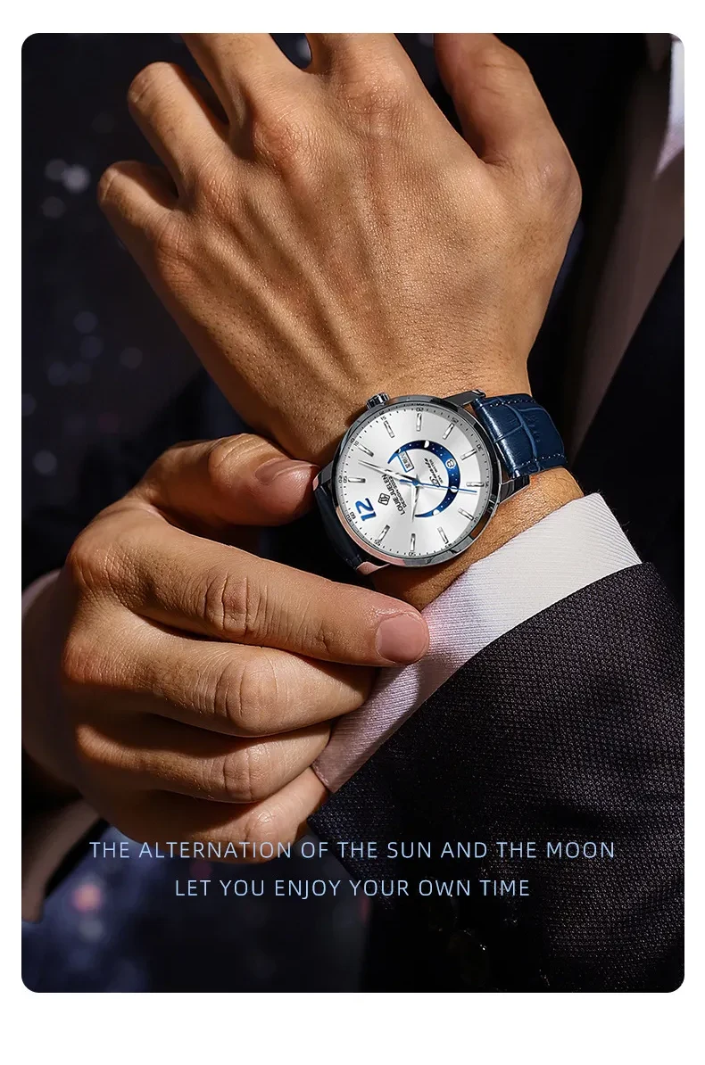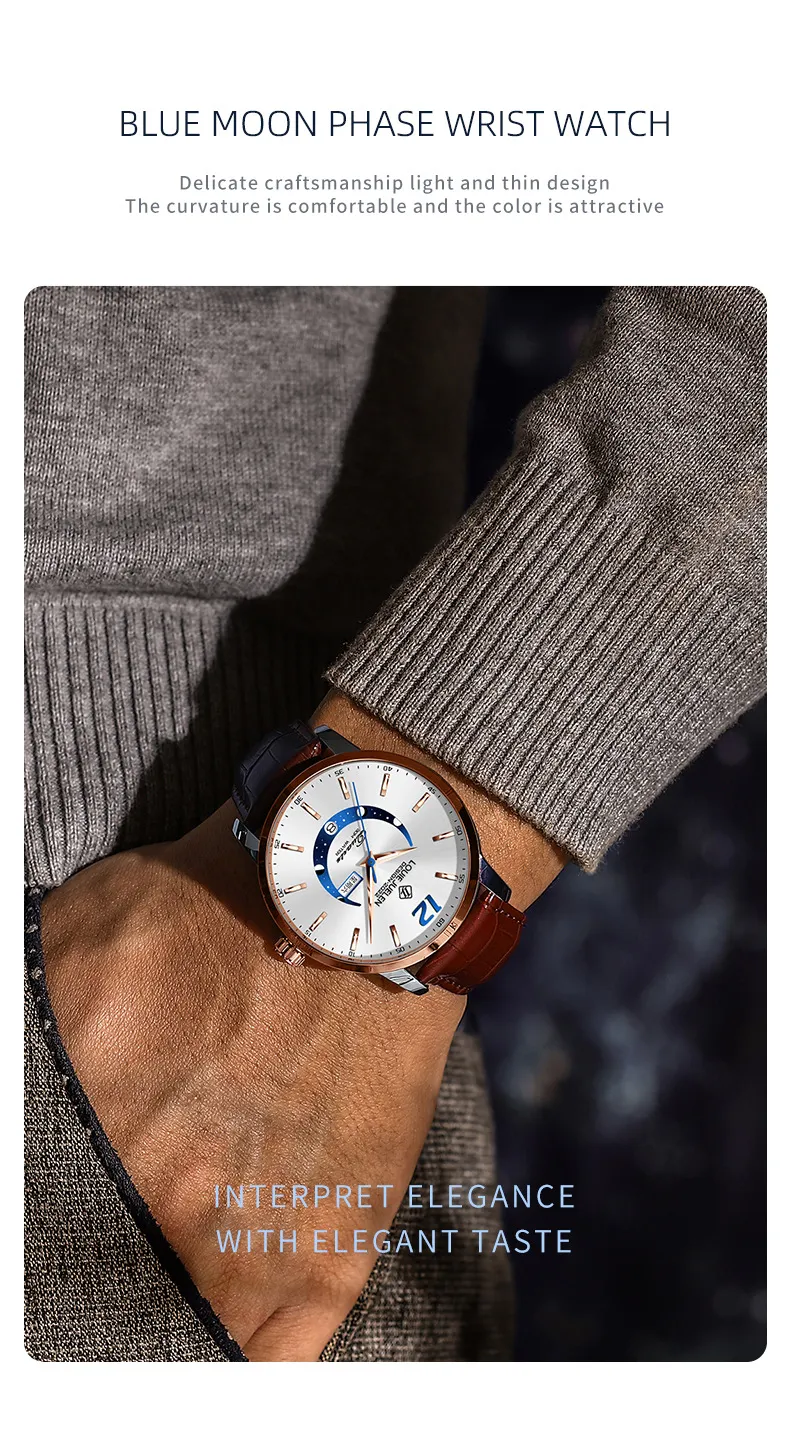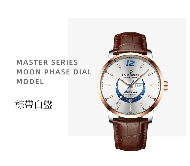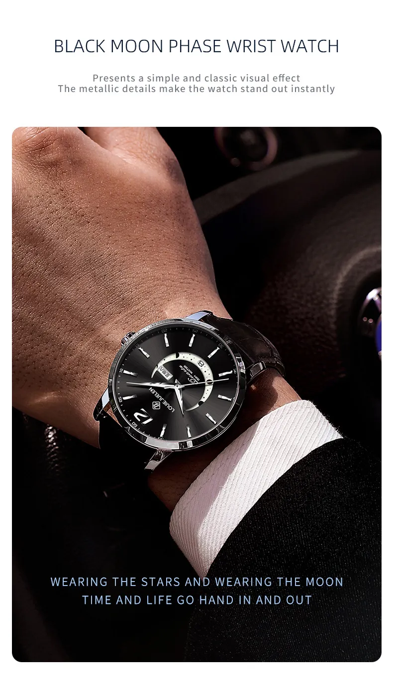 男錶・心月之痕 | 藍月主題錶盤 | 星期日曆雙歷視窗 | 小牛皮錶帶 | 礦物鍍膜錶鏡 | 高清夜光 | 30米防水 | 瑞士LOUIE JUELEN高級男士手錶