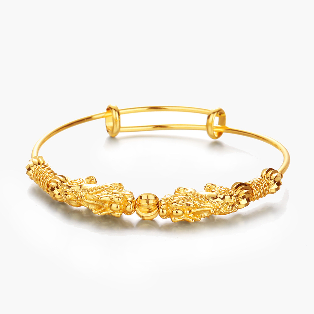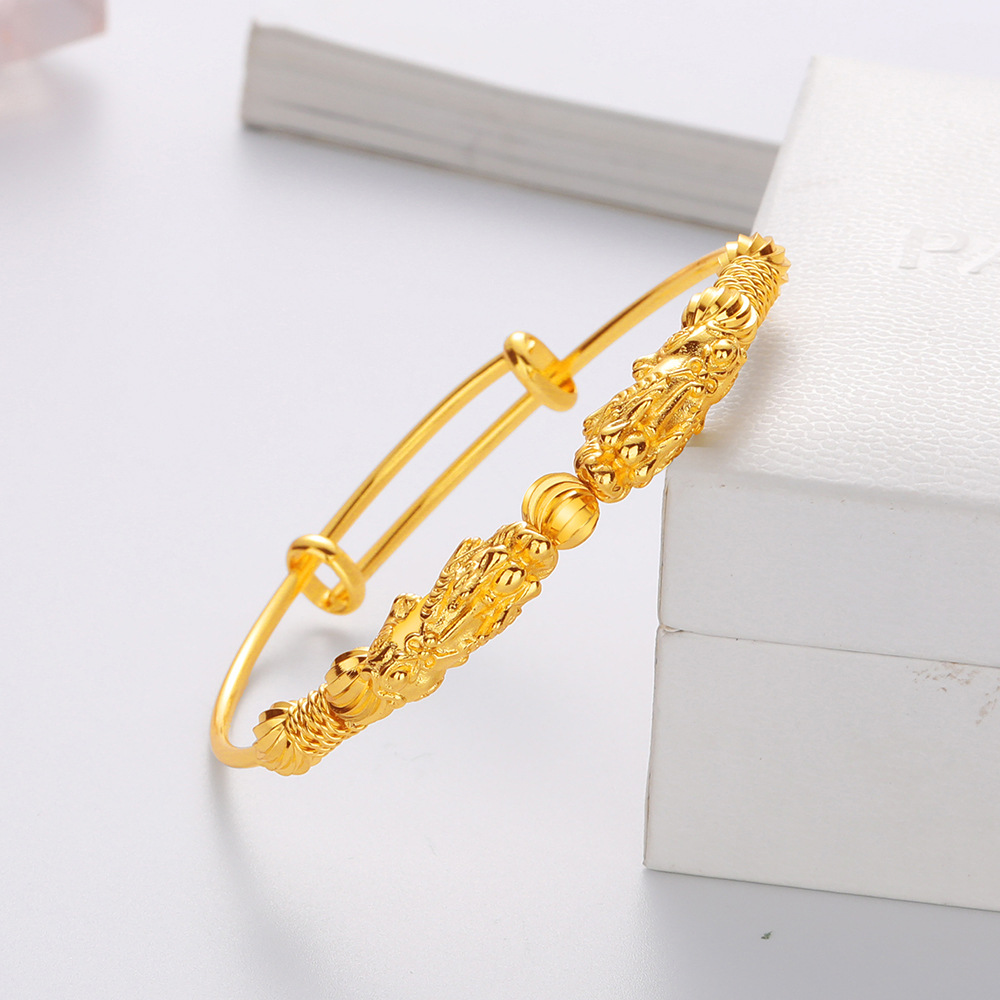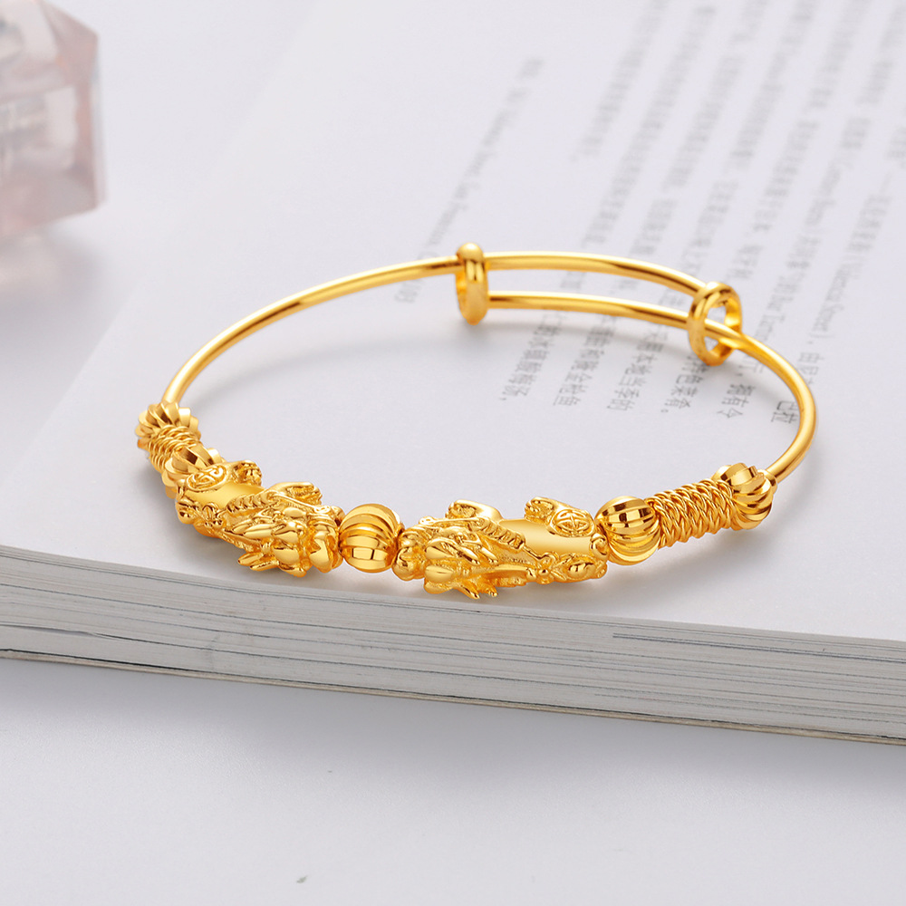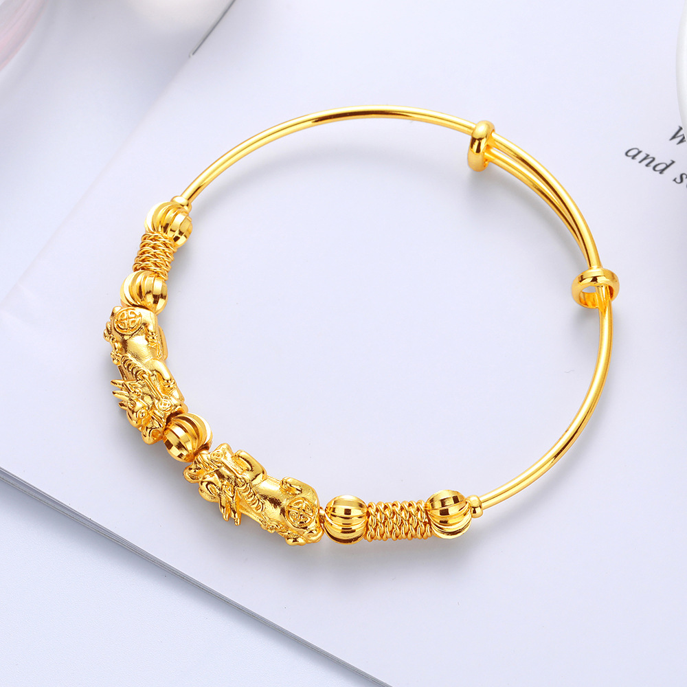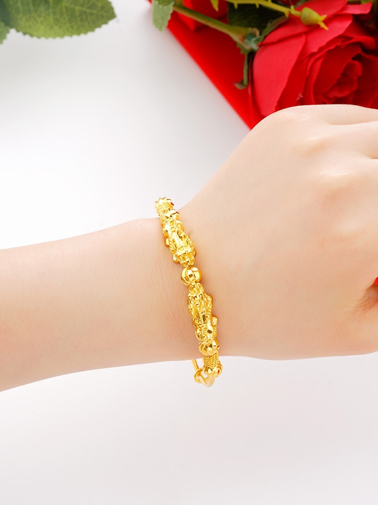 【買一送一】【雙貔貅戲珠】 【黃銅鍍24K金】 古法沙金工藝5D雙貔貅戲珠平替招財手鍊手環