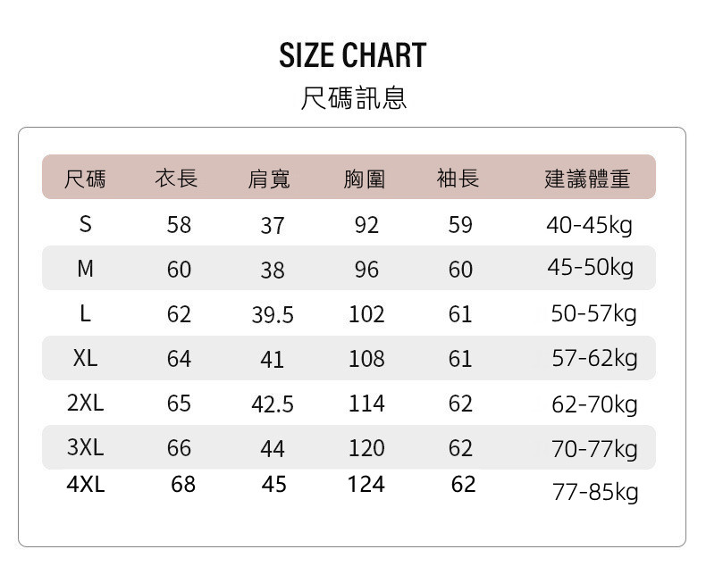 | 尺碼 | S, M, L, XL, 2XL, 3XL, 4XL |