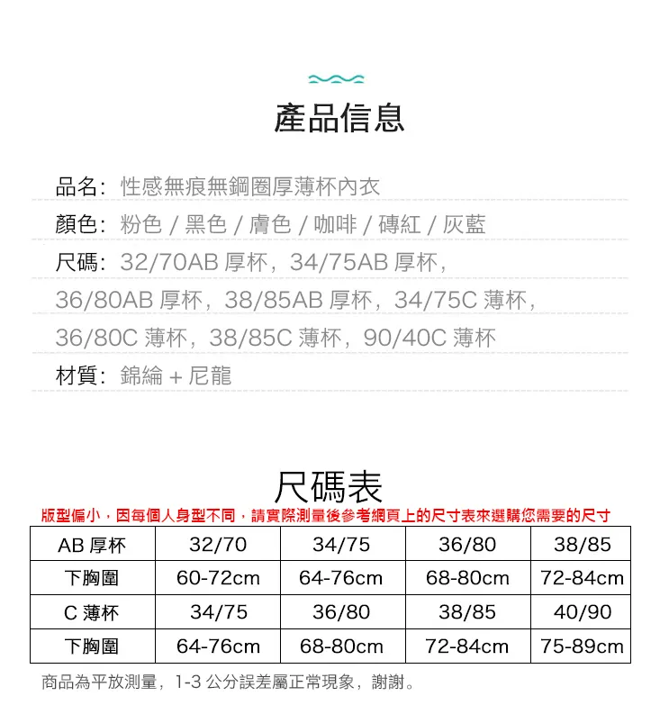 | 尺碼 | 32/70AB通杯【上薄下厚】, 34/75AB通杯【上薄下厚】, 34/75C【薄杯】, 36/80AB通杯【上薄下厚】, 36/80C【薄杯】, 38/85AB通杯【上薄下厚】, 38/85C【薄杯】, 38/90C【薄杯】 |