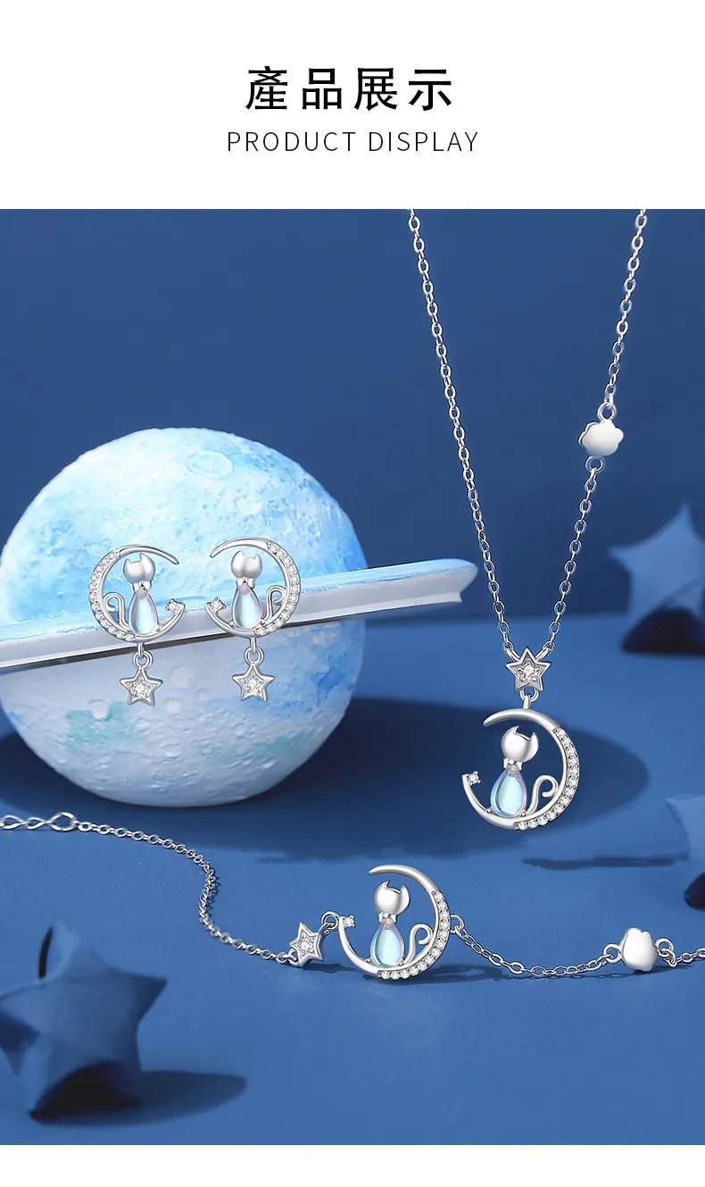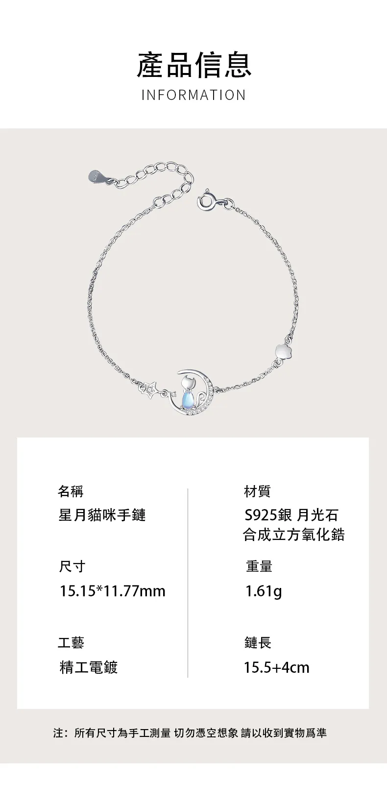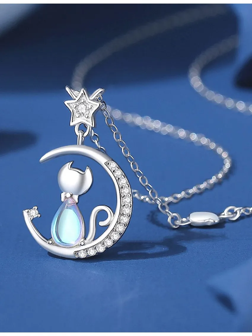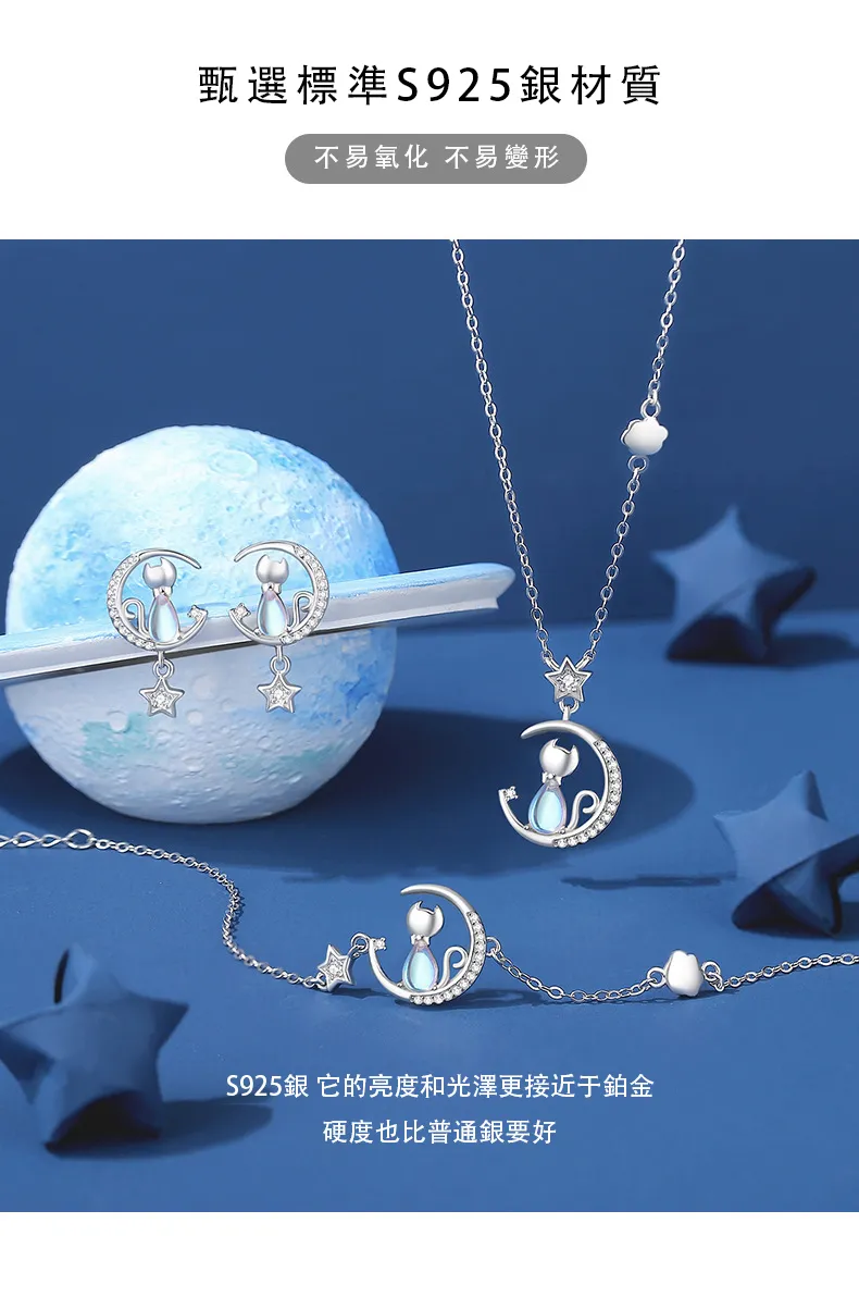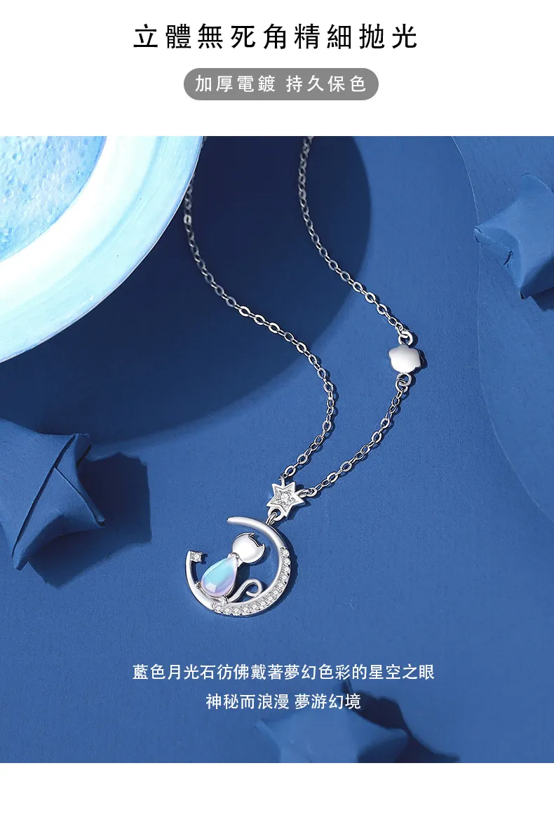 星月貓咪守護項鍊 | S925純銀鑲嵌月光石 | 3D立體精雕 | 鏡面拋光 | 高級送女生禮物星月夜色貓咪純銀項鍊