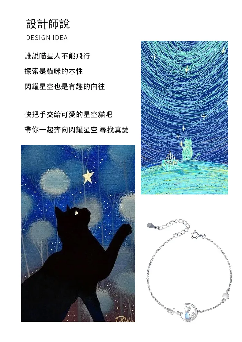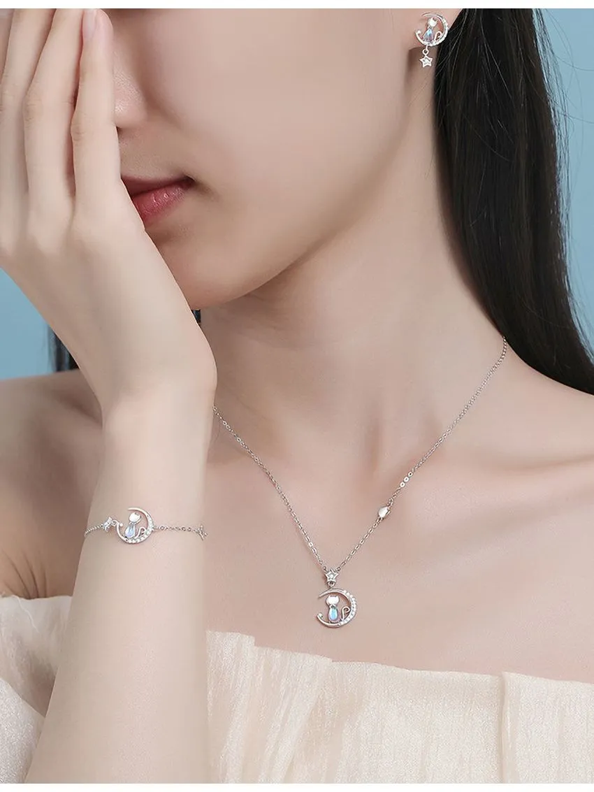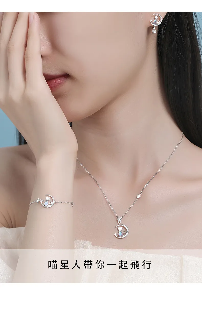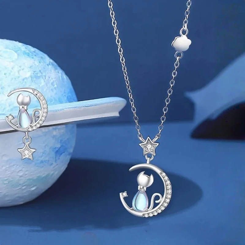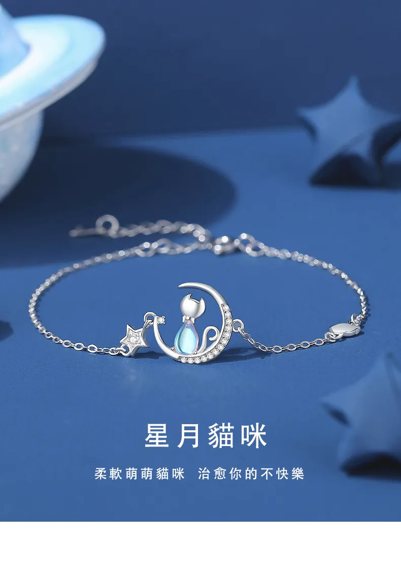 星月貓咪守護項鍊 | S925純銀鑲嵌月光石 | 3D立體精雕 | 鏡面拋光 | 高級送女生禮物星月夜色貓咪純銀項鍊