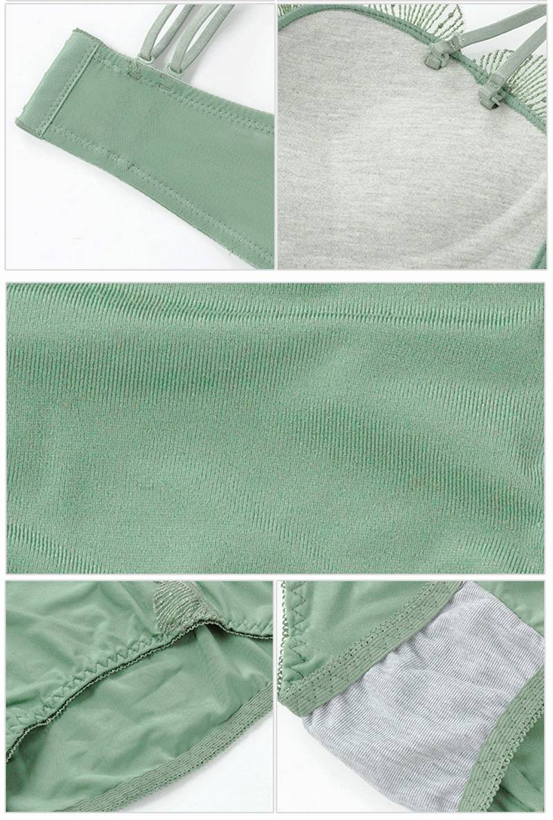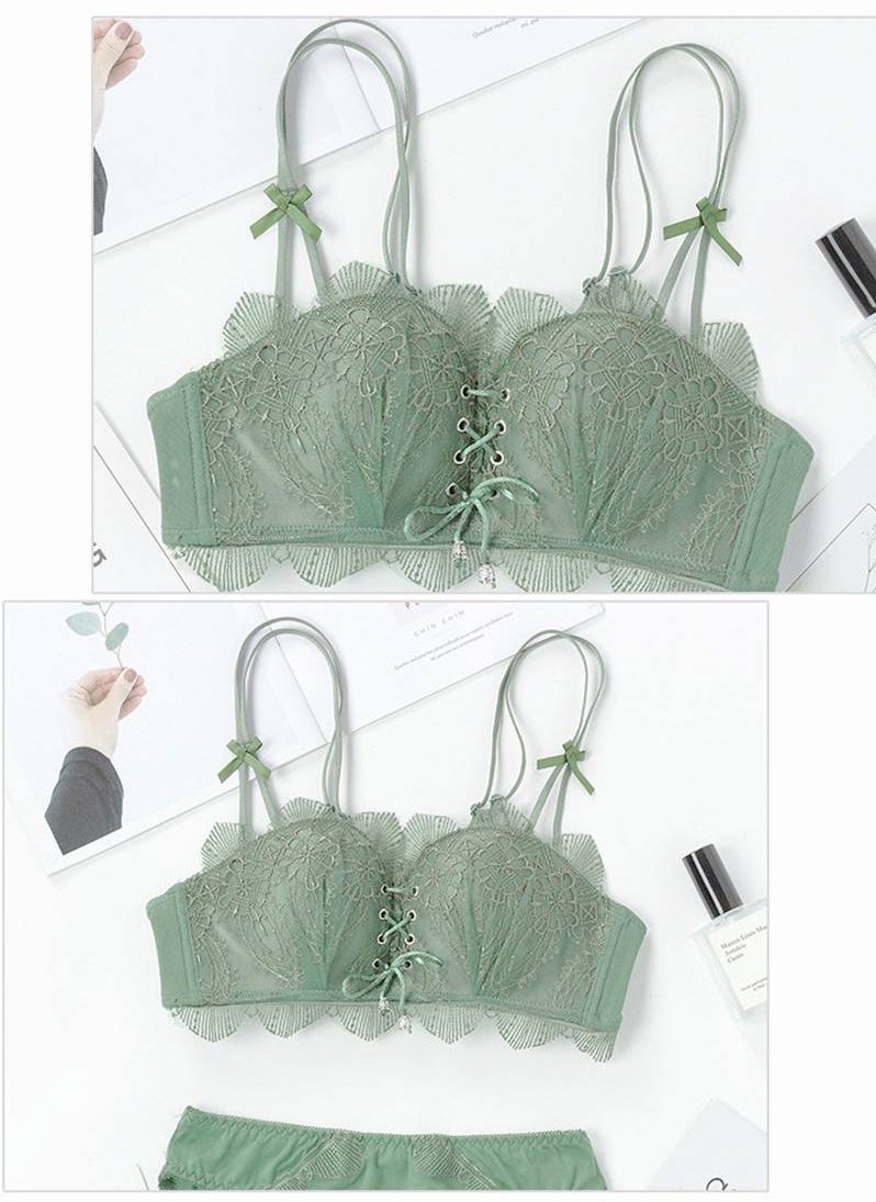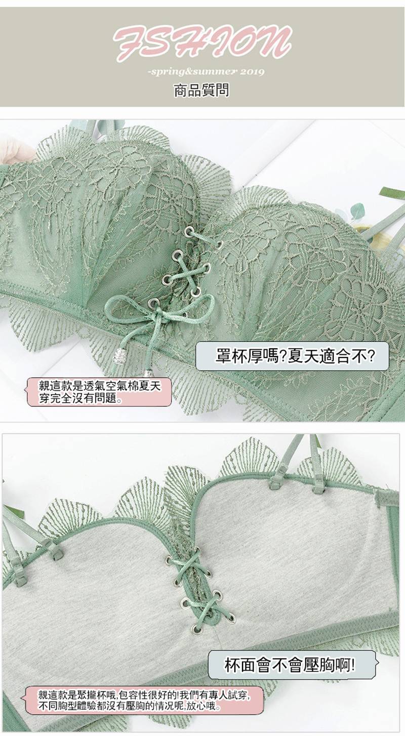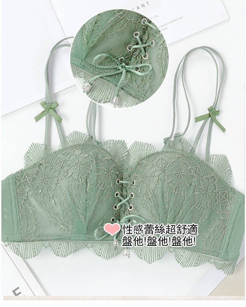 【上托超顯聚攏內衣褲組】【清新樹葉蕾絲】【無鋼圈舒適罩杯】日系文藝綠色樹葉蕾絲超聚攏上托無鋼圈內衣褲組