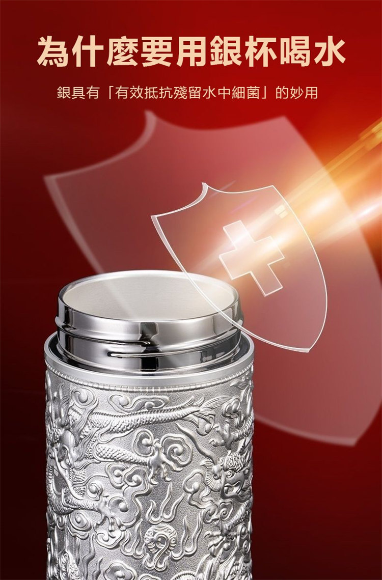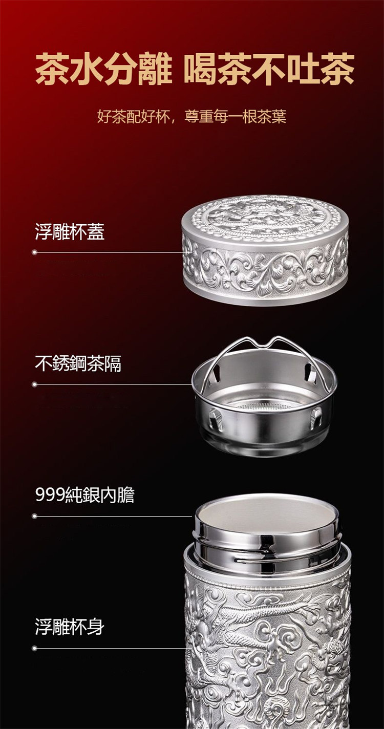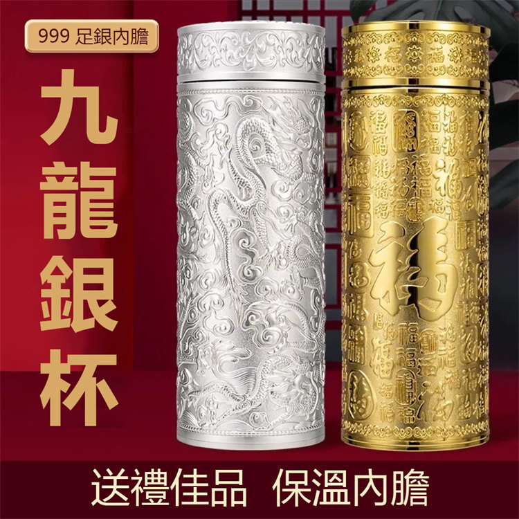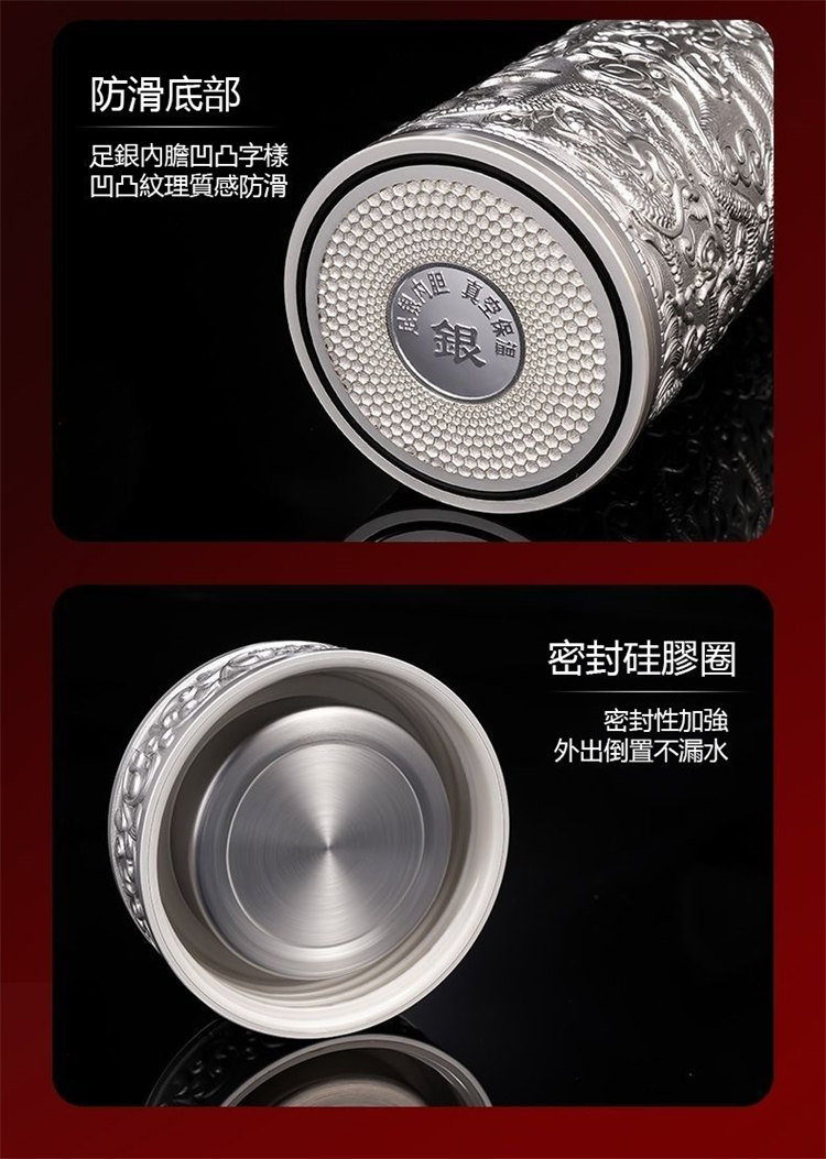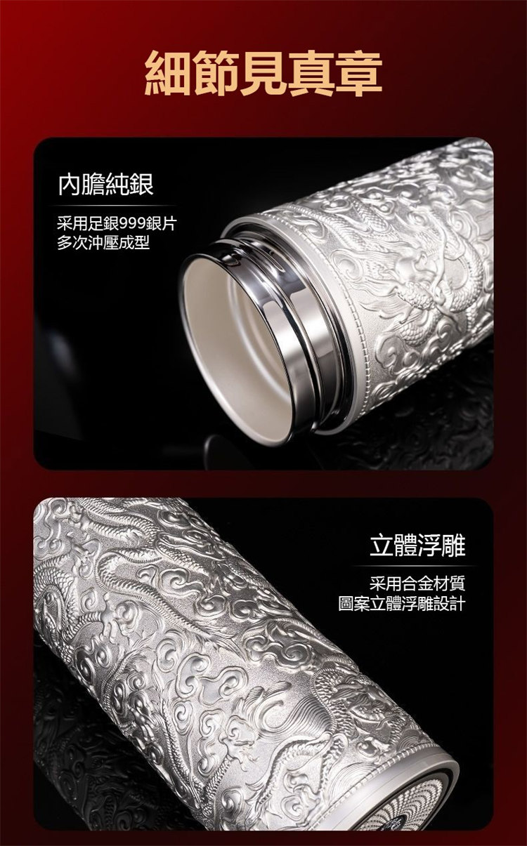 999足銀內膽保溫杯 | 銀離子抗菌內膽 | 立體浮雕九龍杯身 | 超好寓意九龍百福足銀內膽抗菌茶水分離真空保溫杯
