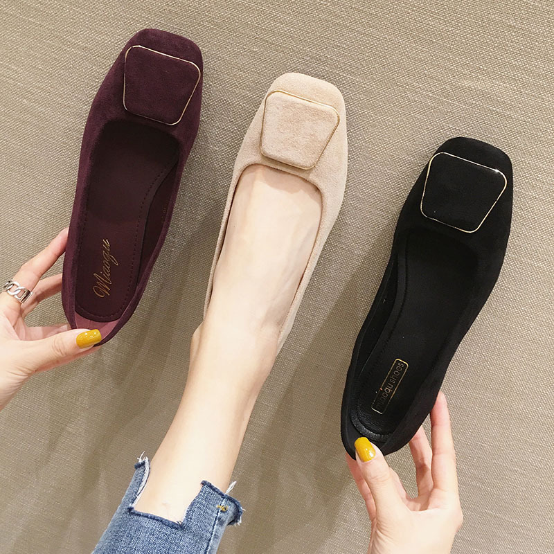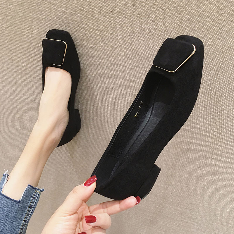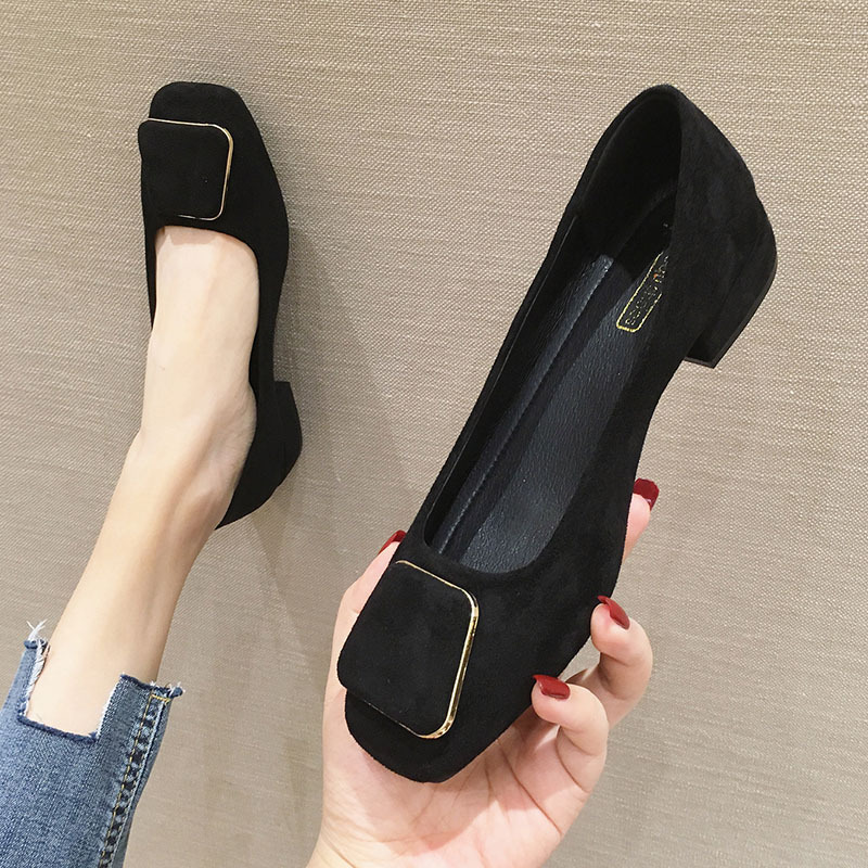 正韓版型時尚純色絨面皮粗跟工作鞋新款久站不累職業平底單鞋女黑色跟鞋豆豆鞋