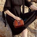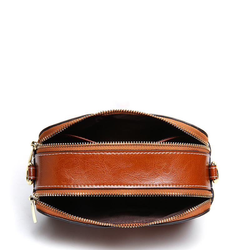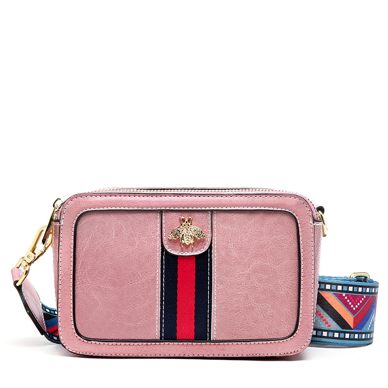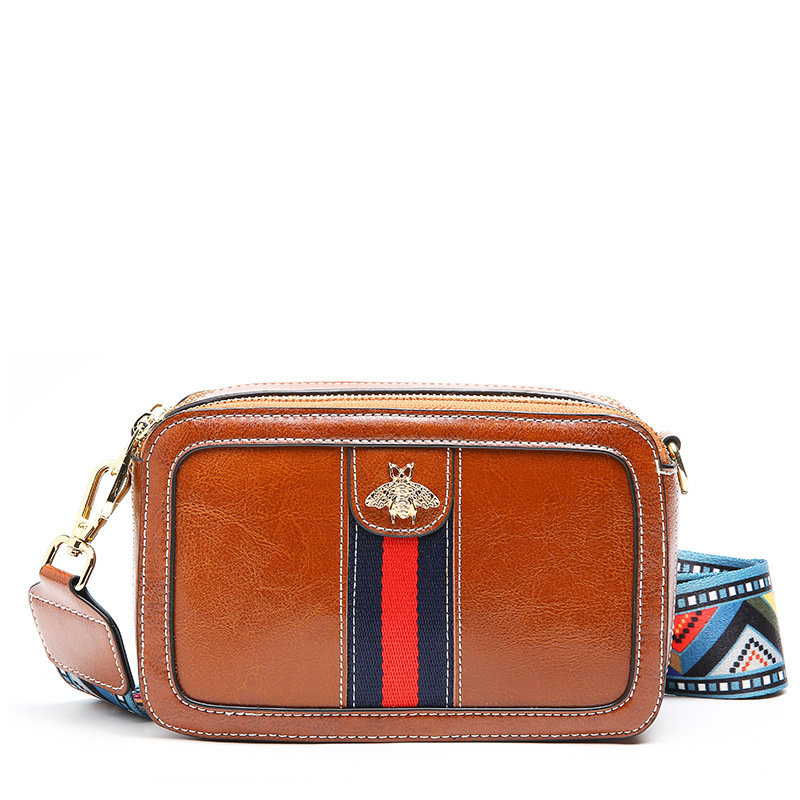 正韓版型高檔棕色油蠟牛皮叫寬肩帶條紋蜜蜂小方包真皮女包側背斜背包
