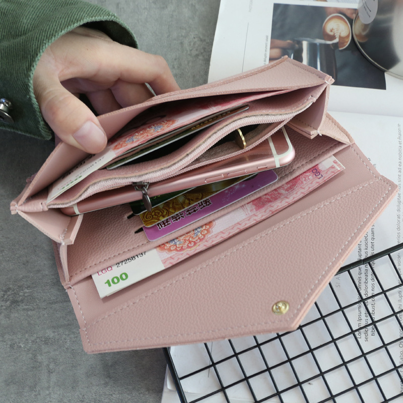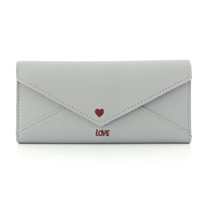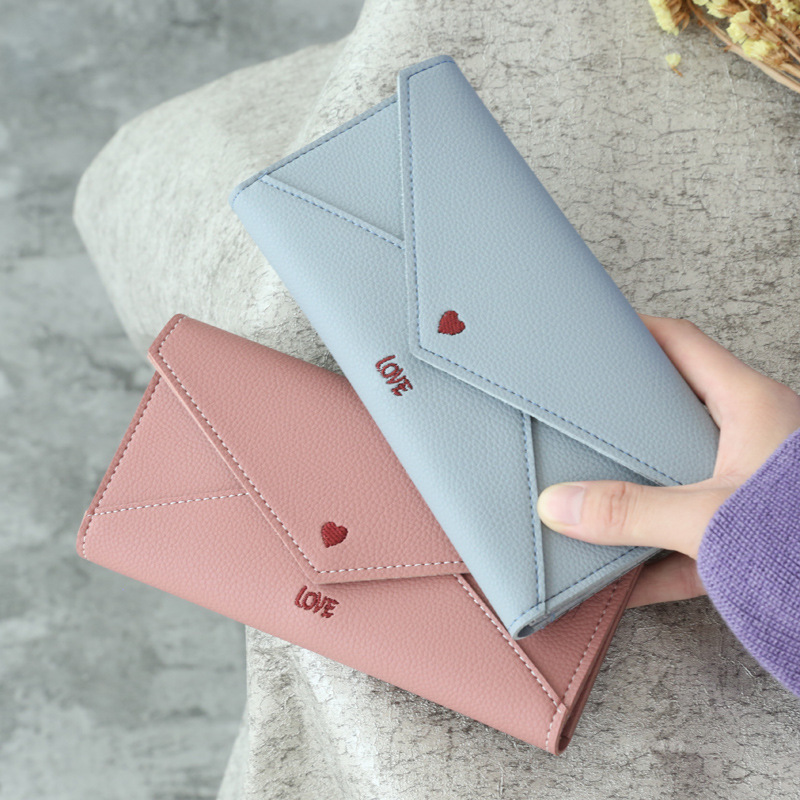 【荔枝紋刺繡愛心長夾】【多功能大容量】正韓設計深粉純色氣質百搭愛心字母刺繡女信封錢包皮夾長夾