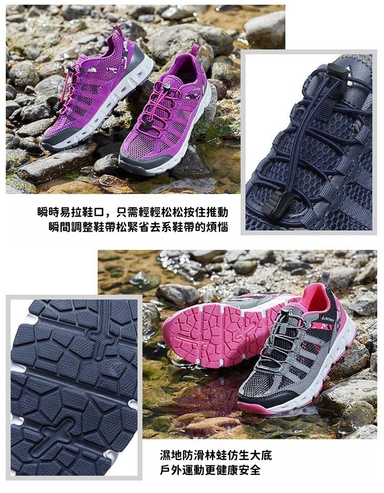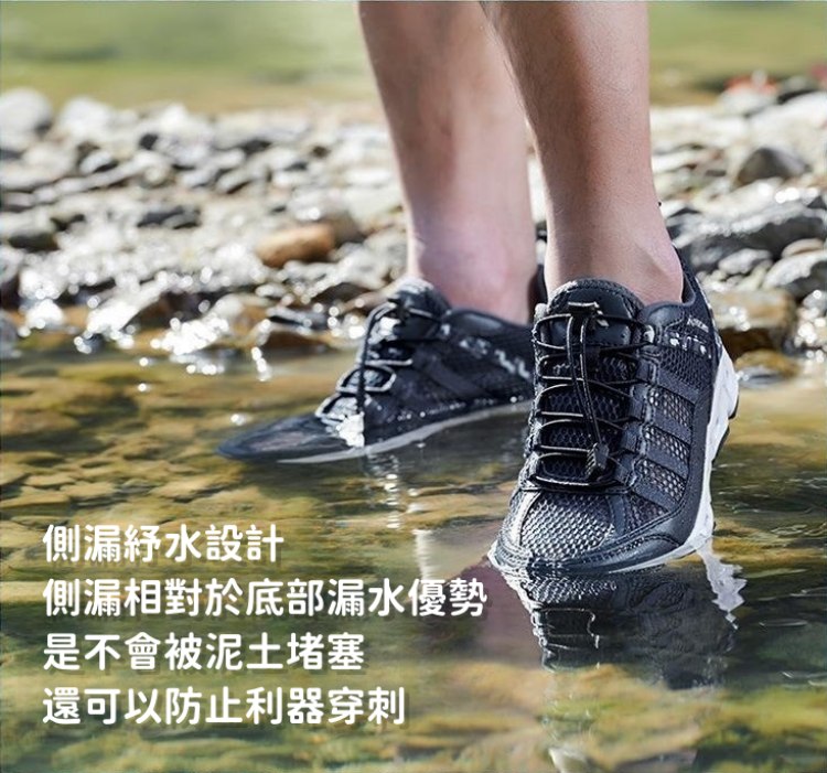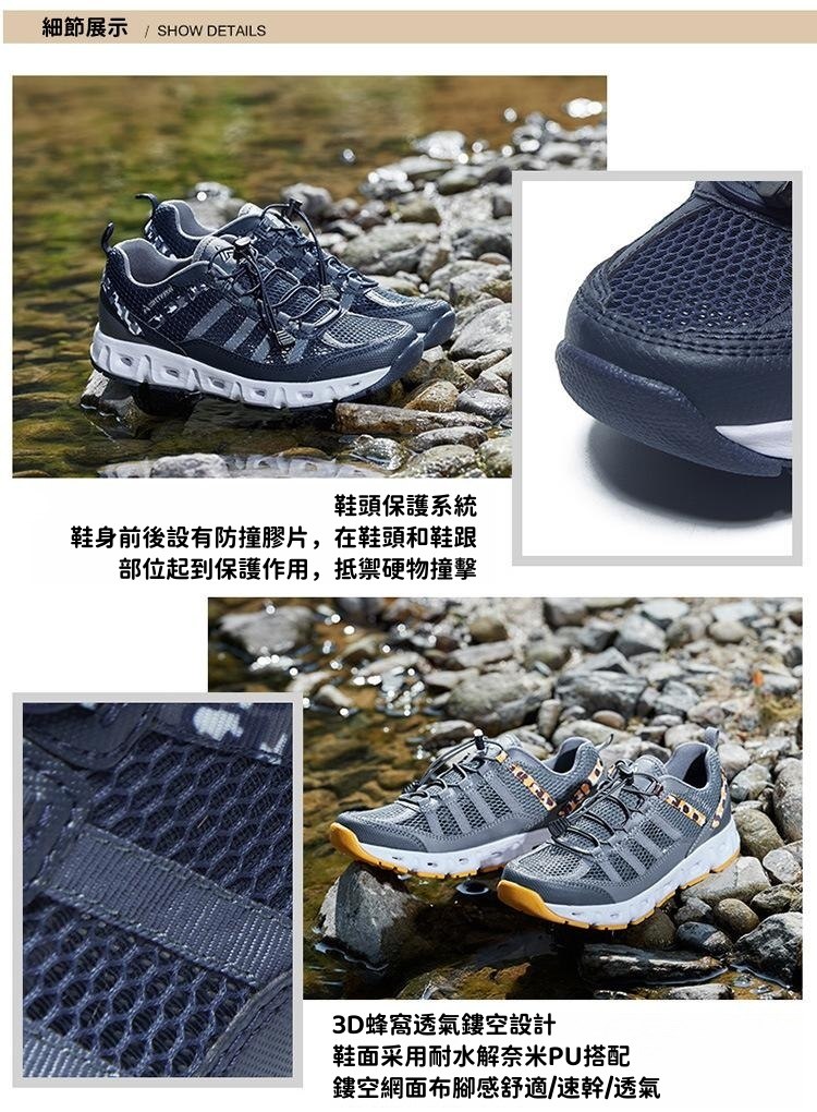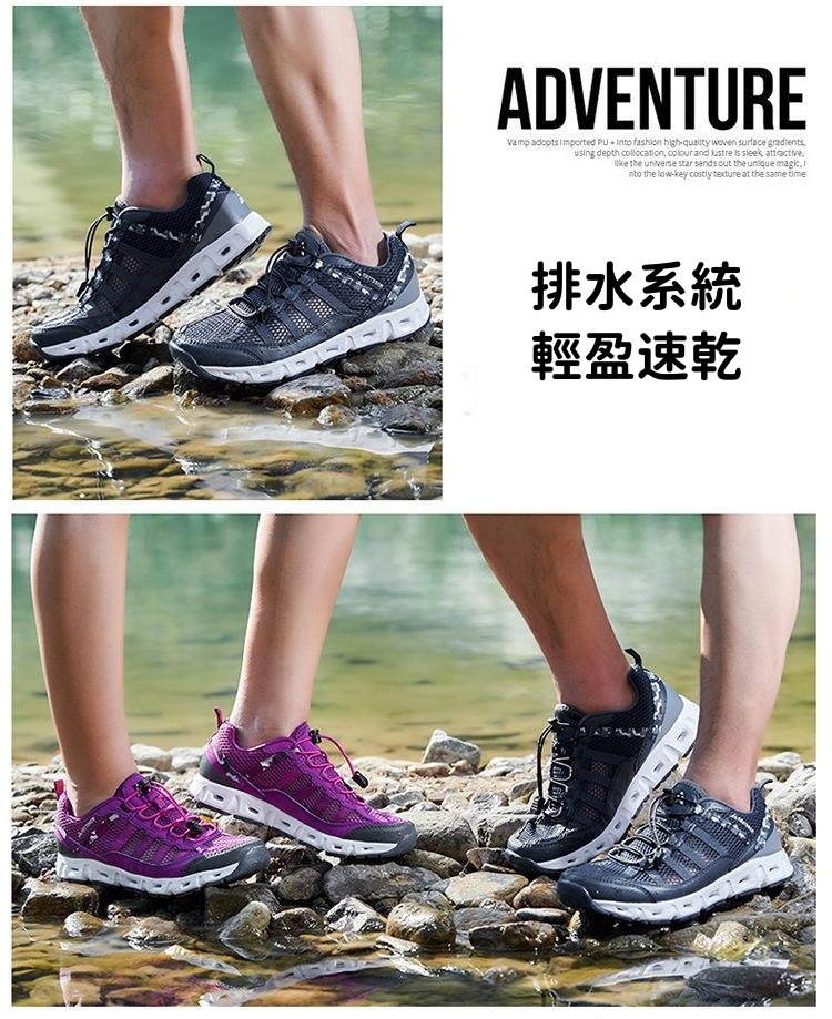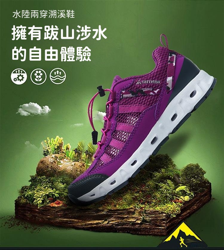 水陸兩穿肆意行走 | 側排水防堵系統 | 防撞鞋頭 | 耐水解奈米透氣鞋面 | 瞬時易拉鞋口 | 濕地防滑仿生大底 | SHITRRON進階男女戶外徒步溯溪鞋