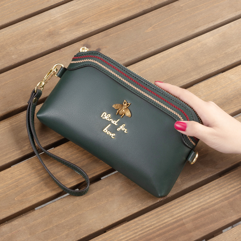 【真皮復古收納斜背包】高檔牛皮真皮黑色純色車縫線小蜜蜂裝飾氣質女手拿包斜背包
