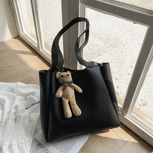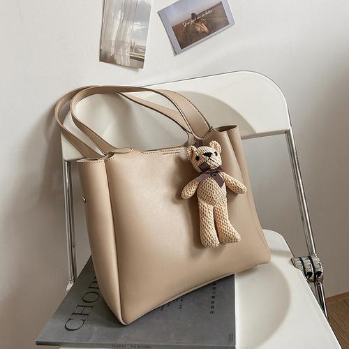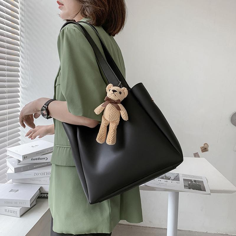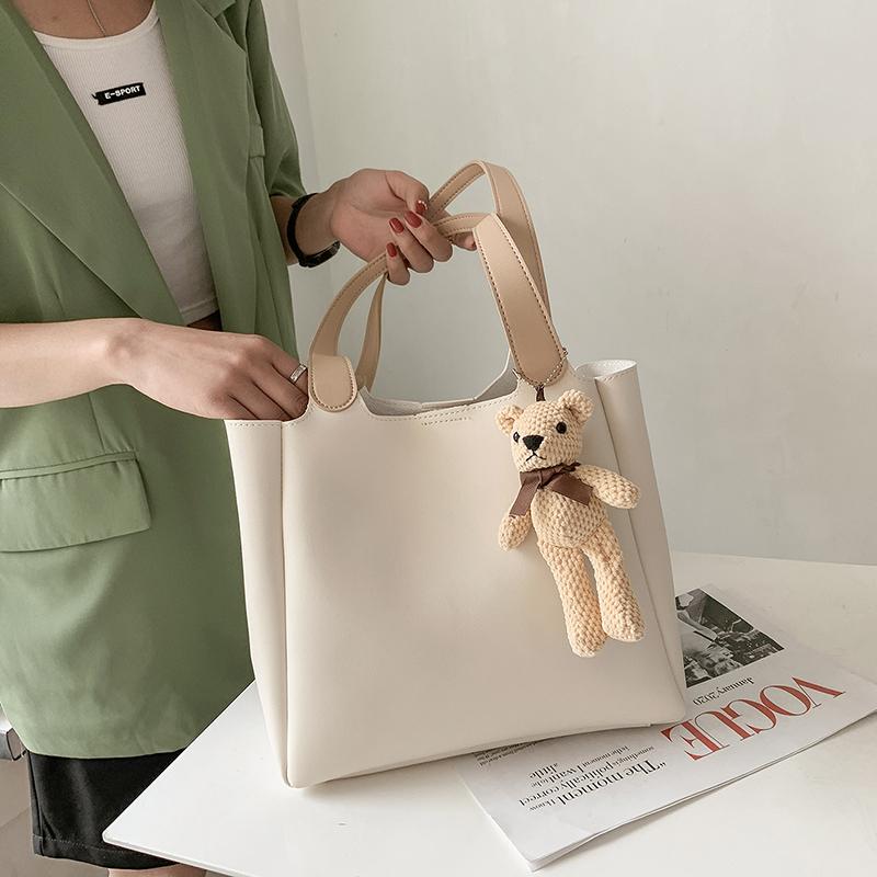 簡約隨性高級感純色復古大容量女手提側背托特包限時送手工小熊掛飾