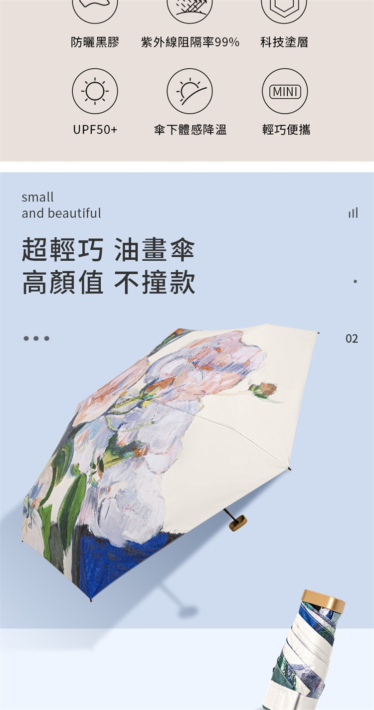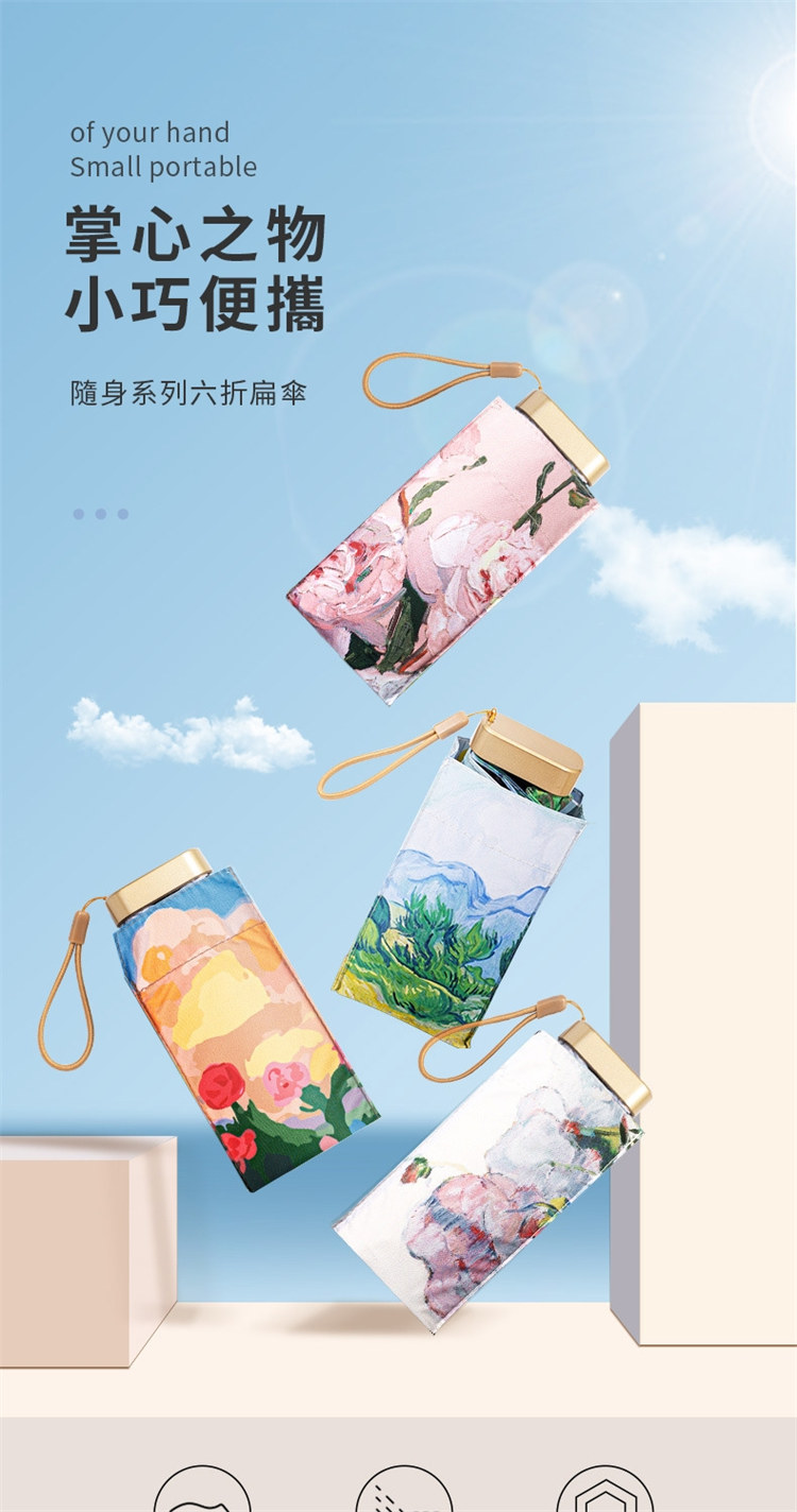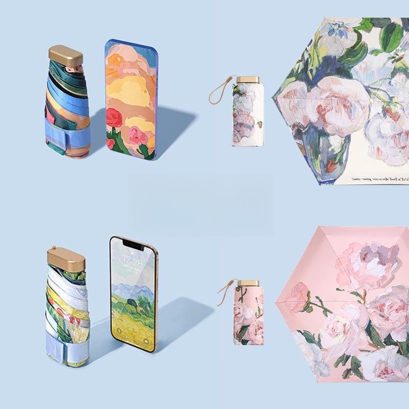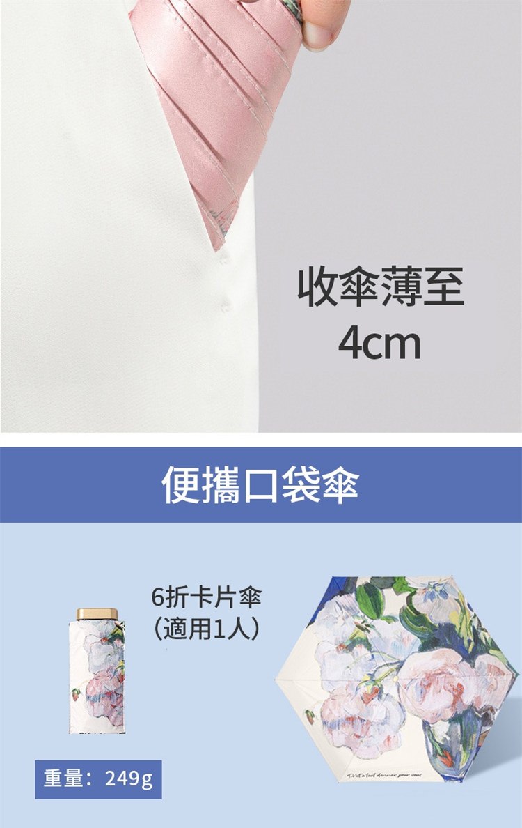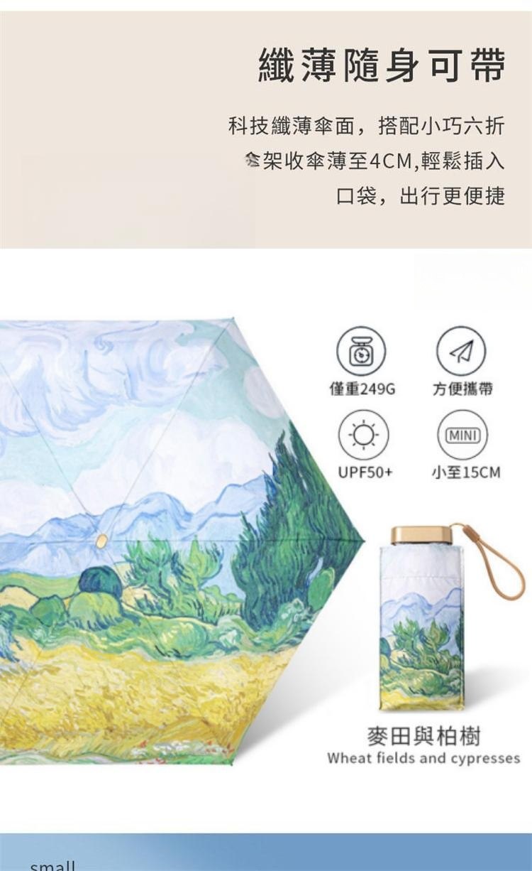 UPF50+迷你超輕六折卡片口袋傘 | 超美油畫手繪傘面 | 99%紫外線阻隔 | 超輕無感隨身便攜 | 晴雨兩用高顏值不撞傘超輕黑膠陽傘折疊傘