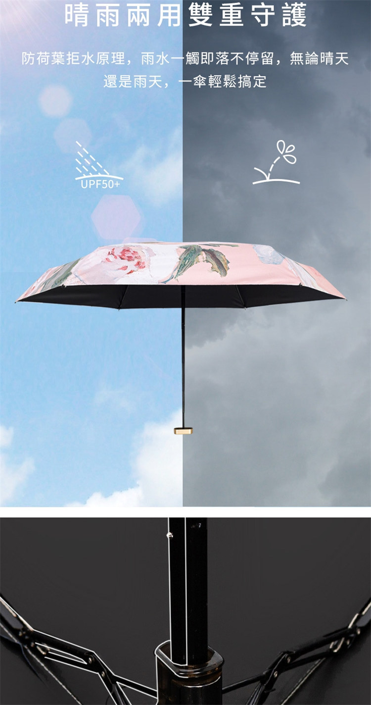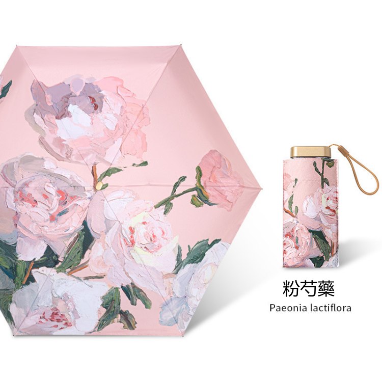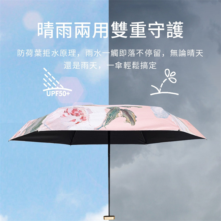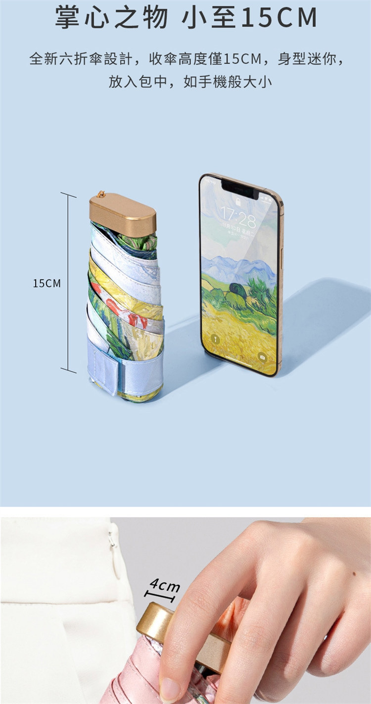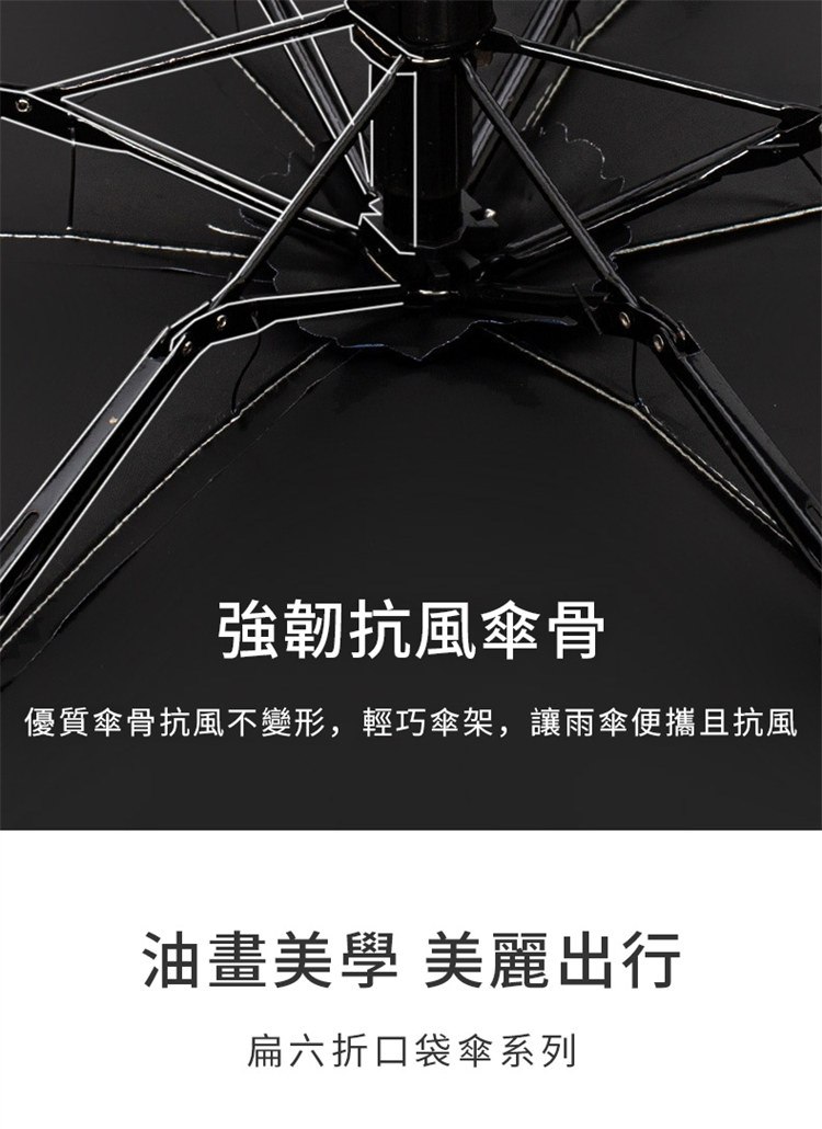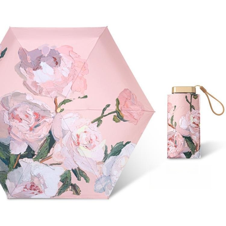 UPF50+迷你超輕六折卡片口袋傘 | 超美油畫手繪傘面 | 99%紫外線阻隔 | 超輕無感隨身便攜 | 晴雨兩用高顏值不撞傘超輕黑膠陽傘折疊傘