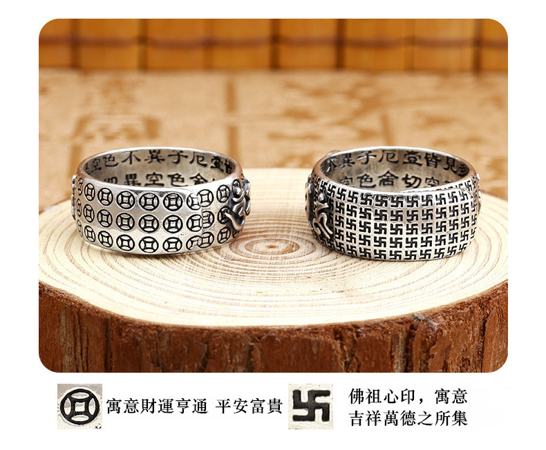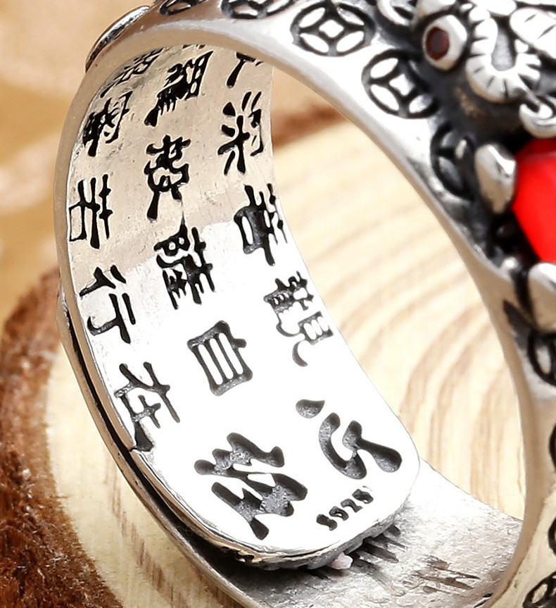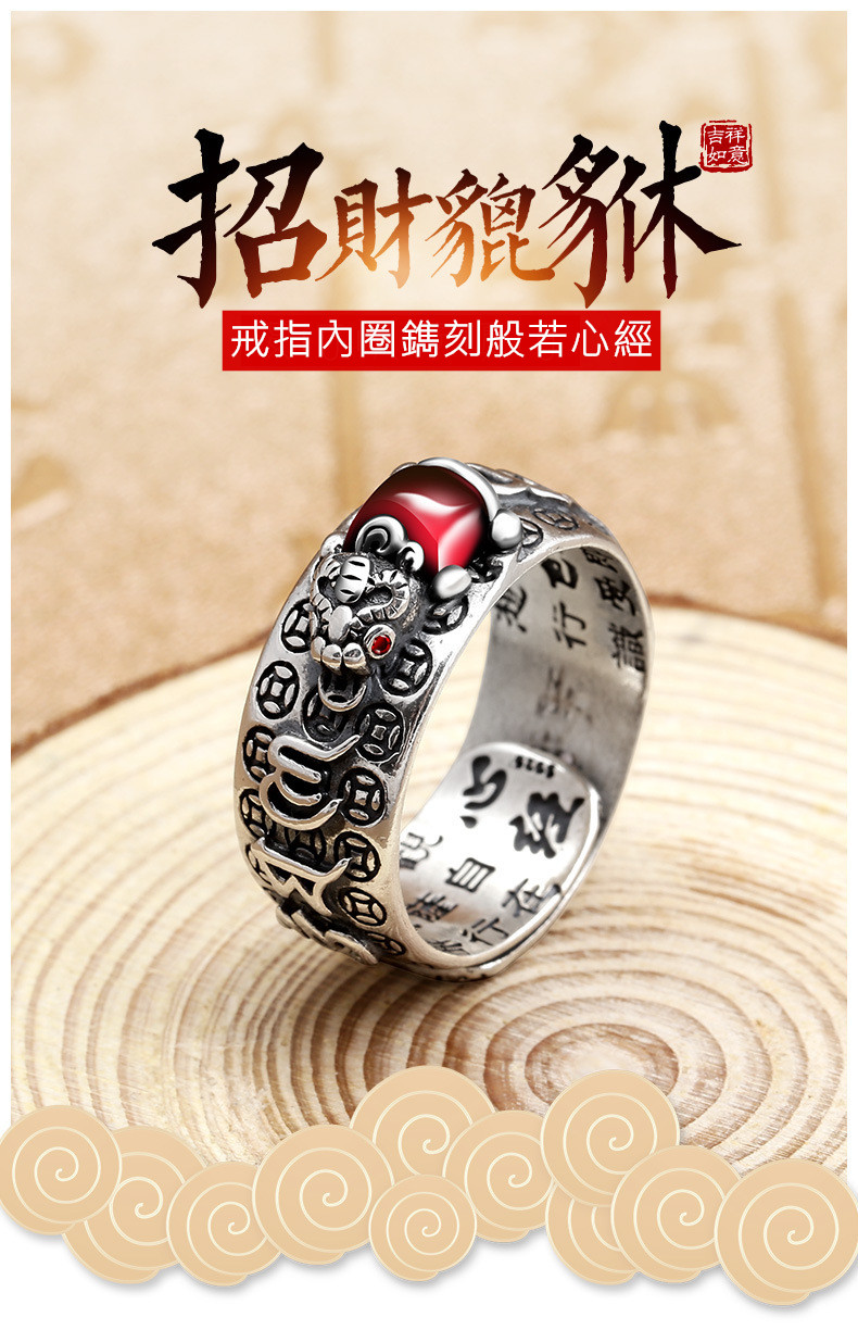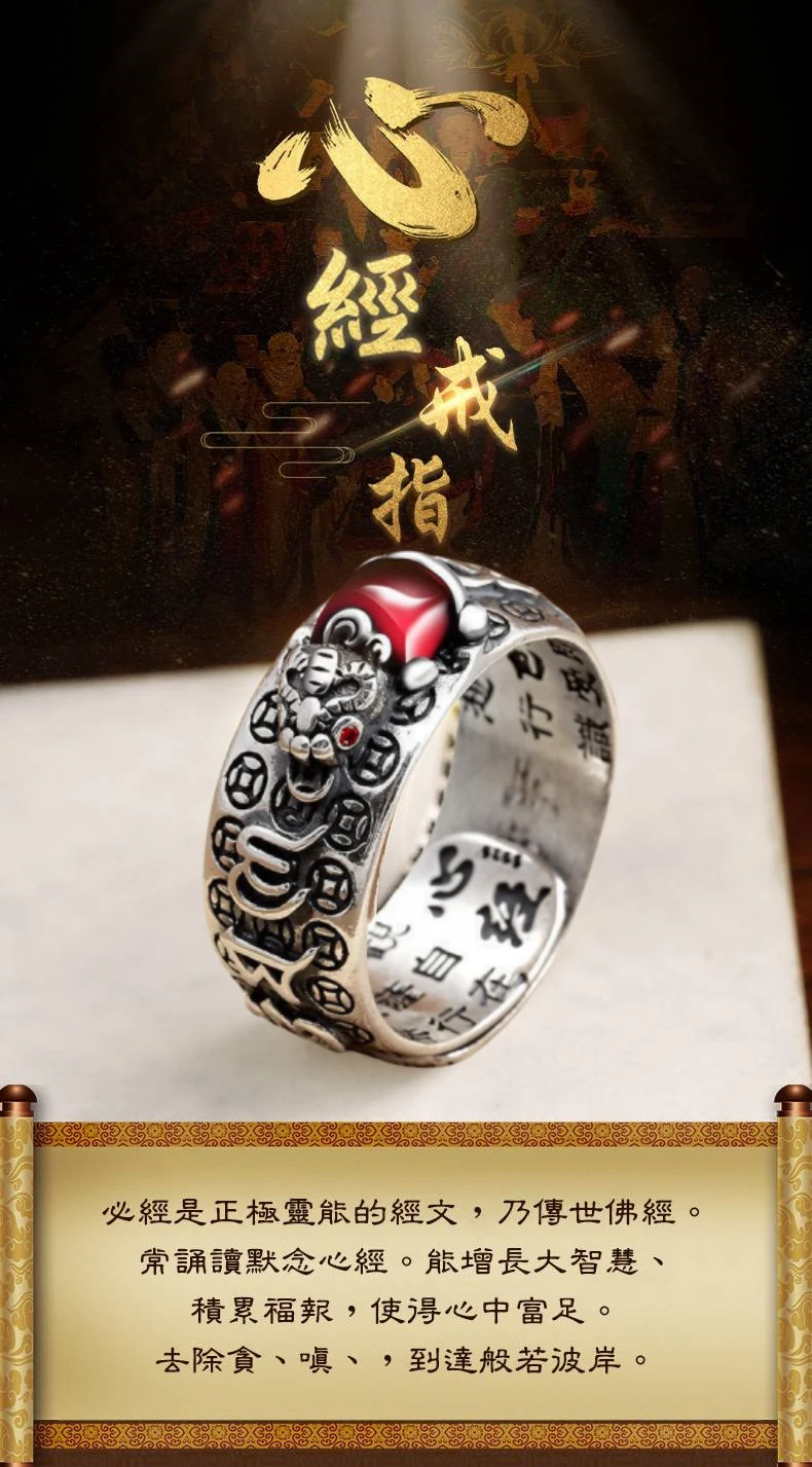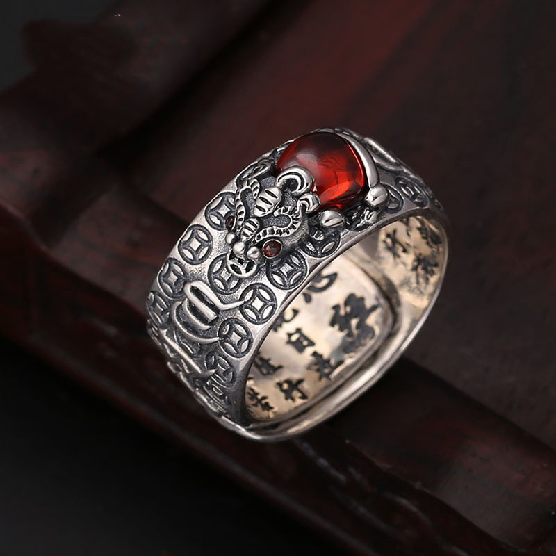 聚財納福 | 心經加持 | 石榴石鑲嵌招財貔貅戒指 | 內圈手雕護佑心經 | 外圈護身六字真言 | 2025貔貅心經六字真言男女招財貔貅戒指