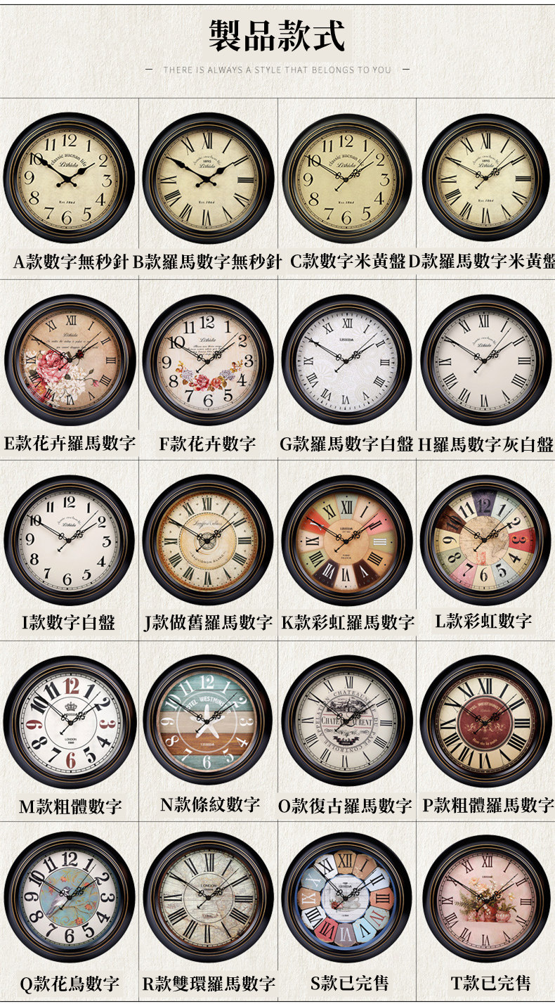 | 款式 | A款數字無秒針, B款羅馬數字無秒針, C款數字米黃盤, D款羅馬數字米黃盤, E款花卉羅馬數字, F款花卉數字, G款羅馬數字白盤, H款羅馬數字灰白盤, I款數字白盤, J款做舊羅馬數字, K款彩虹羅馬數字, M款粗體數字, N款條紋數字, P款粗體羅馬數字, R款雙環羅馬數字 |