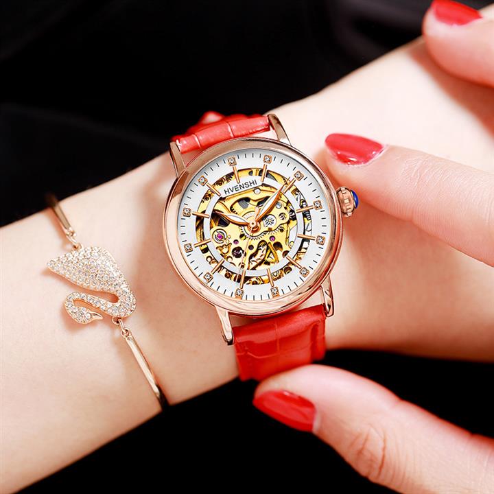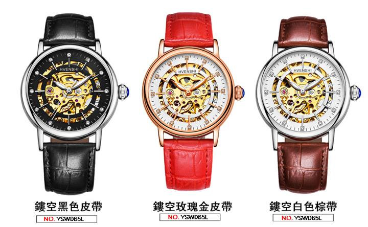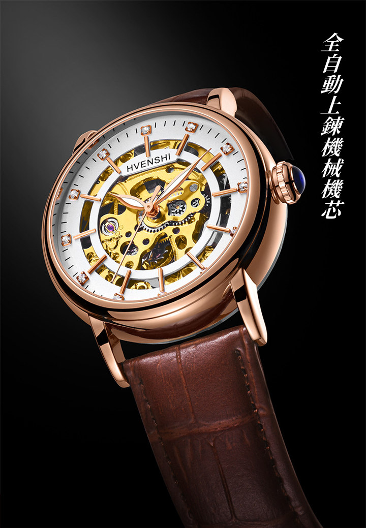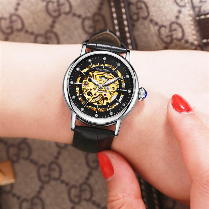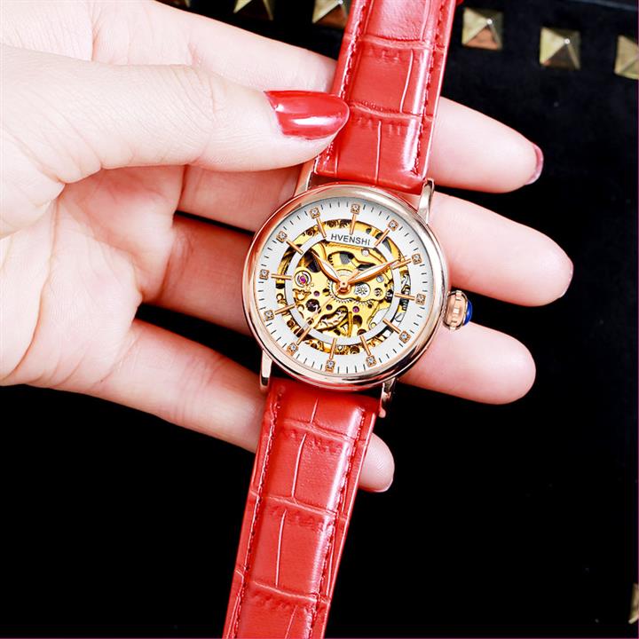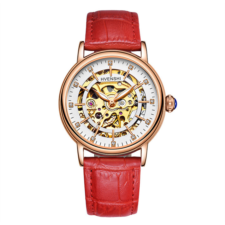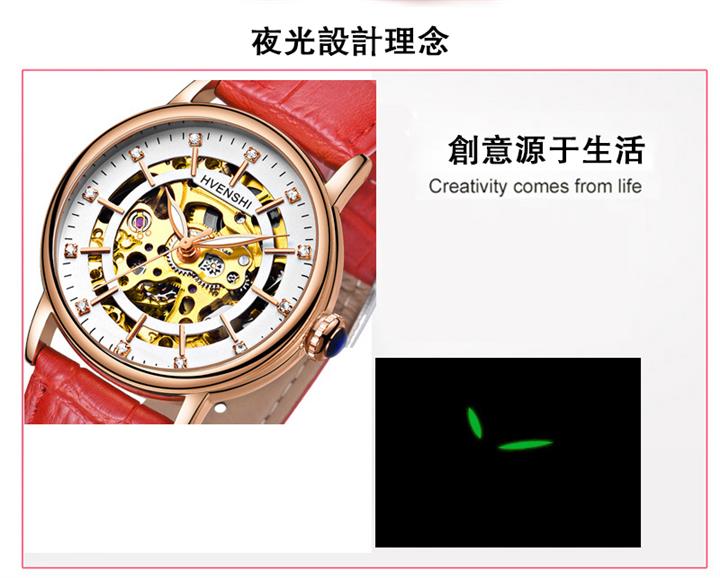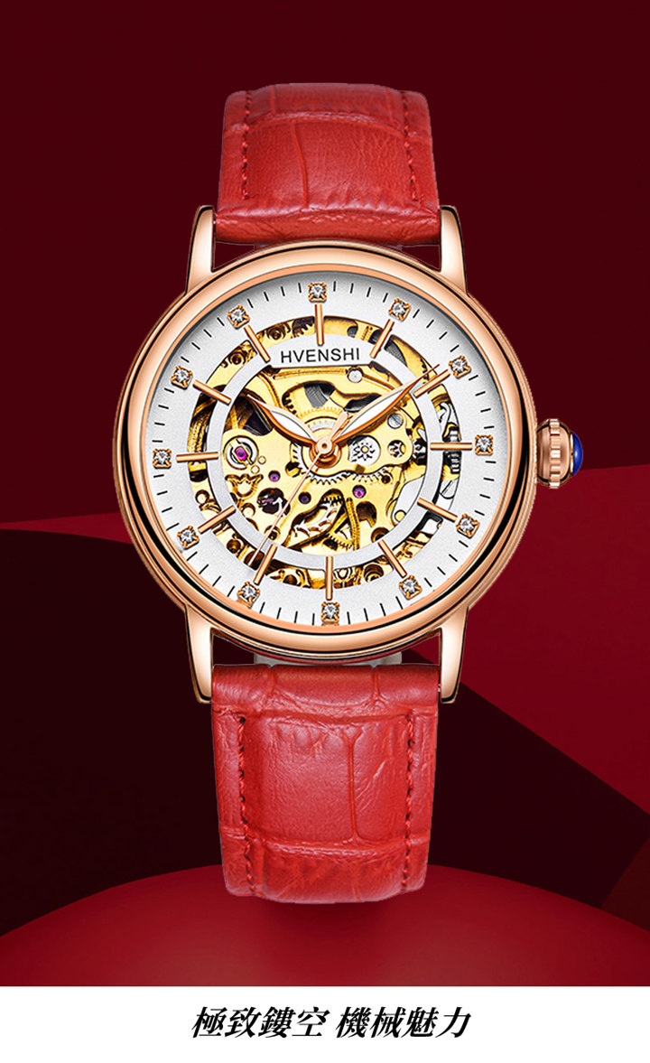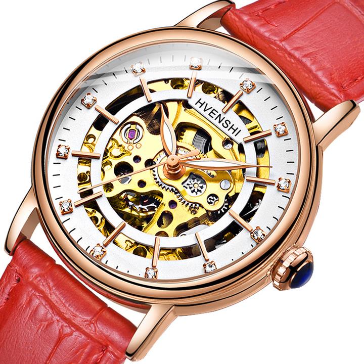 輕奢鏤空鑲鑽小圓錶 | 全自動機械機芯 | 紅寶石錶冠 | 小牛皮錶帶 | 強化礦物玻璃鏡面 | 30米防水 | 夜光指針 | HVENSHI女士全自動機械腕錶