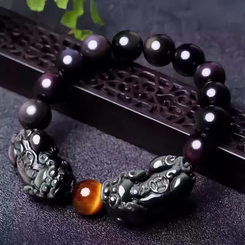 喜悅滿足 | 招財好運 | 天然雙霸王貔貅手鍊 | 冰島彩虹黑曜石 | 大師手作精雕 | 2025頂級大師手作雙霸王貔貅彩虹黑曜石招財手鍊