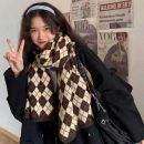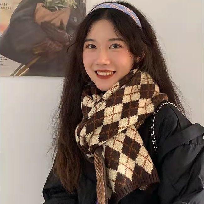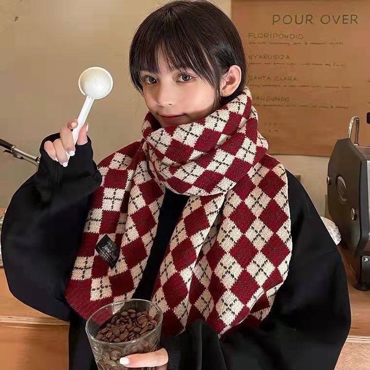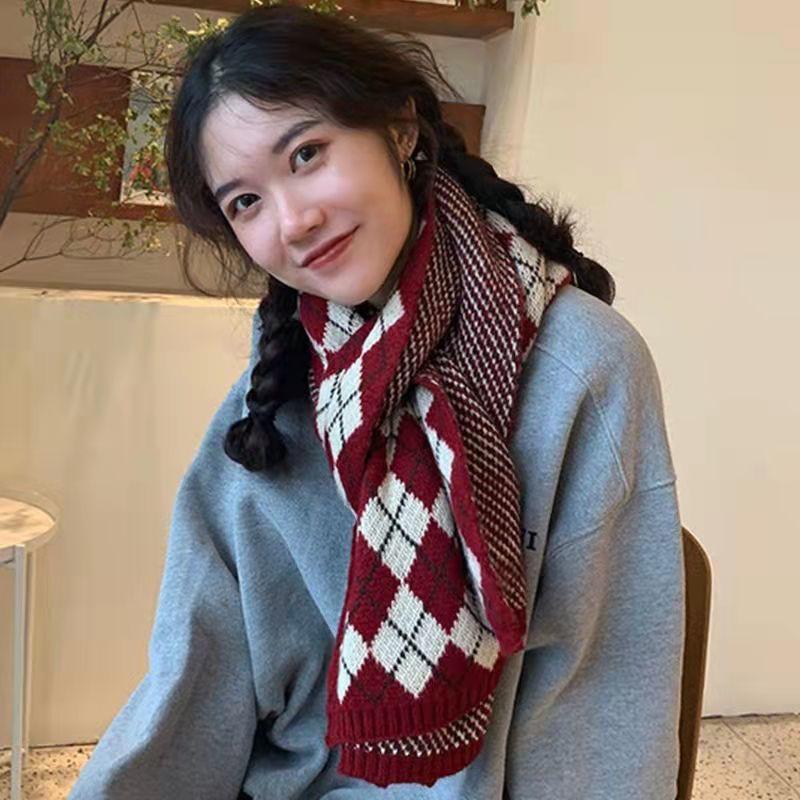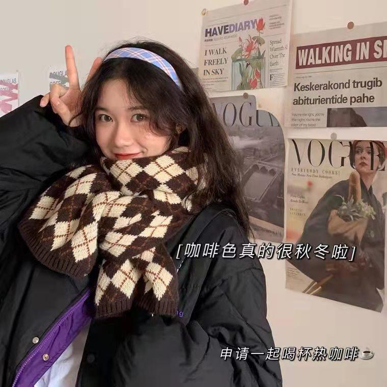 復古文藝菱形針織拼色IG風格軟糯毛線加厚圍巾女冬季英倫風針織保暖菱格韓版圍脖