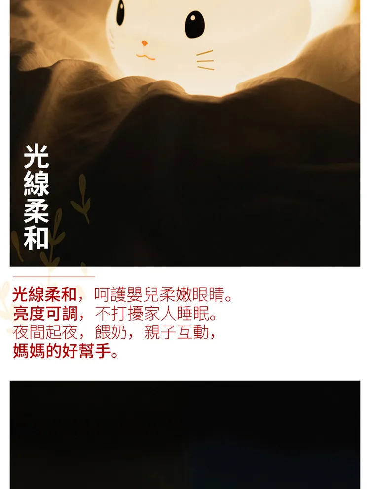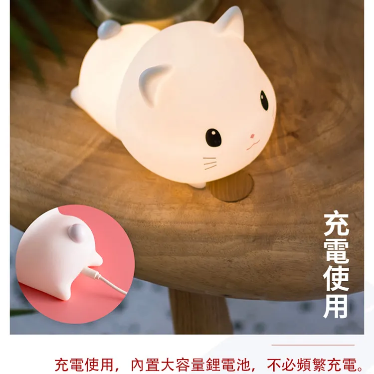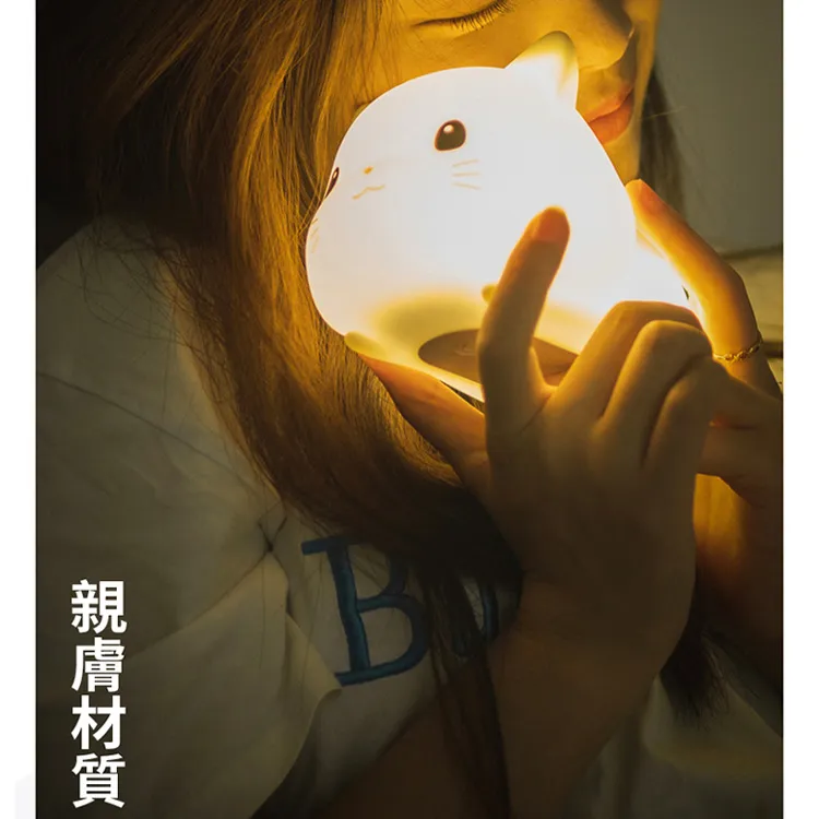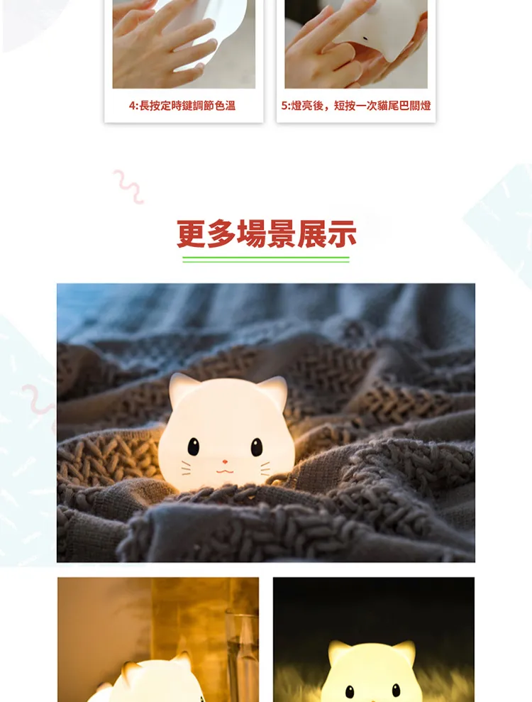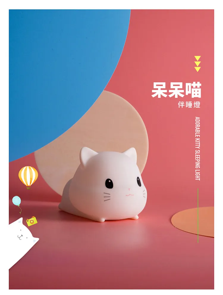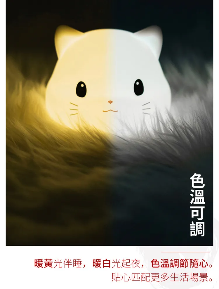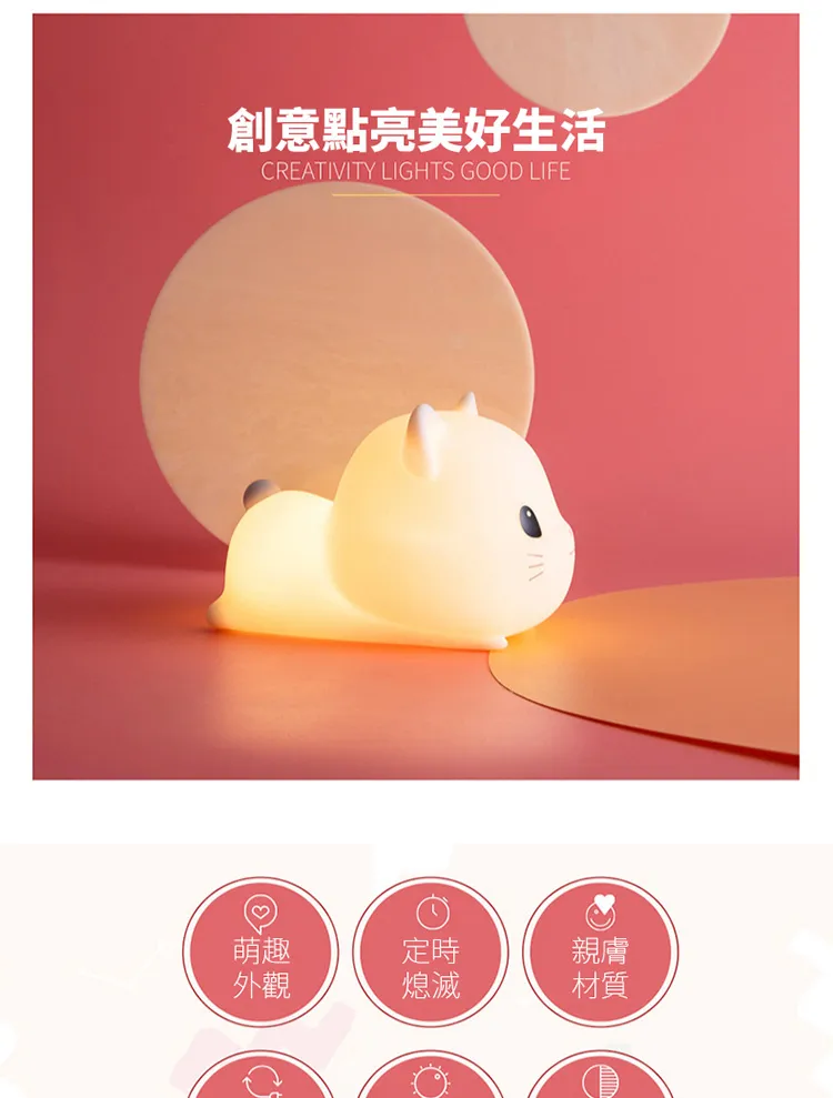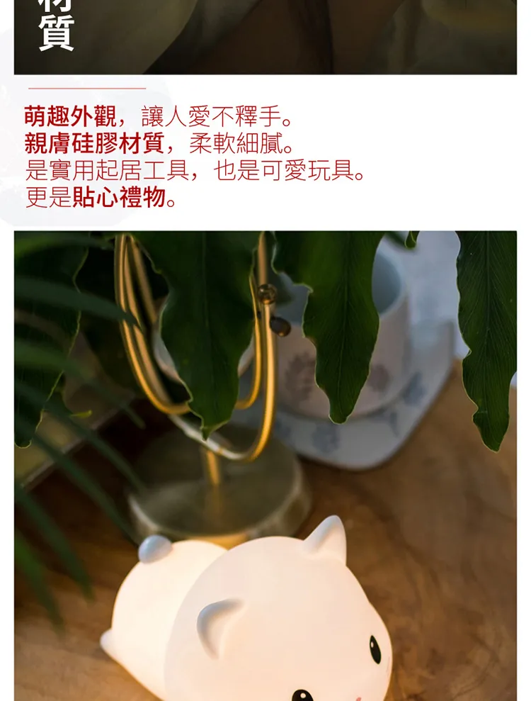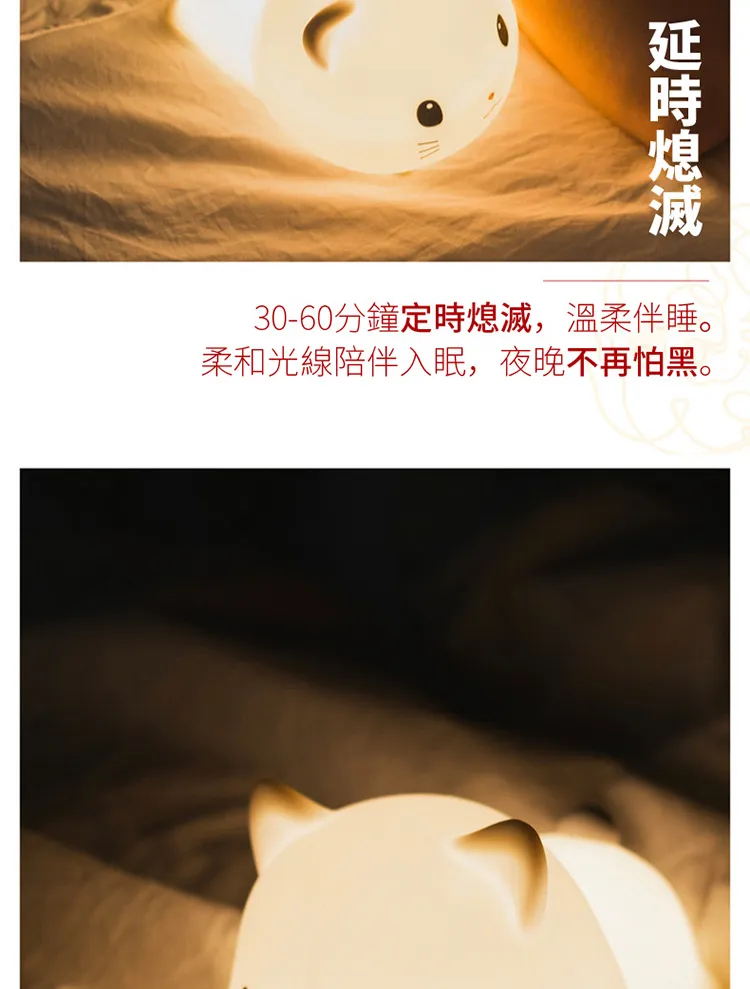 超萌可愛Q彈呆呆喵伴睡小夜燈 | 定時熄燈溫柔伴睡 | 亮度色溫輕鬆可調 | 親膚環保矽膠材質 | 超萌送女生禮物貓咪造型LED小夜燈