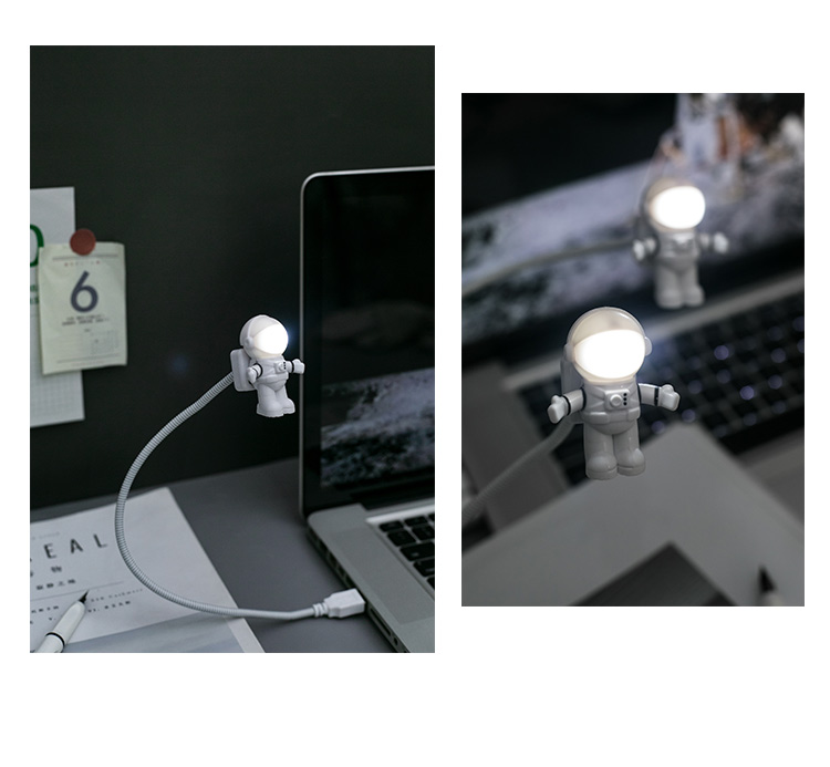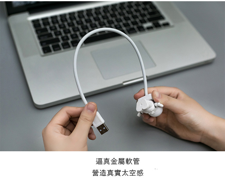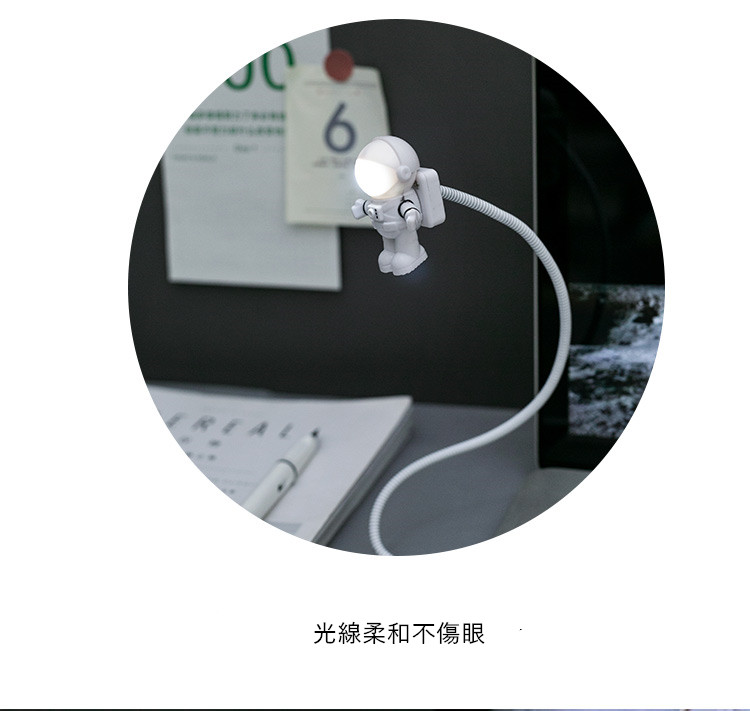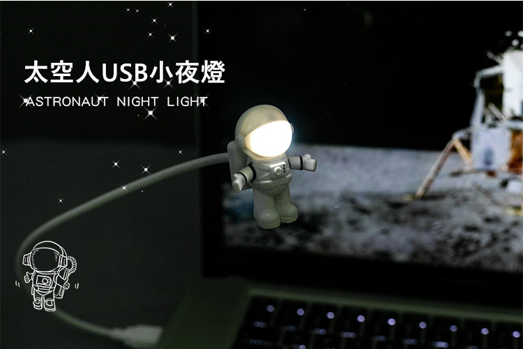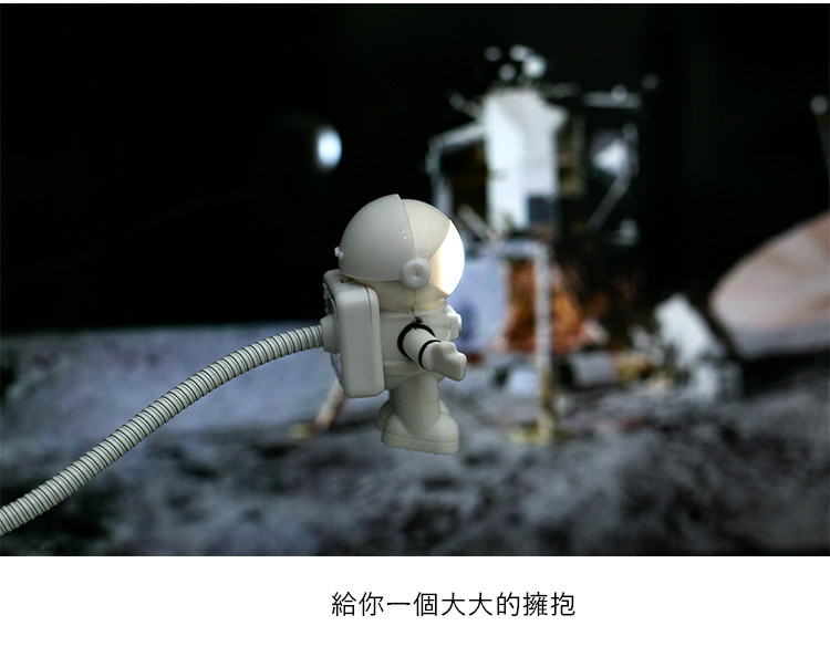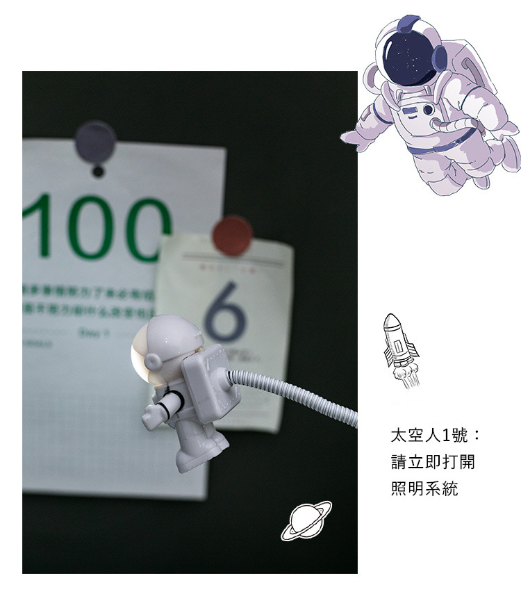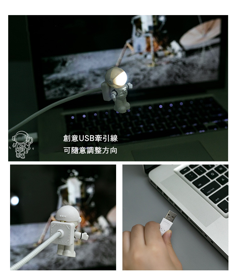 太空人造型小夜燈,可愛有趣又實用 節狀金屬USB軟管,可隨意扭動 LED燈源,光照柔和護眼 反轉頭盔可以開關燈光