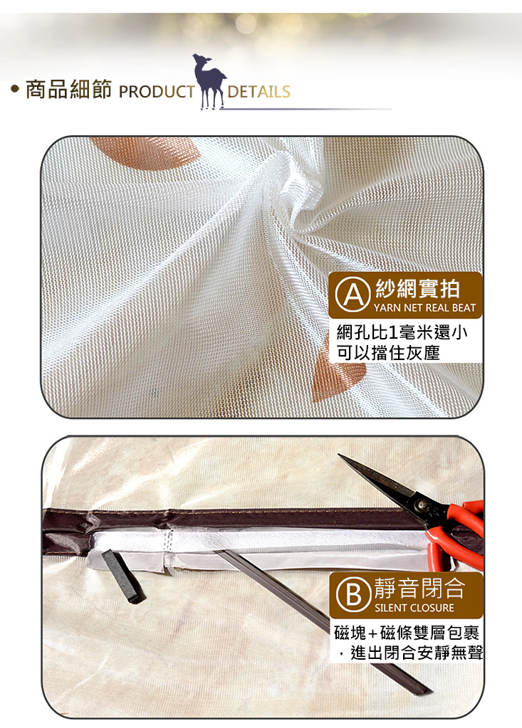 ? 磁條車縫在邊布內,外表無磁扣(一般企鵝扣或鳥扣閉合很吵,易壞)