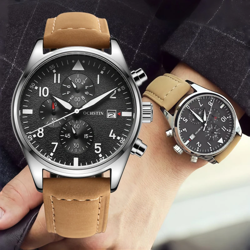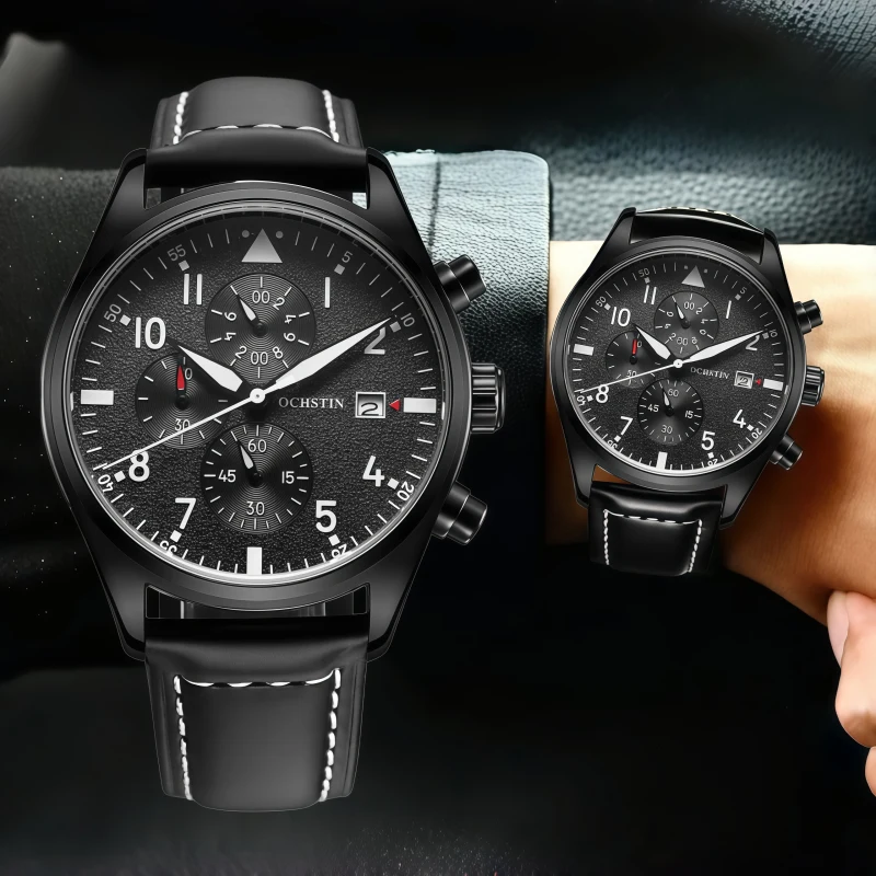 男錶・破曉巡航 | 六針計時錶盤 | 高級三眼機芯 | 跑秒計時 | 小牛皮帶 | 日曆視窗 | 30米防水 | OCHISTIN高檔三眼跑秒計時飛行員錶